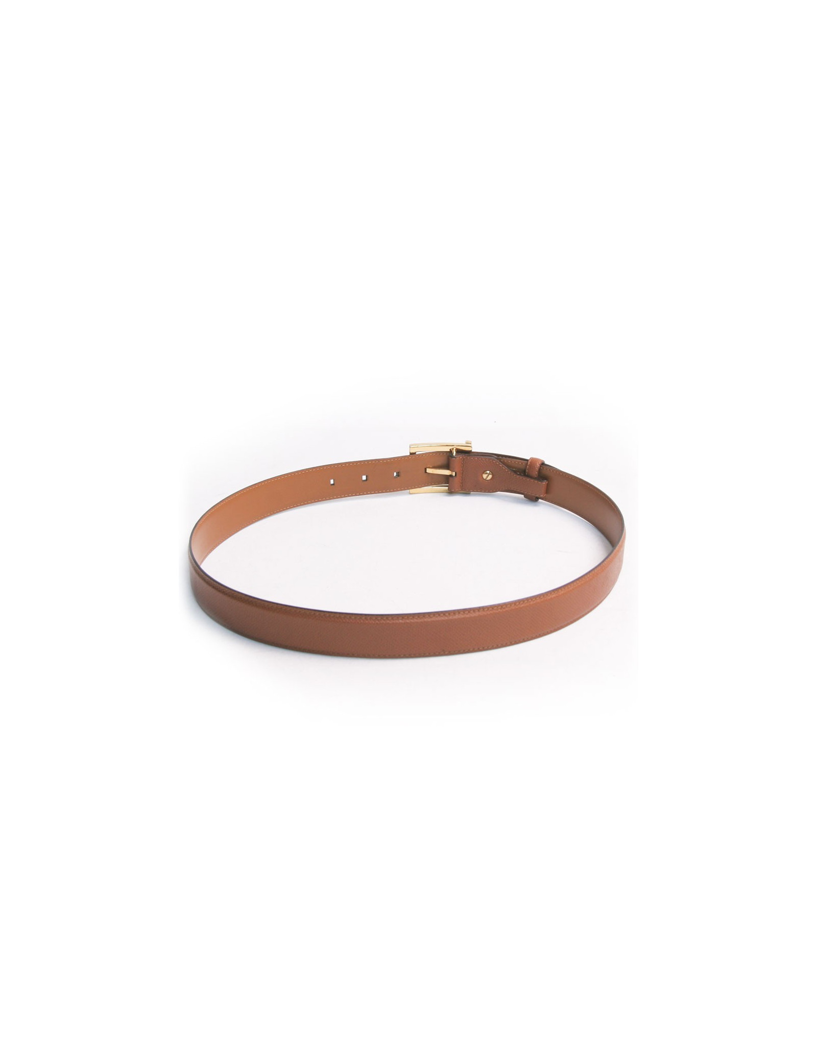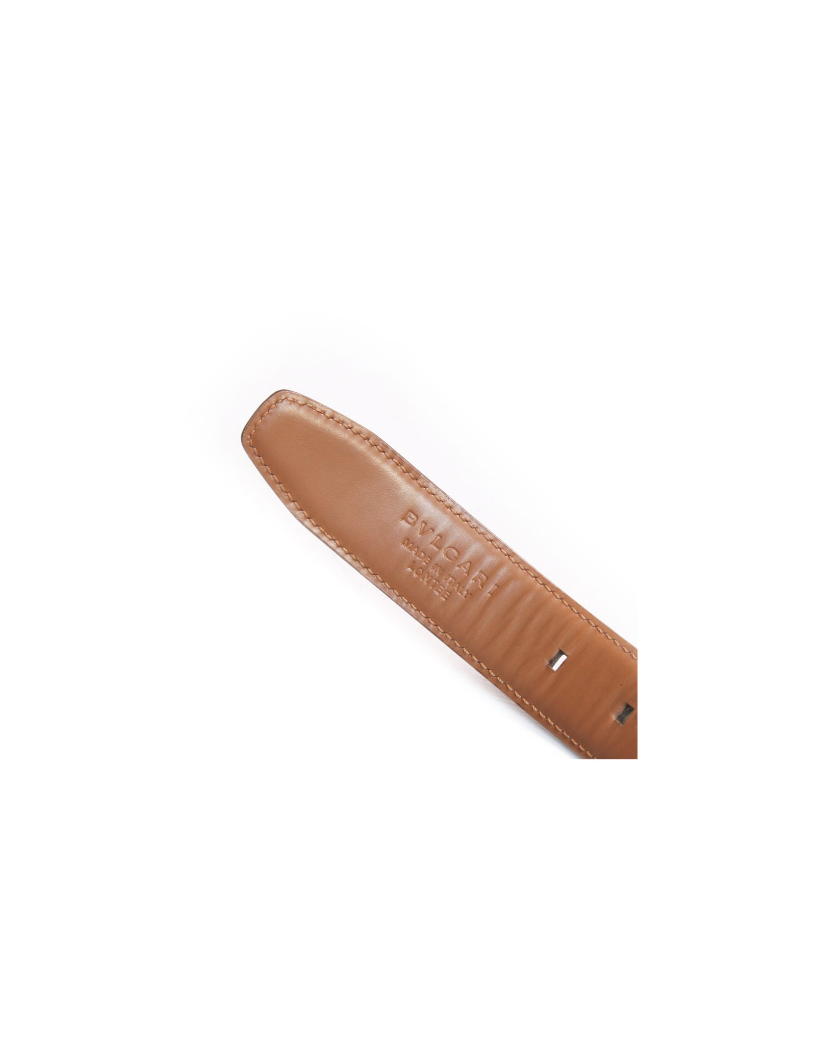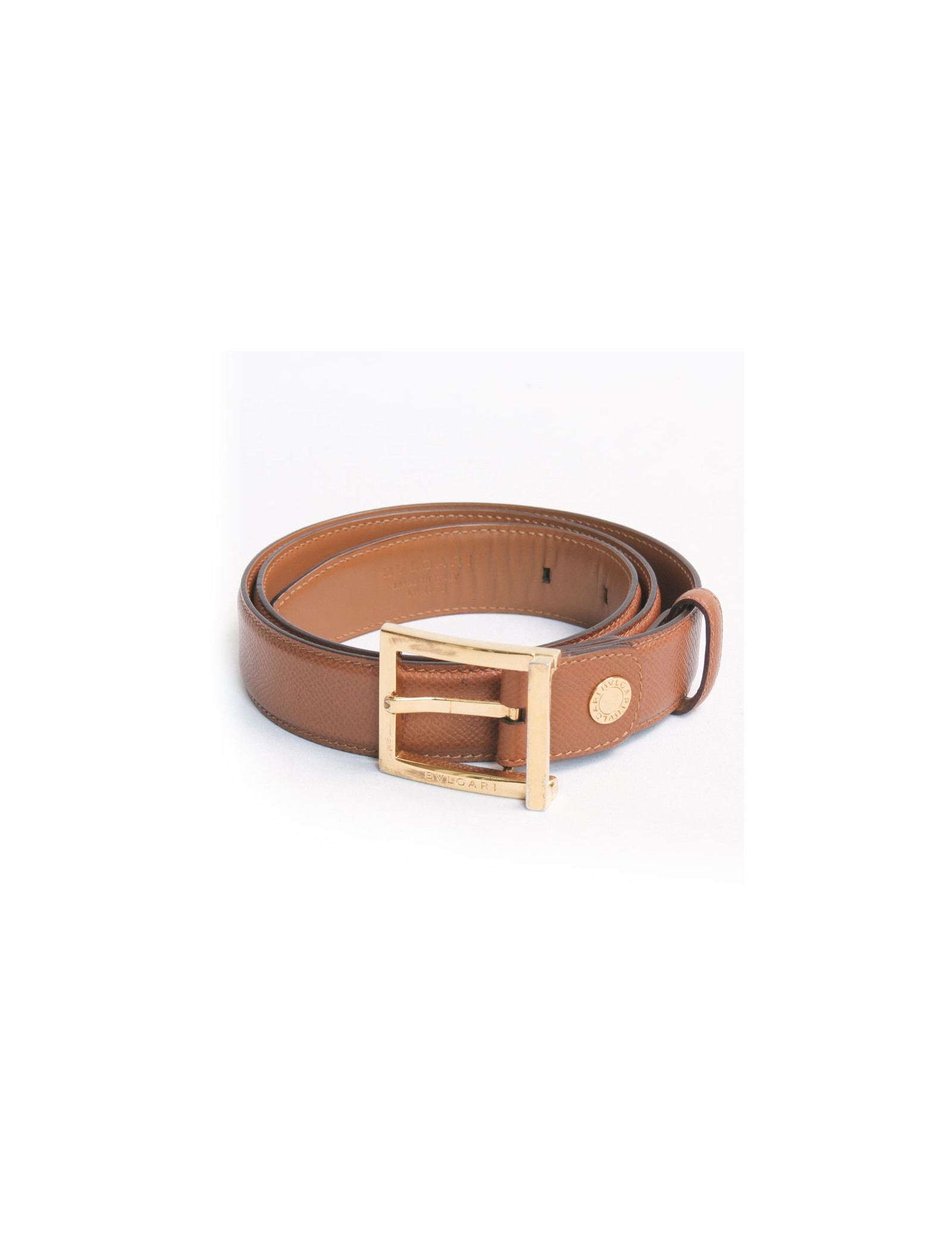 Ceinture Bulgari en cuir grainé gold et boucle dorée, la ceinture a cinq trous de fermeture, aucune trace d'usure, elle est en très bon état.