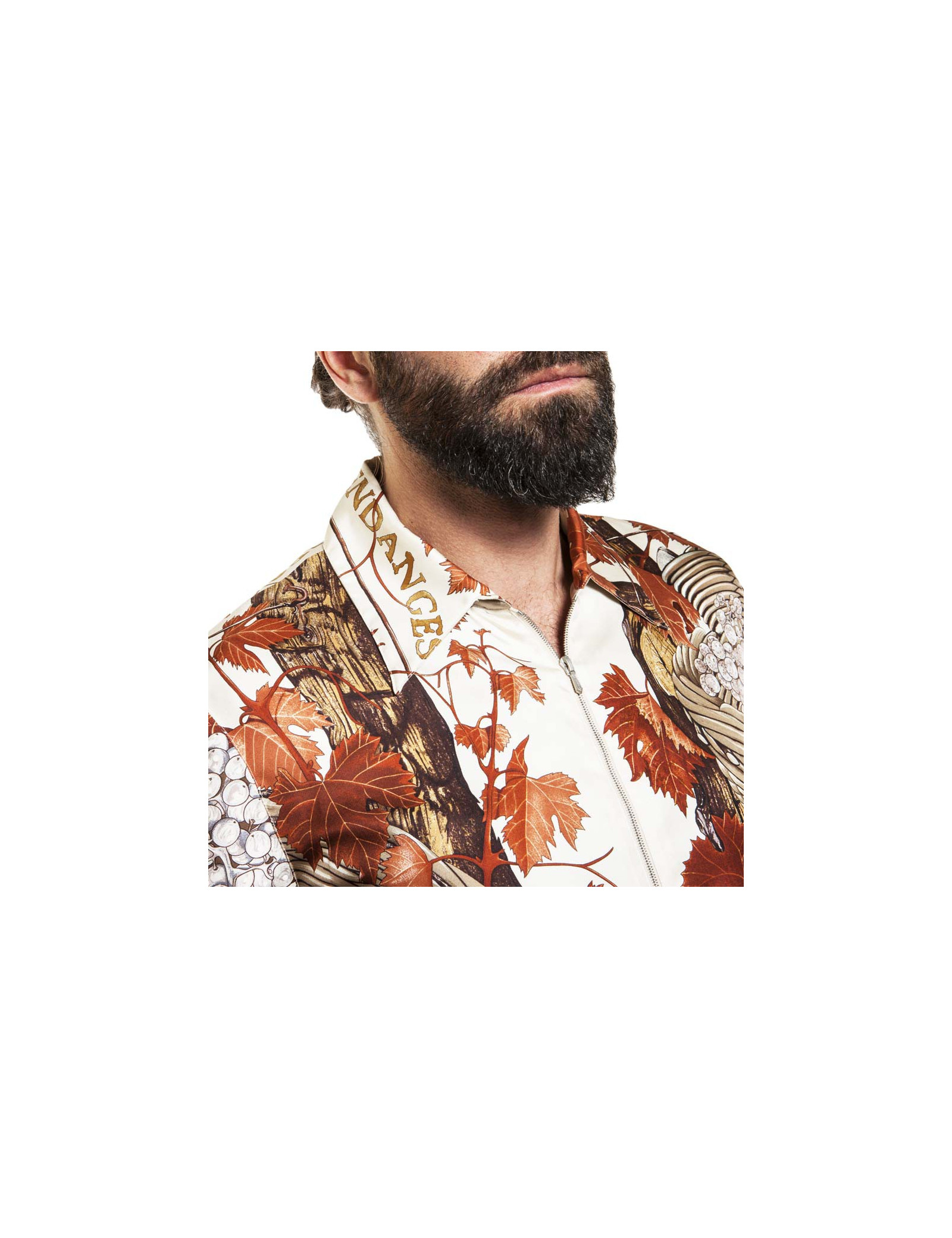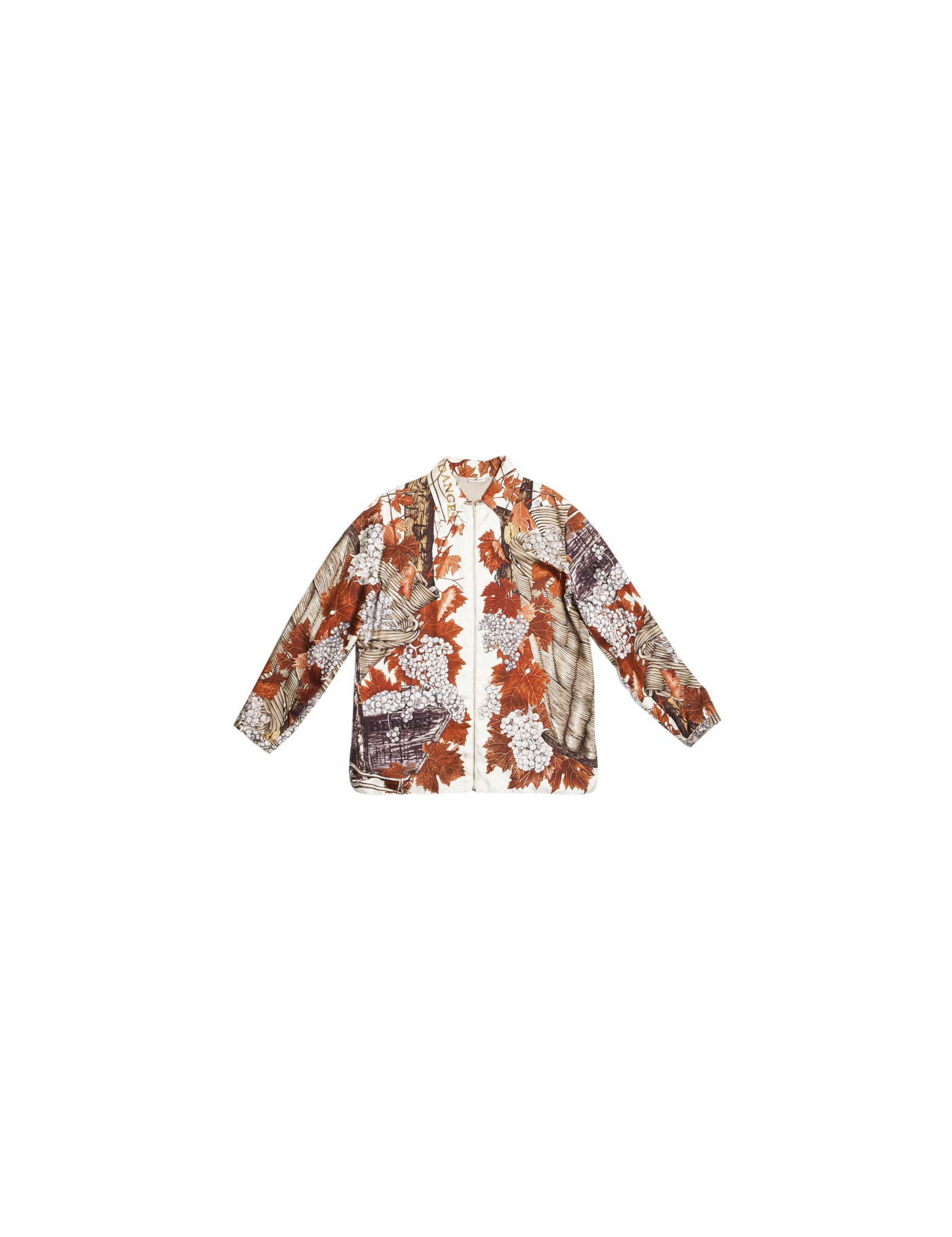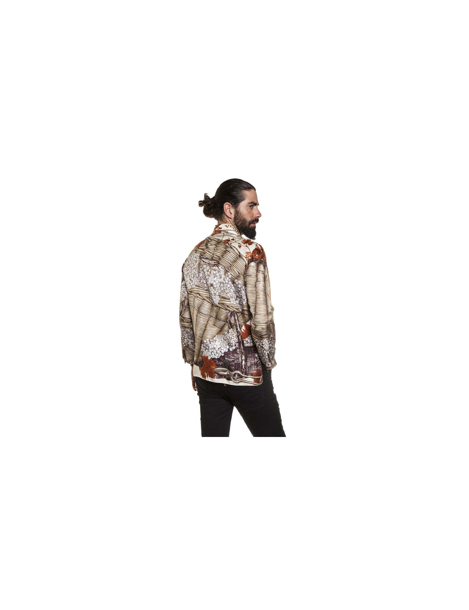 Chemise foulard longue en soie Hermès "vendanges" fermée par un zip. Les manches longues se ferment par 2 boutons au poignet. Taille 44 (absence d'étiquette de taille). Unisex. Elle est doublée de soie couleur taupe.