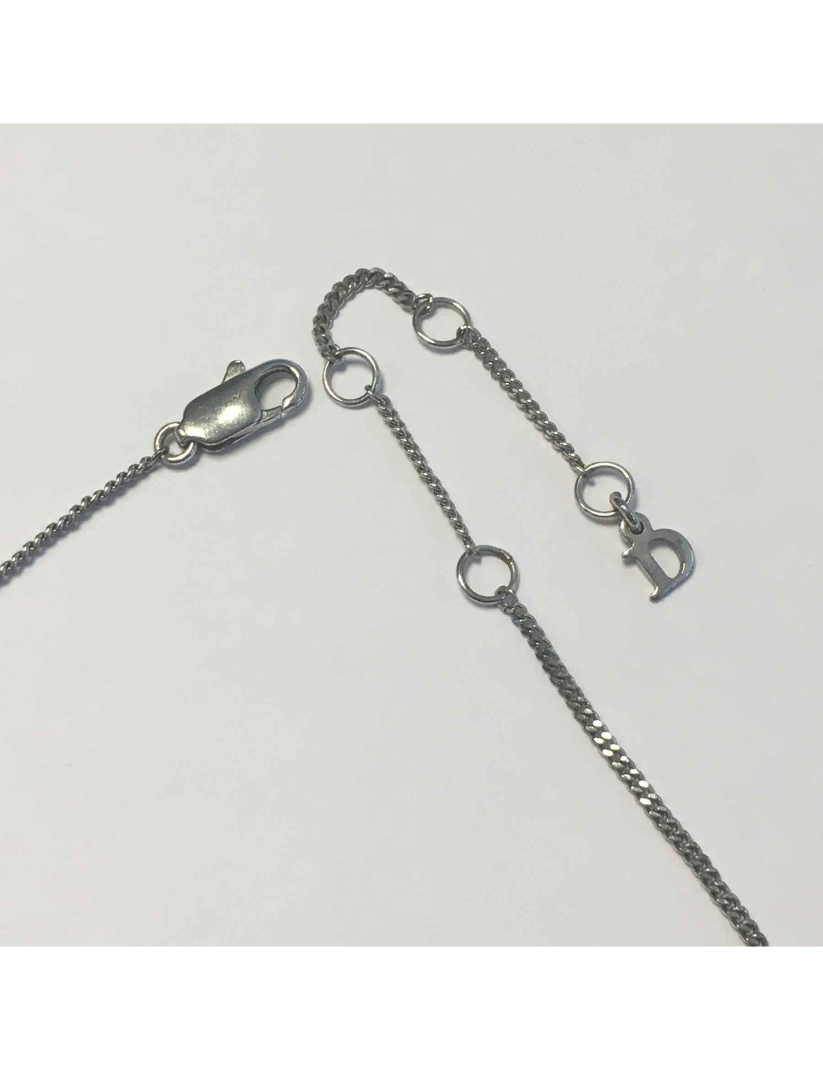 Collier DIOR en métal argenté, pendentif DIOR serti de petits strass.