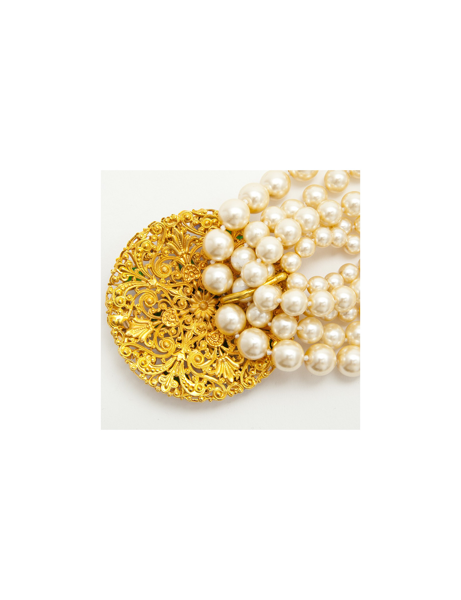 Matière : perles nacrées, agrémenté d'un médaillon imposant en filigrane serti de cabochons en pâte de verre couleur : émeraude et améthyste.