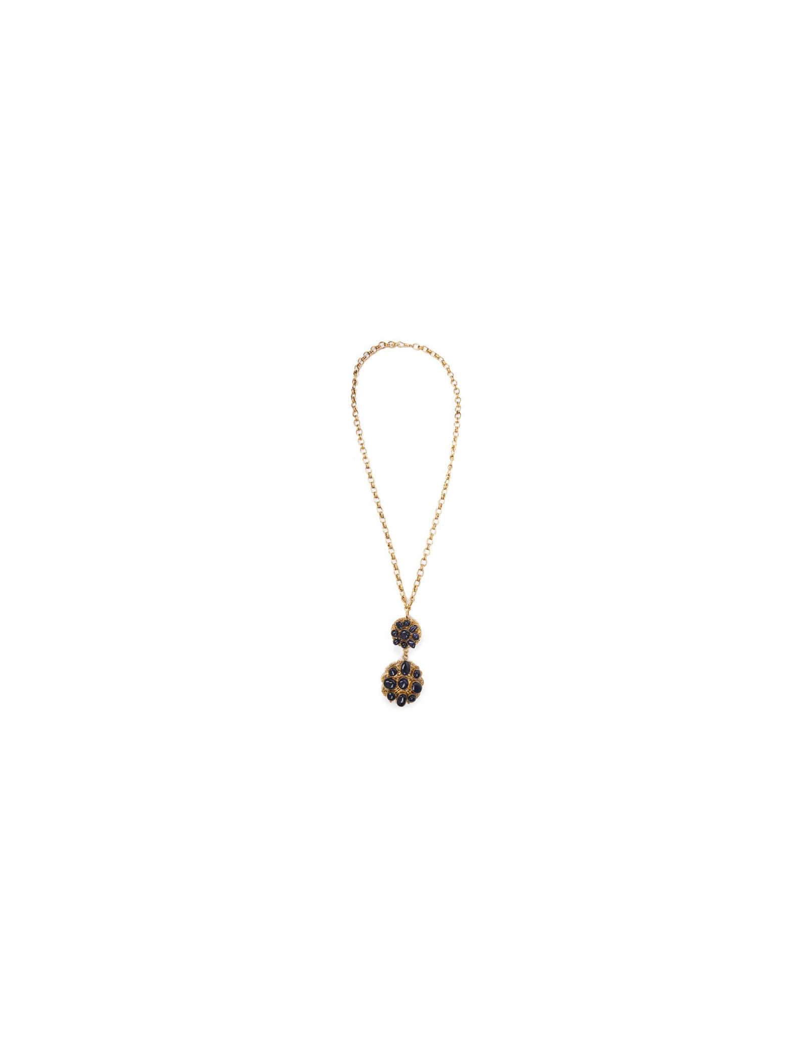 Long collier Couture Marguerite de Valois en métal doré à l'or fin, avec pendentif en filigrane serti de cabochons en pâte de verre saphir. Travail superbe du métal sur l'envers du pendentif. Etat neuf.