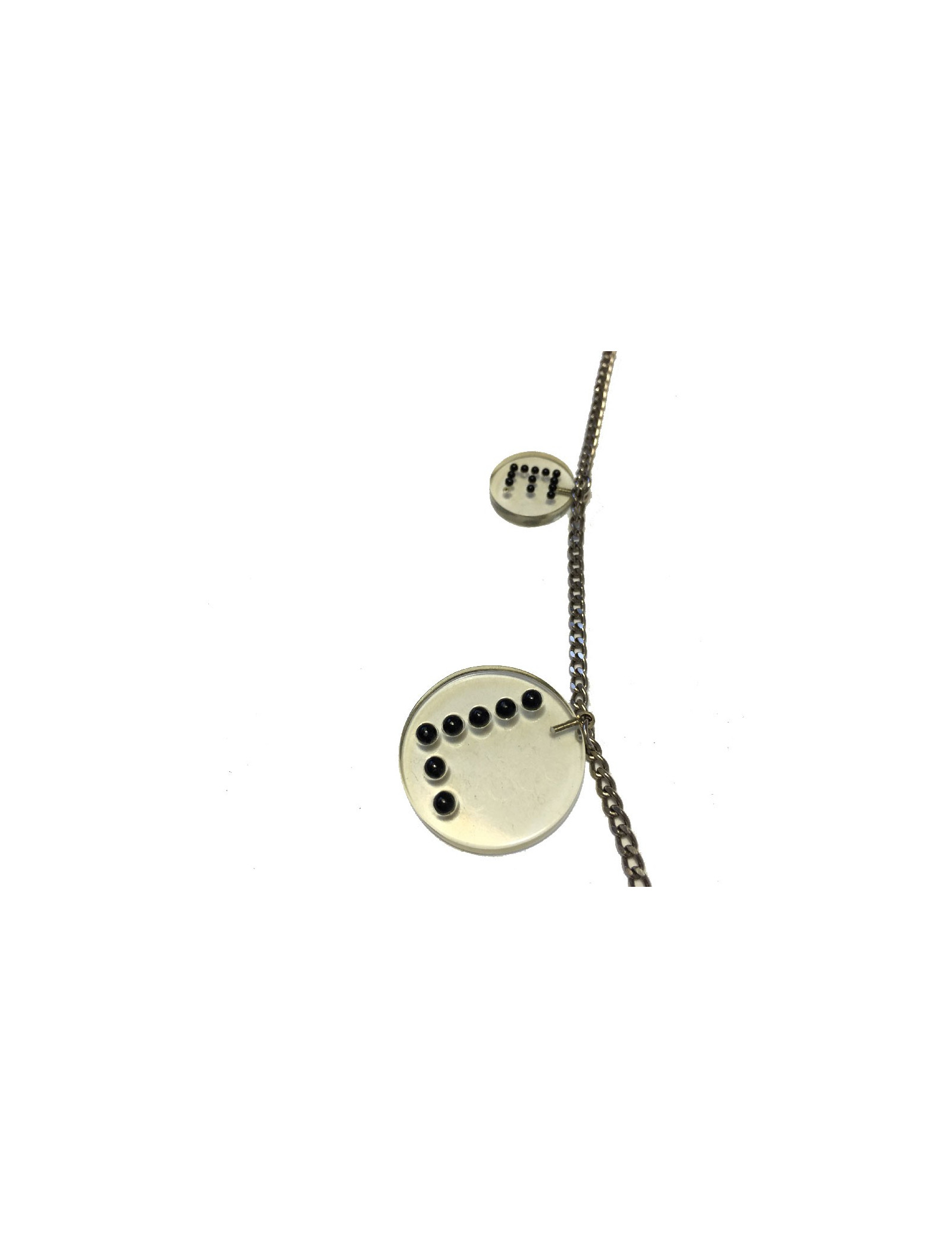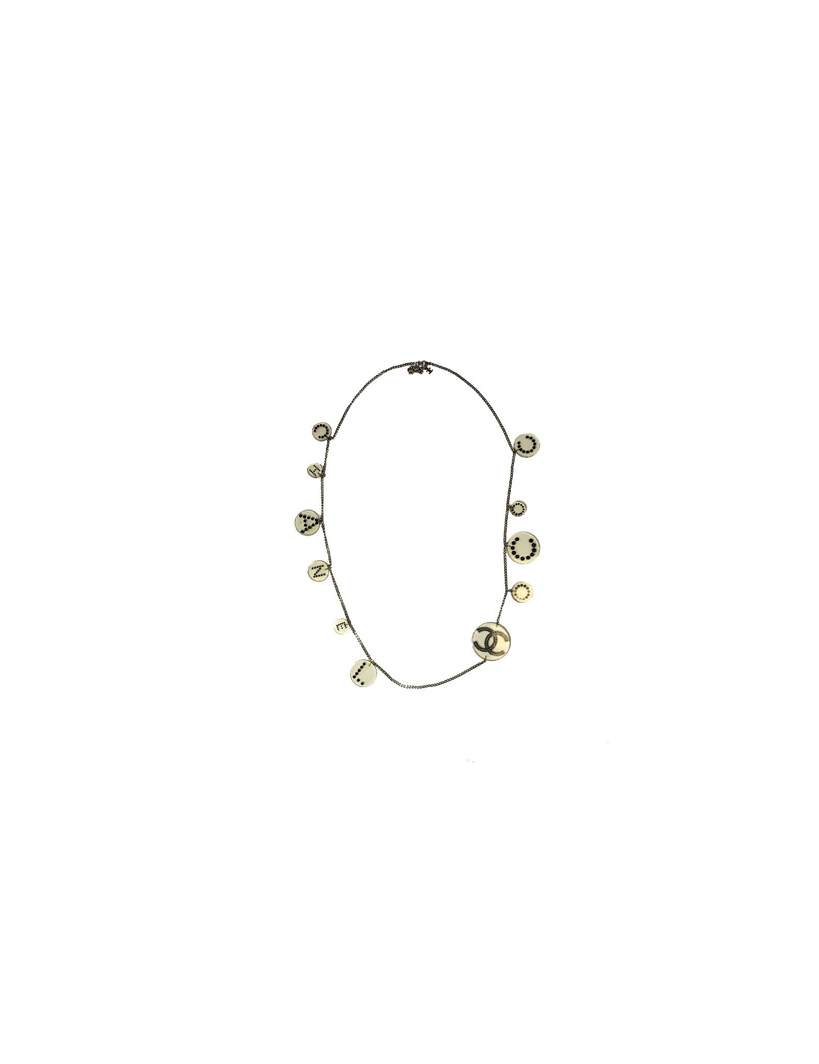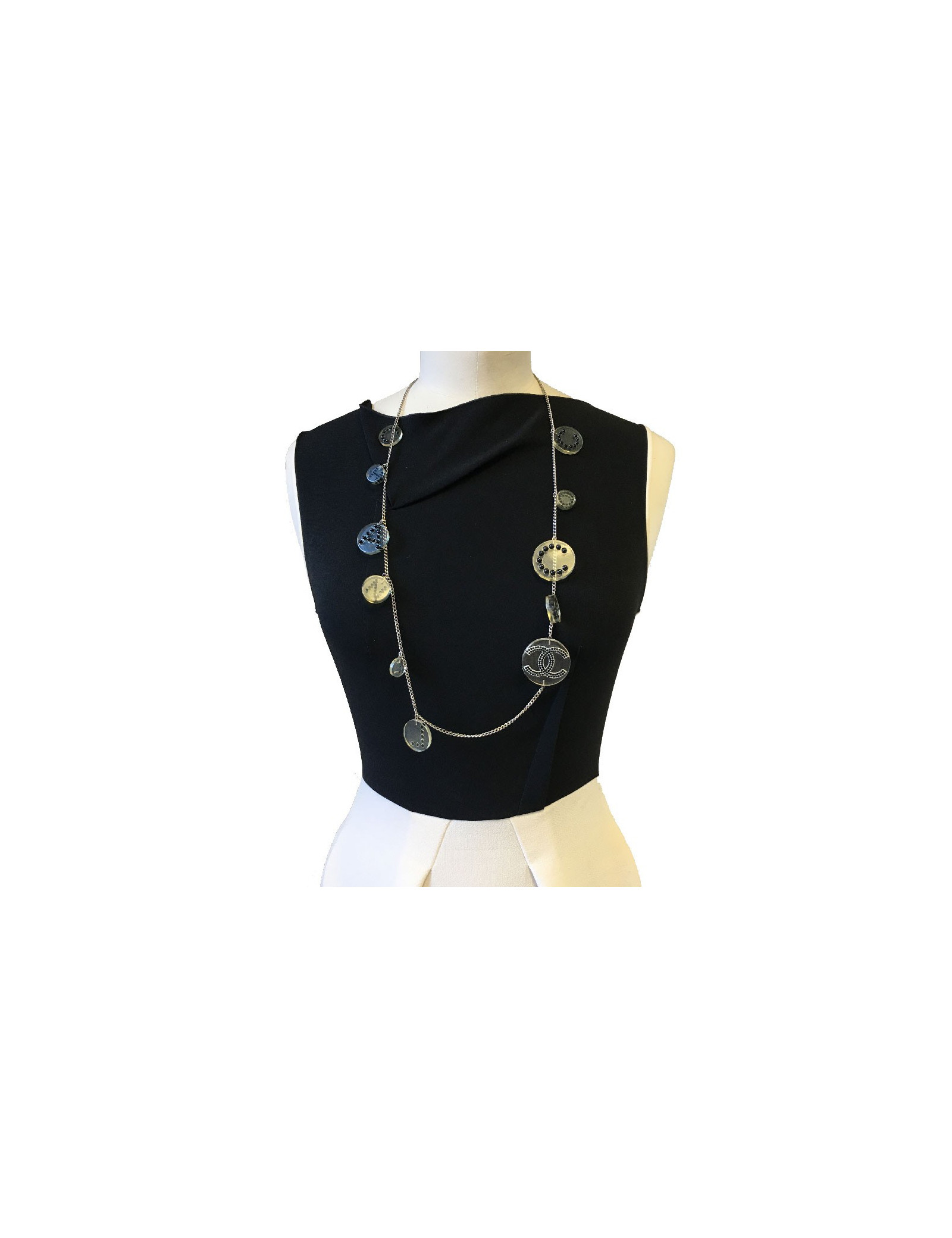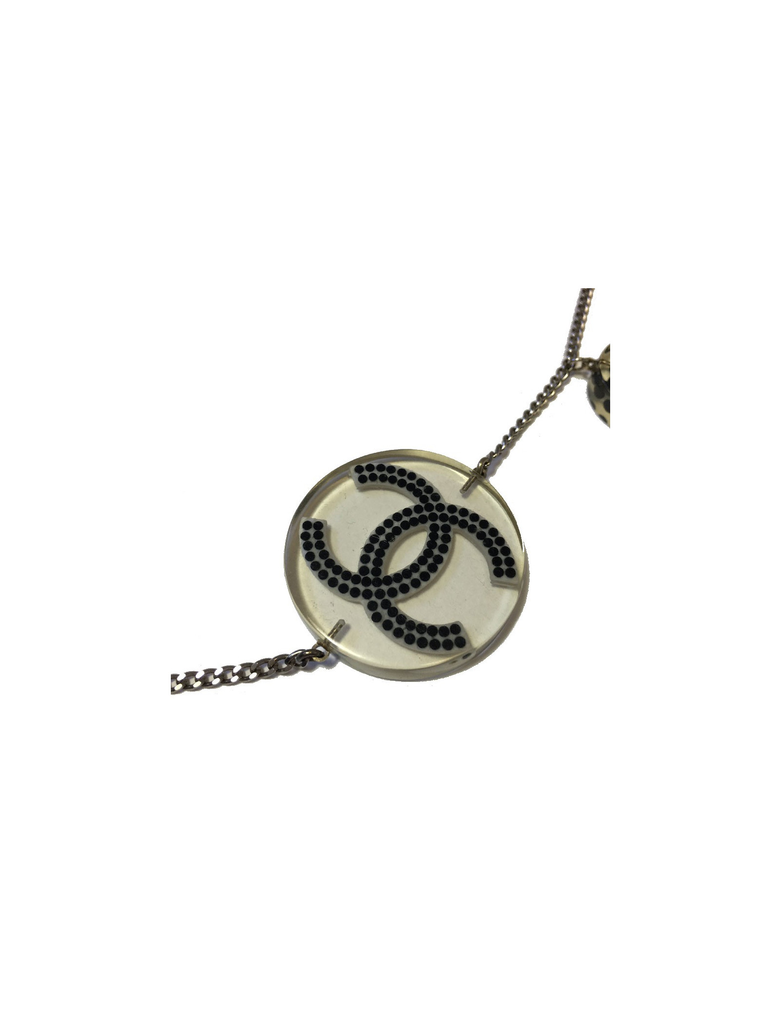 Ceinture sautoir Chanel en plexi transparent et perles noires. En bon état. Quelques micro-rayures sur les médailles en plexi. Chaîne métal argent.