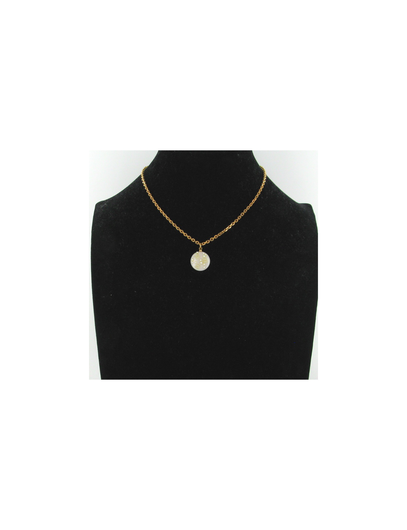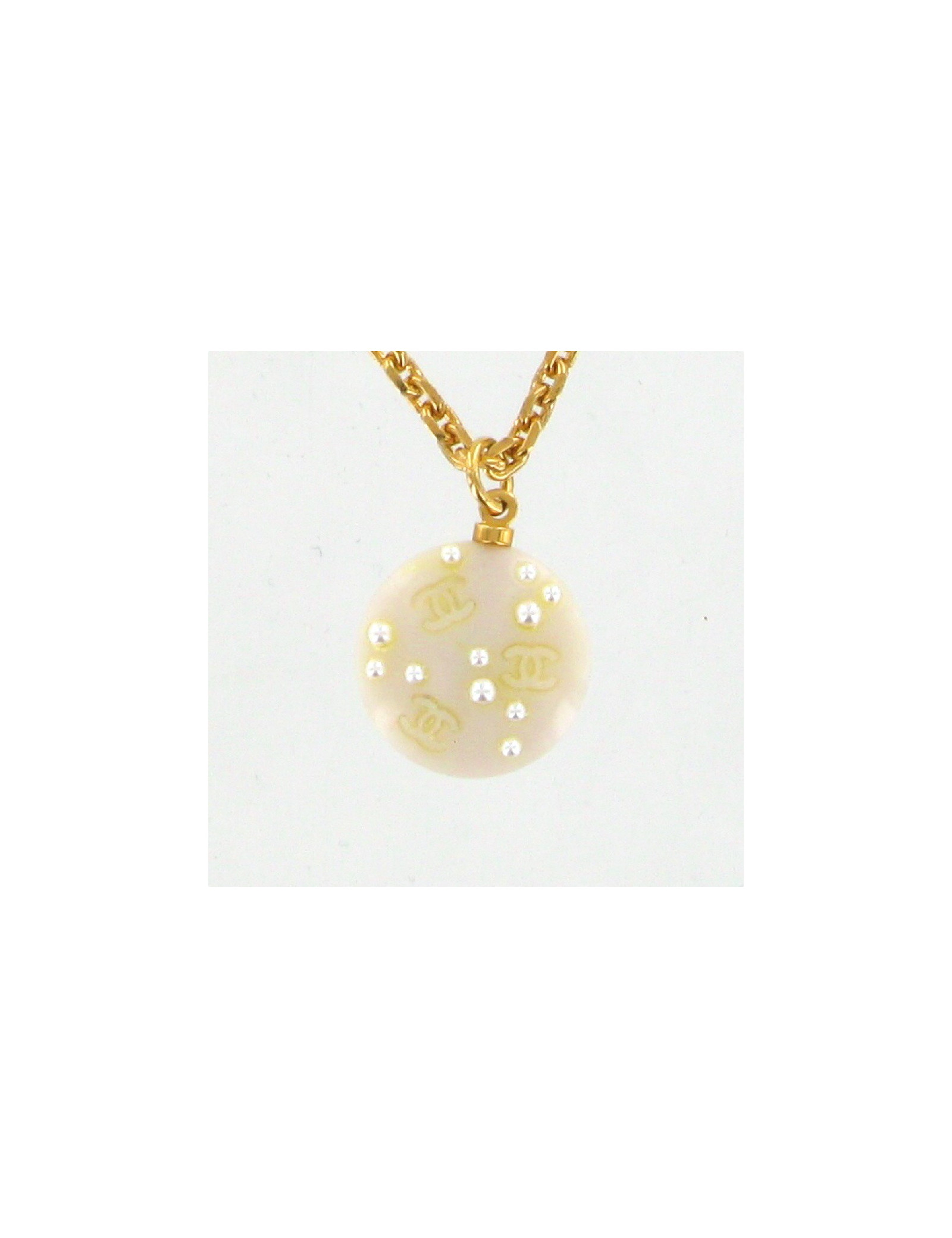 Joli pendentif CHANEL en perles et CC et sa chaine. La chaîne est en métal doré, elle est terminée par un CC en métal doré et mesure 48 cm. Le pendentif est en résine beige rose pâle sertie de petites perles et de CC or pâle.