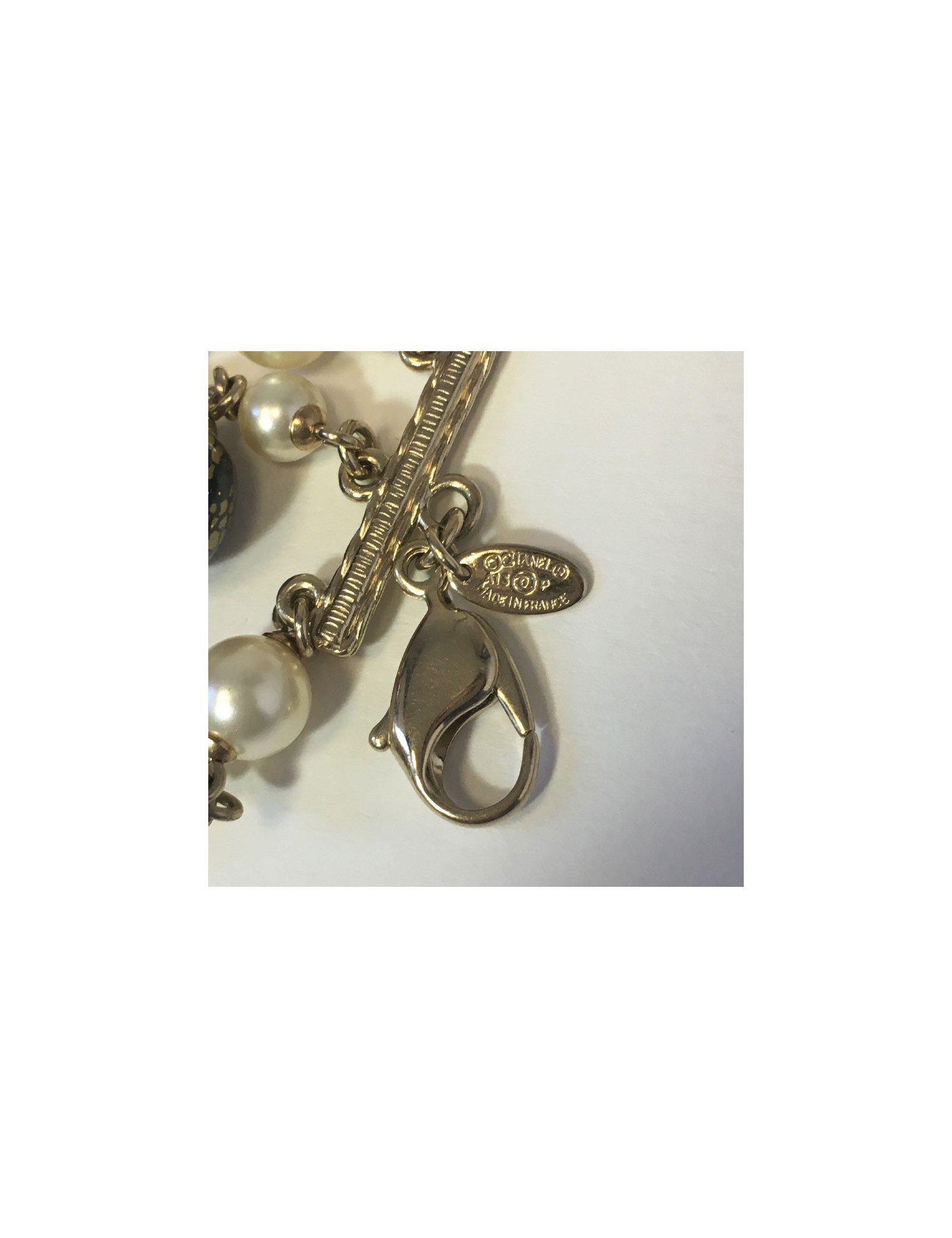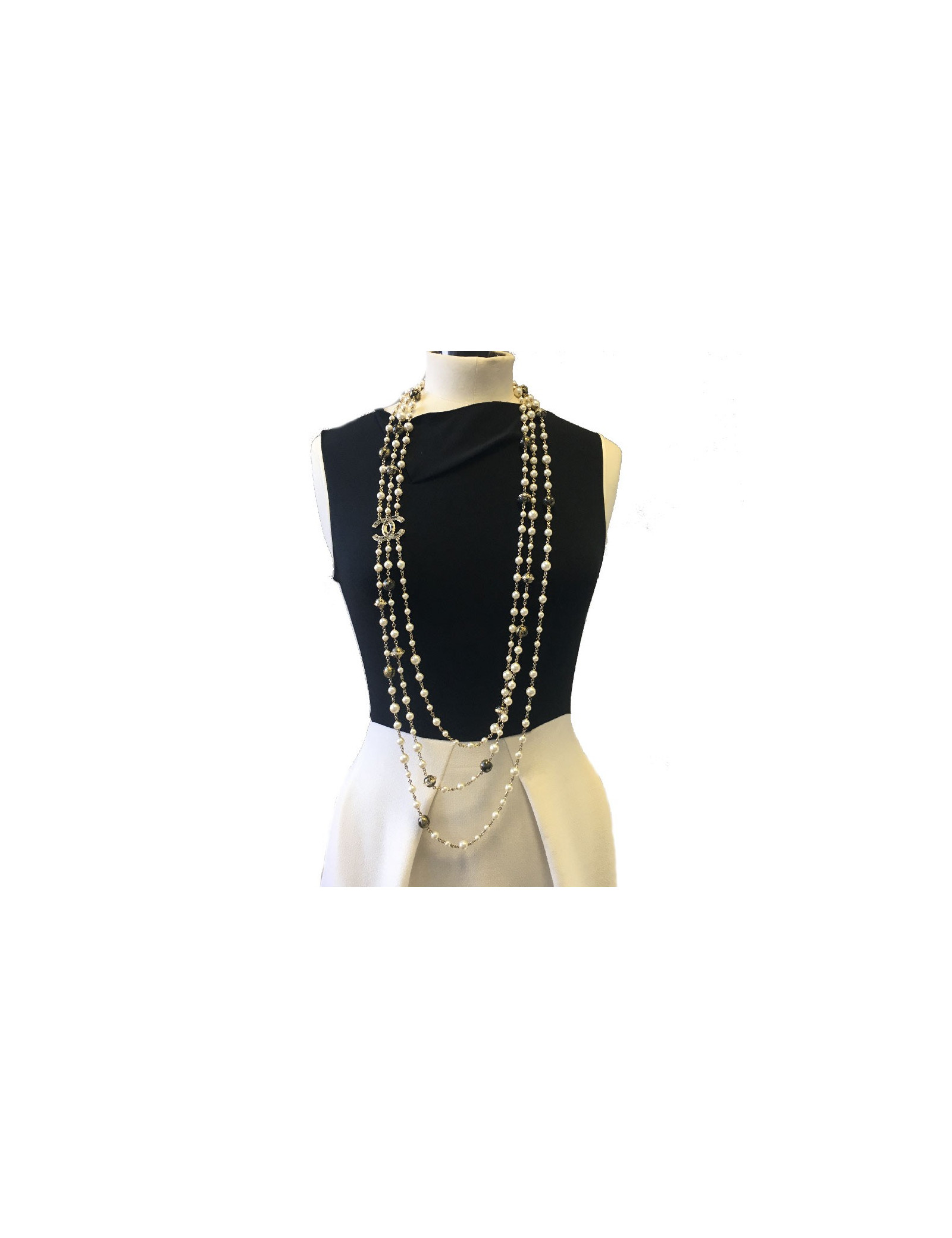 Magnifique sautoir Chanel triple rangs en perles nacrées et boules dorées et noires, un CC doré relie les 3 rangées de perles.