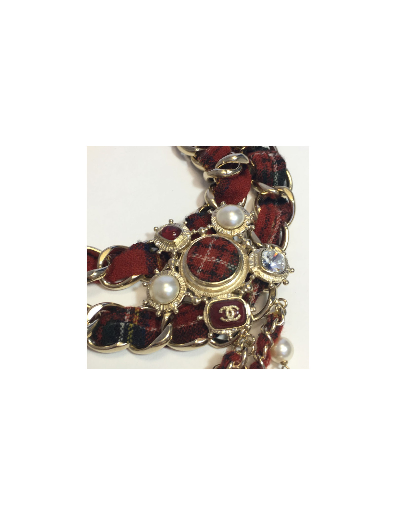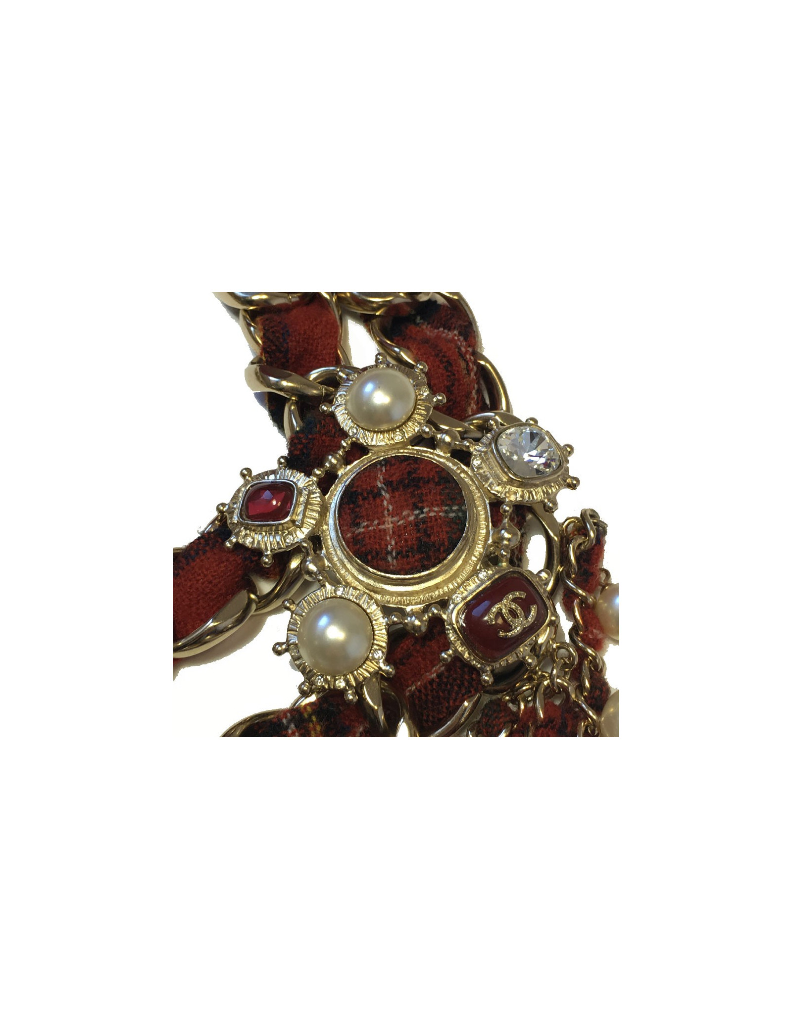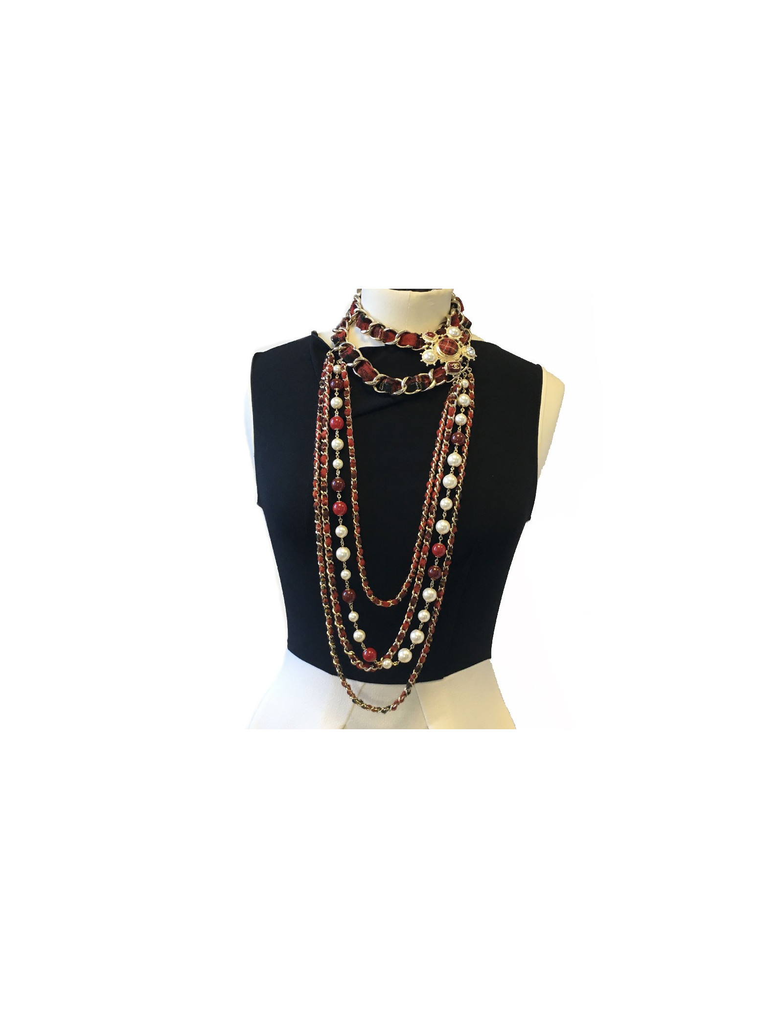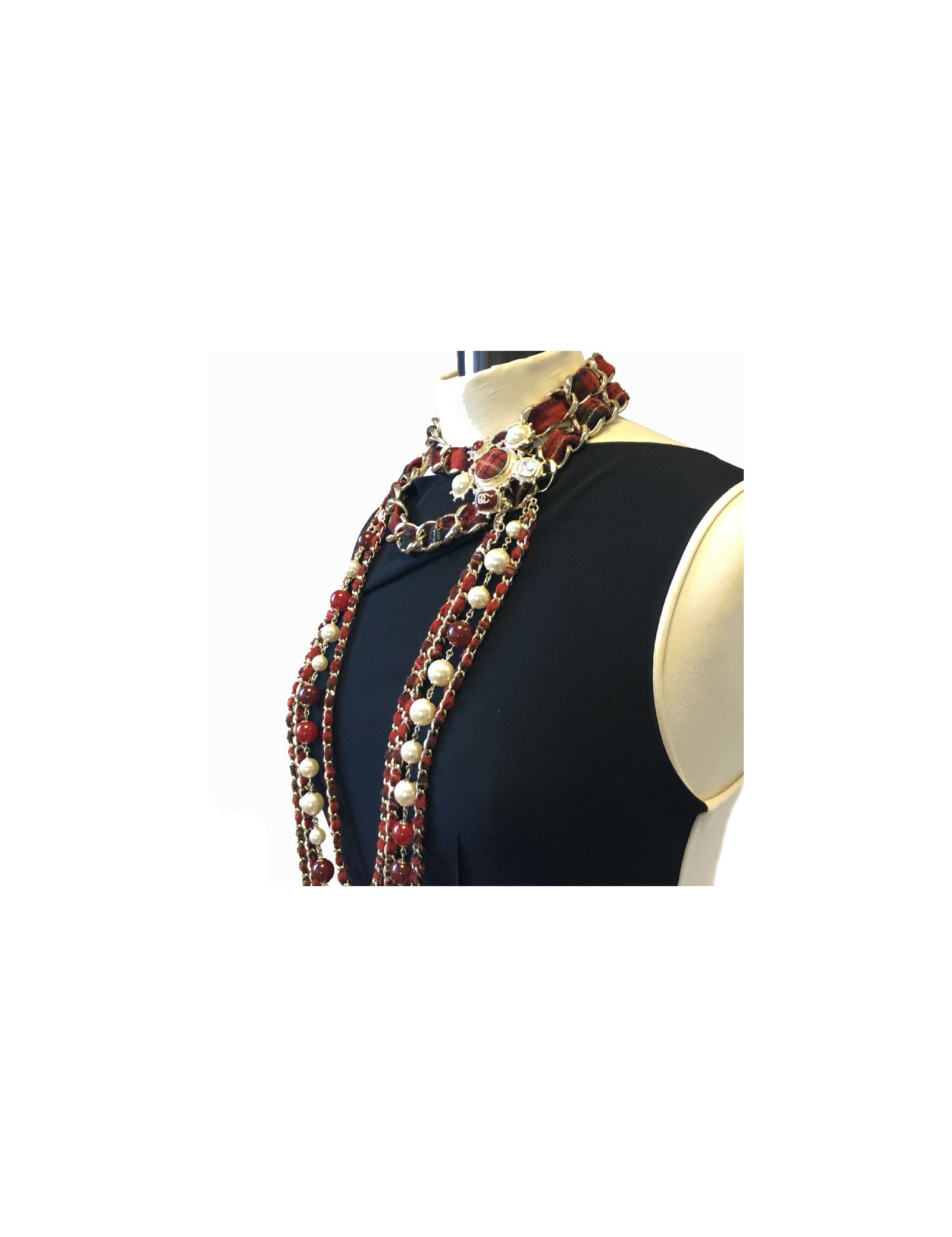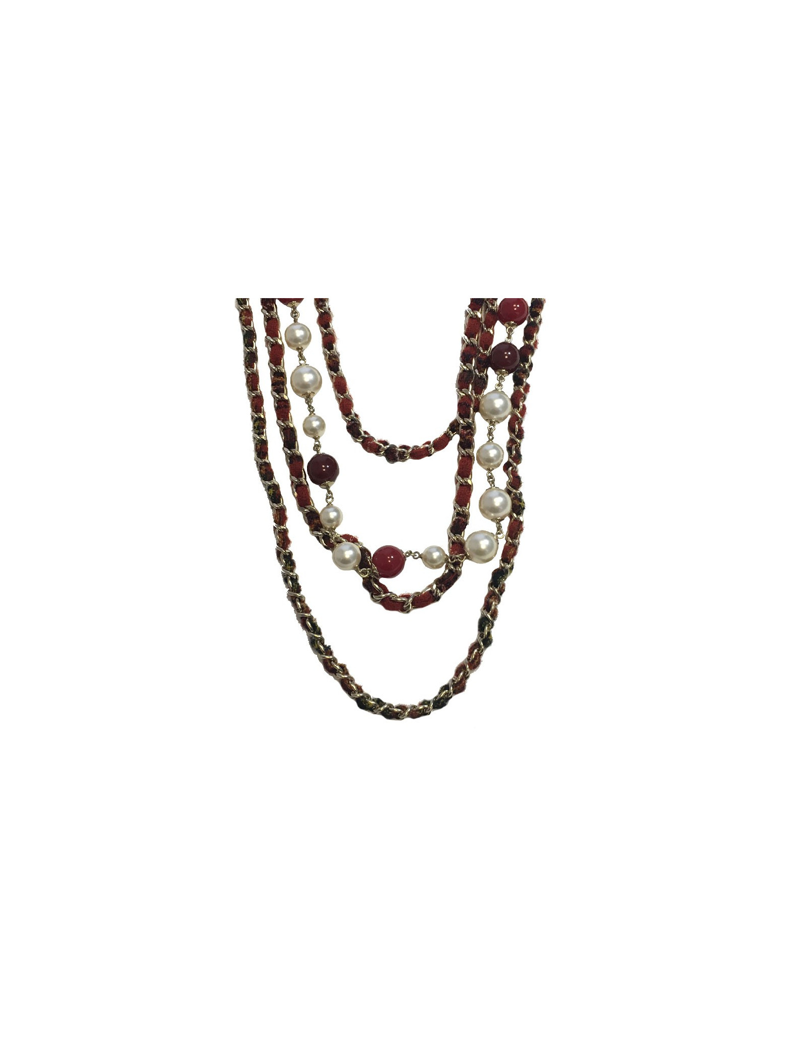 Sautoir en tweed rouge, une rangée de perles nacrées et de verre rouge, 4 chaines en métal doré entrelacées de tweed rouge