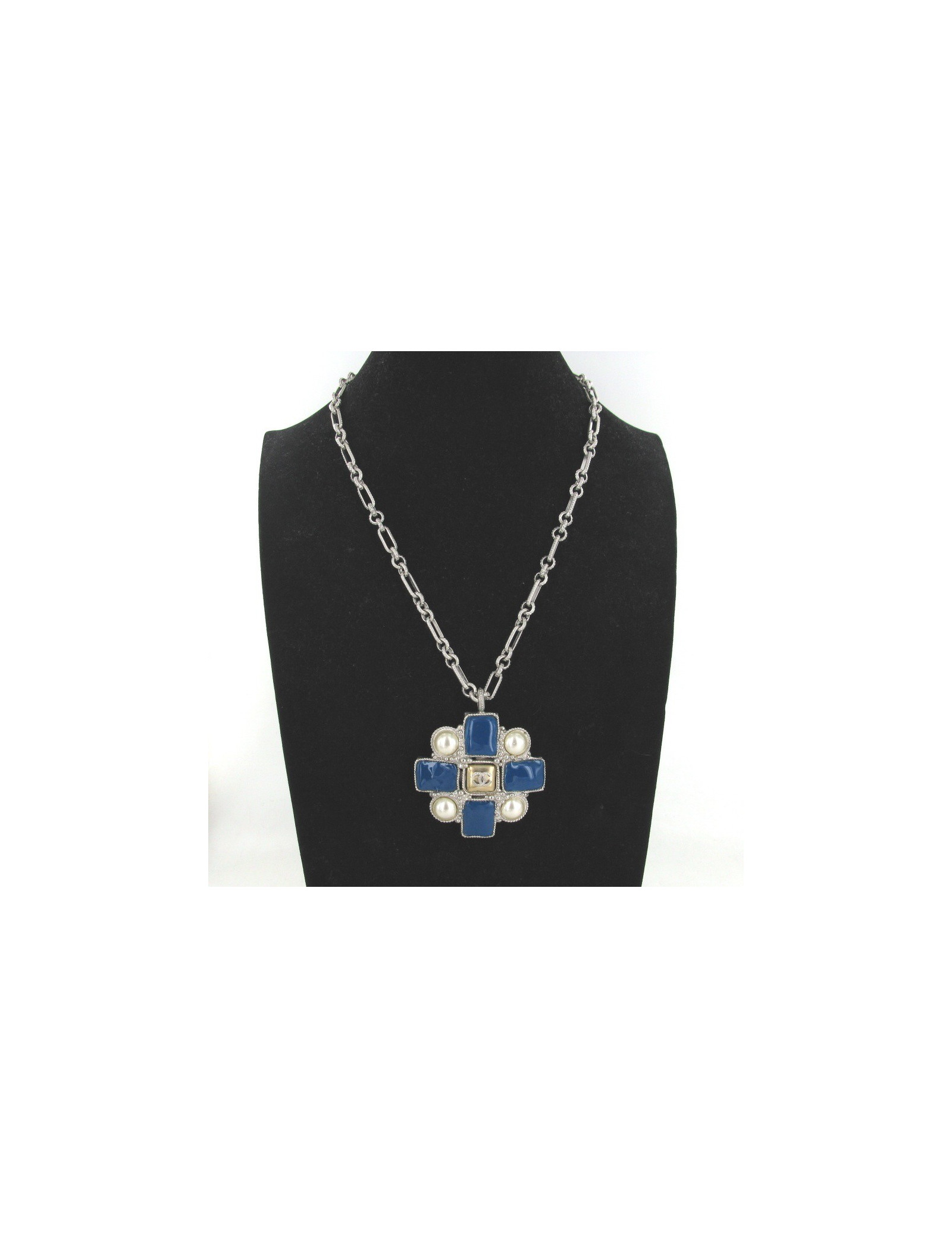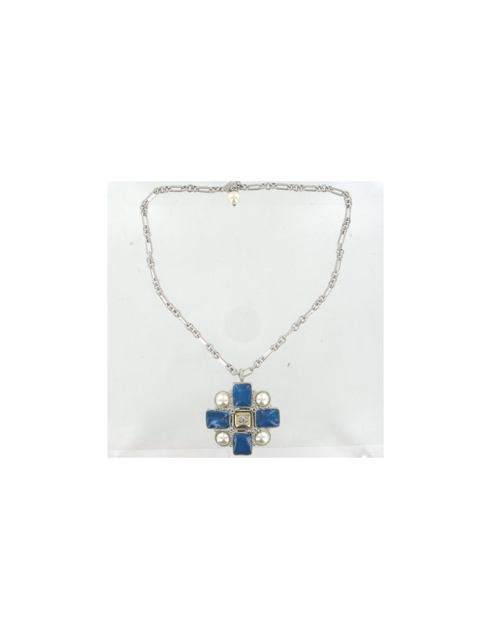 Sublime collier CHANEL croix perles et pâte verre. La chaîne à maillons ciselés est en métal argent mat. Le pendentif est une croix en métal argent mat, sertie de perles nacrées et de pâte de verre bleu outre-mer. Magnifique bijou Couture.