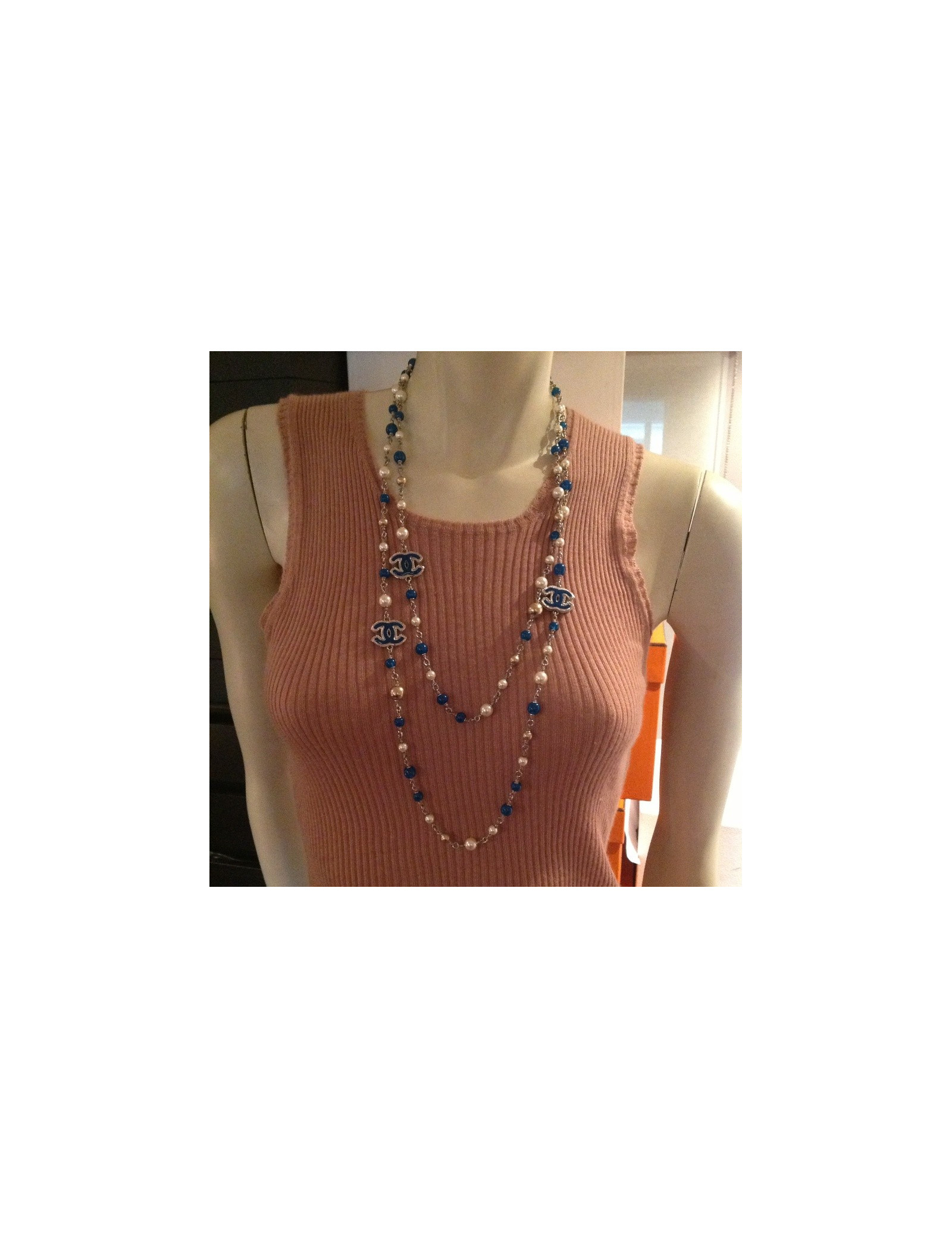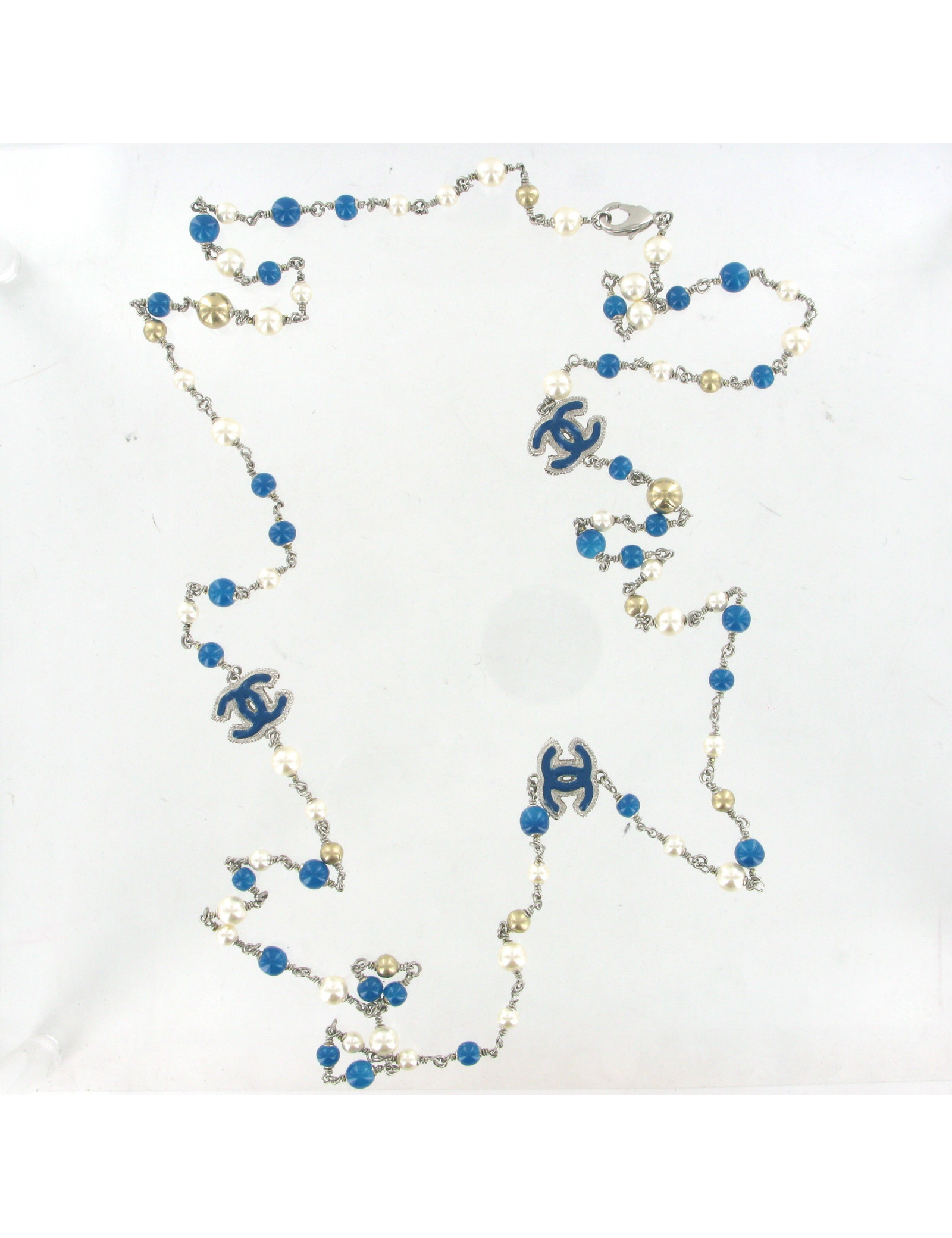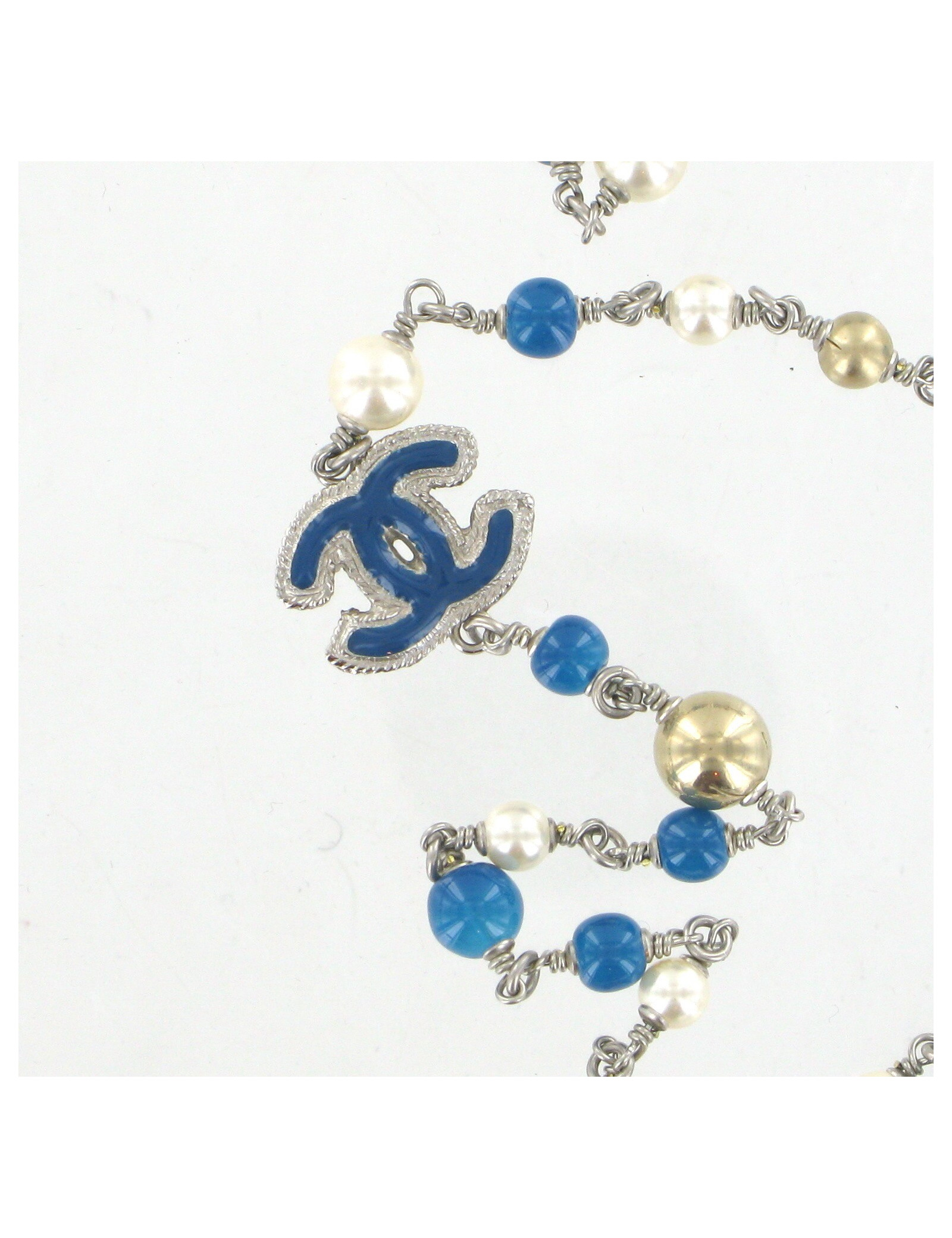 Magnifique sautoir CHANEL perles multicolores (bleues, dorées, nacrées) et CC. Les parties en métal sont argent mat, les perles sont nacrées, bleu outre-mer et or pâle. Et il y a deux CC en métal argent mat émaillé de bleu outre-mer. Peut se porter en simple ou double tour.