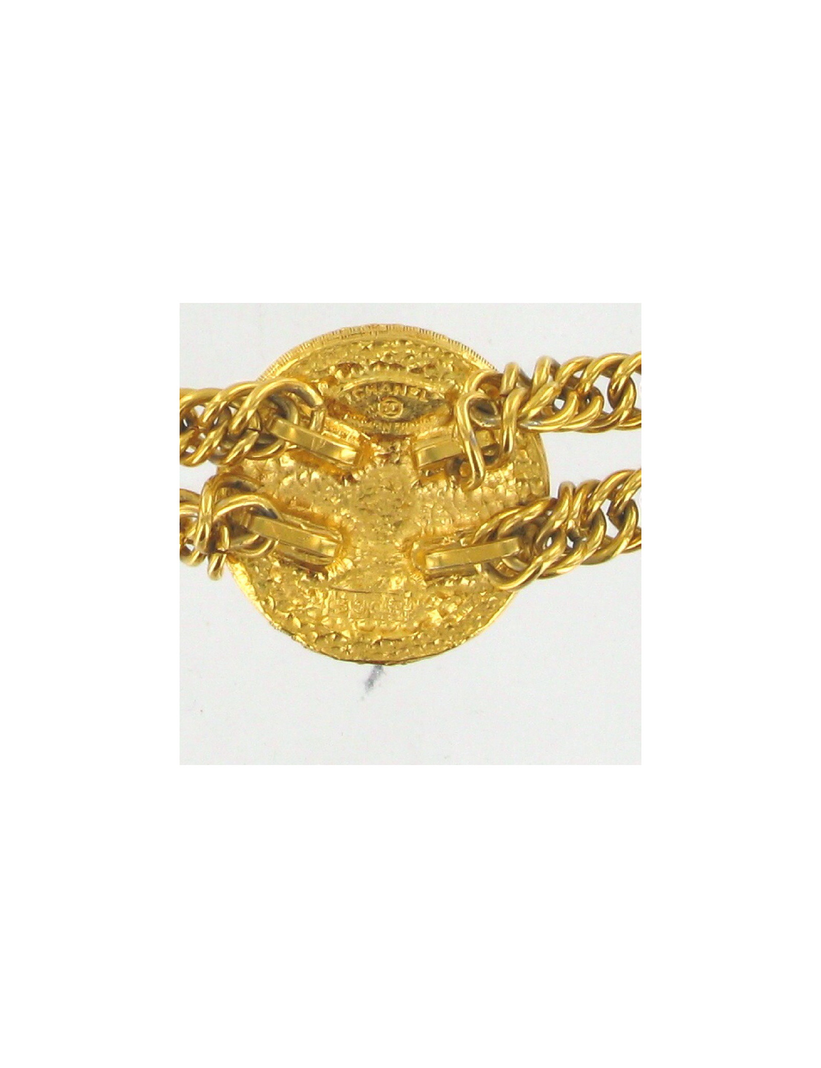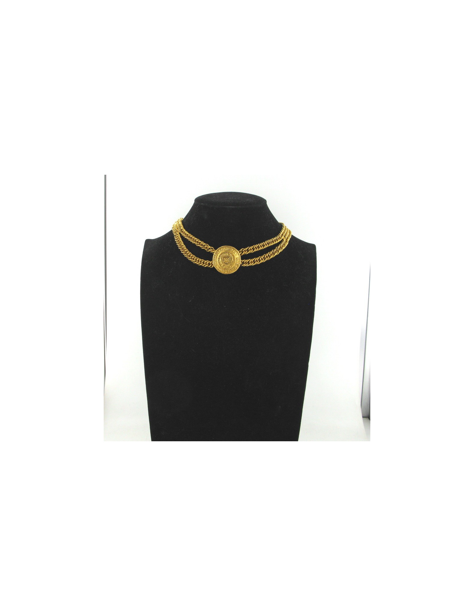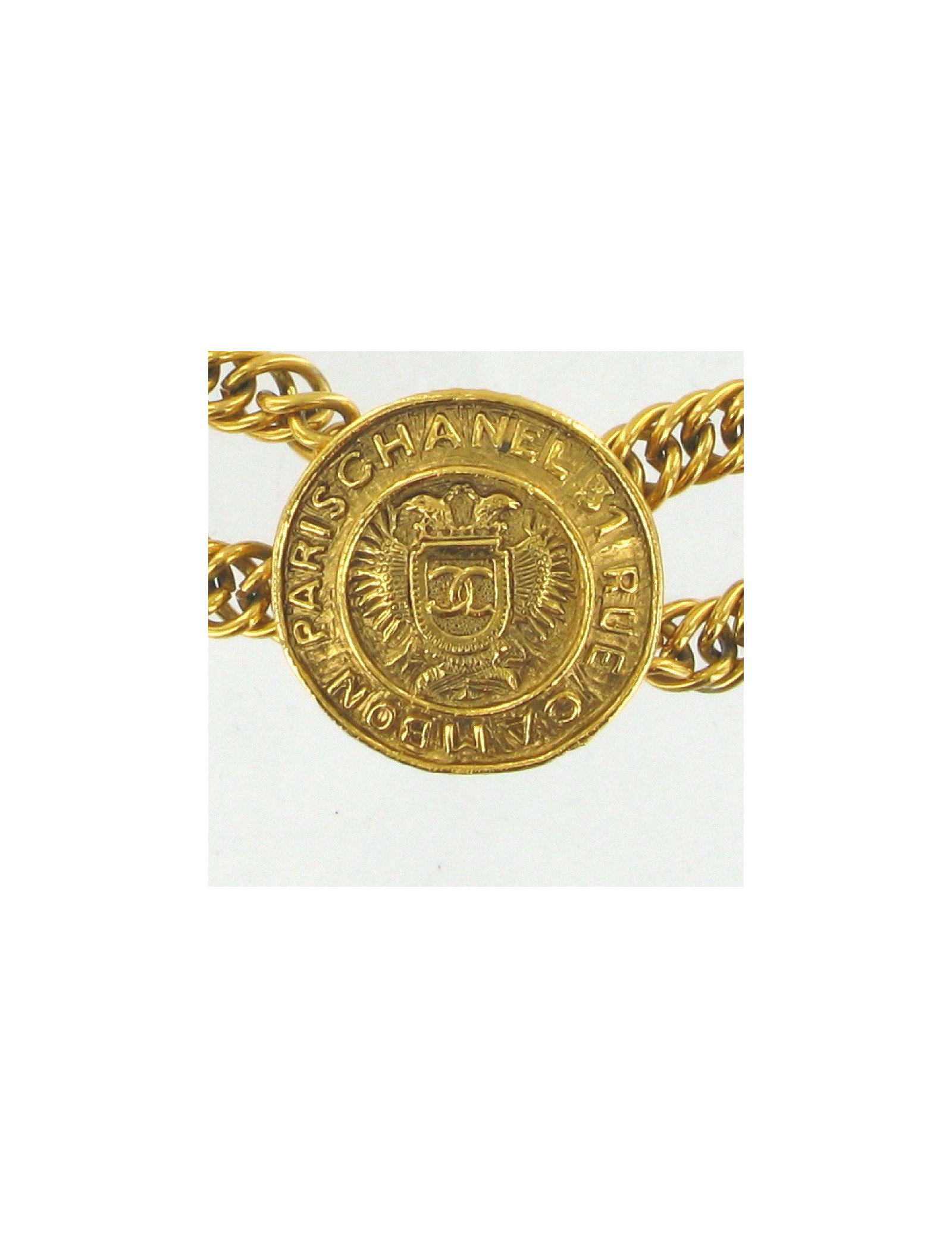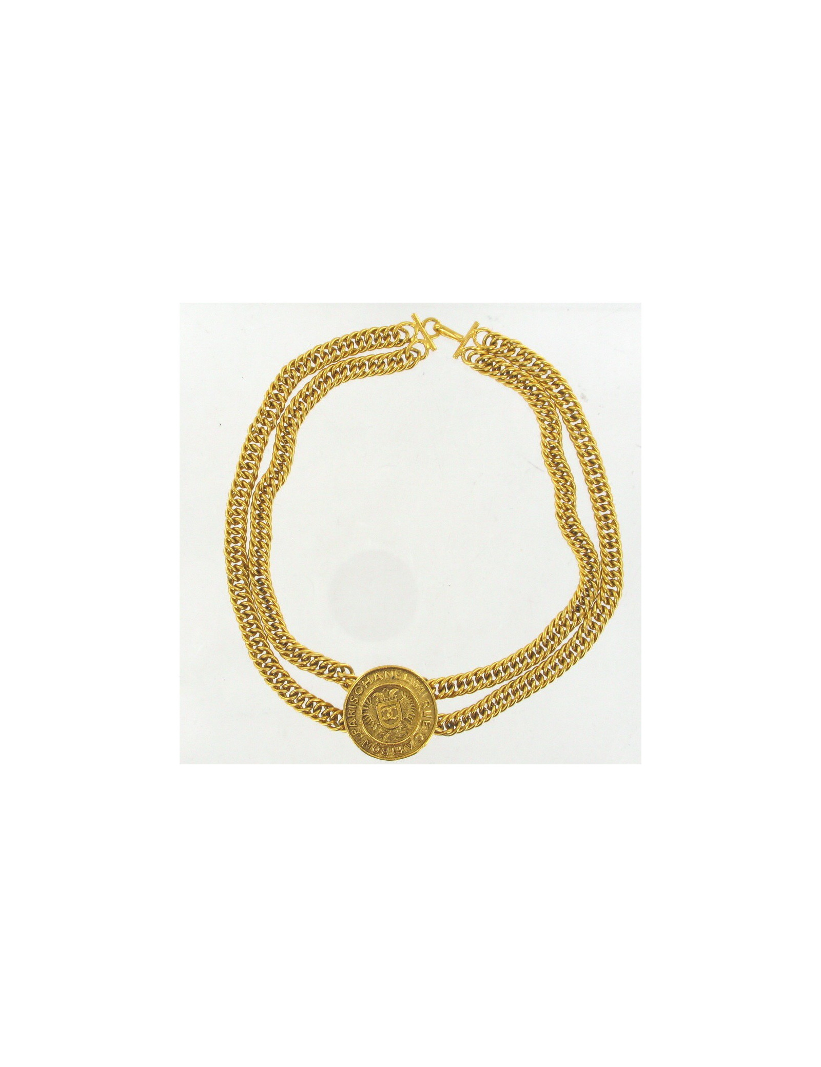 Collier CHANEL vintage composé d'une double chaine en métal doré et d'un médaillon au centre rue Cambon, siglé CC.