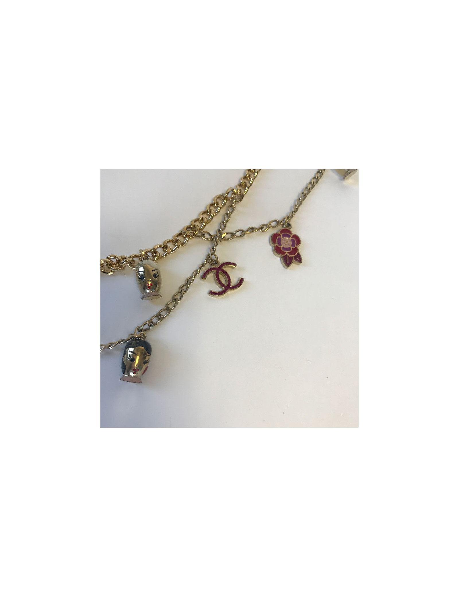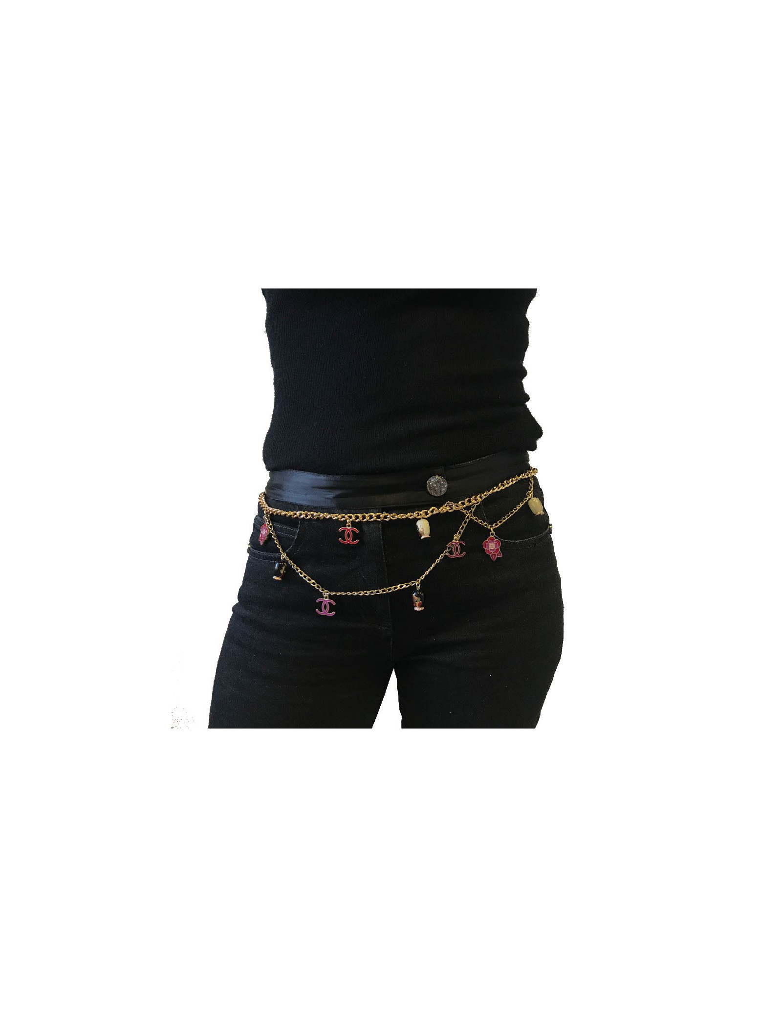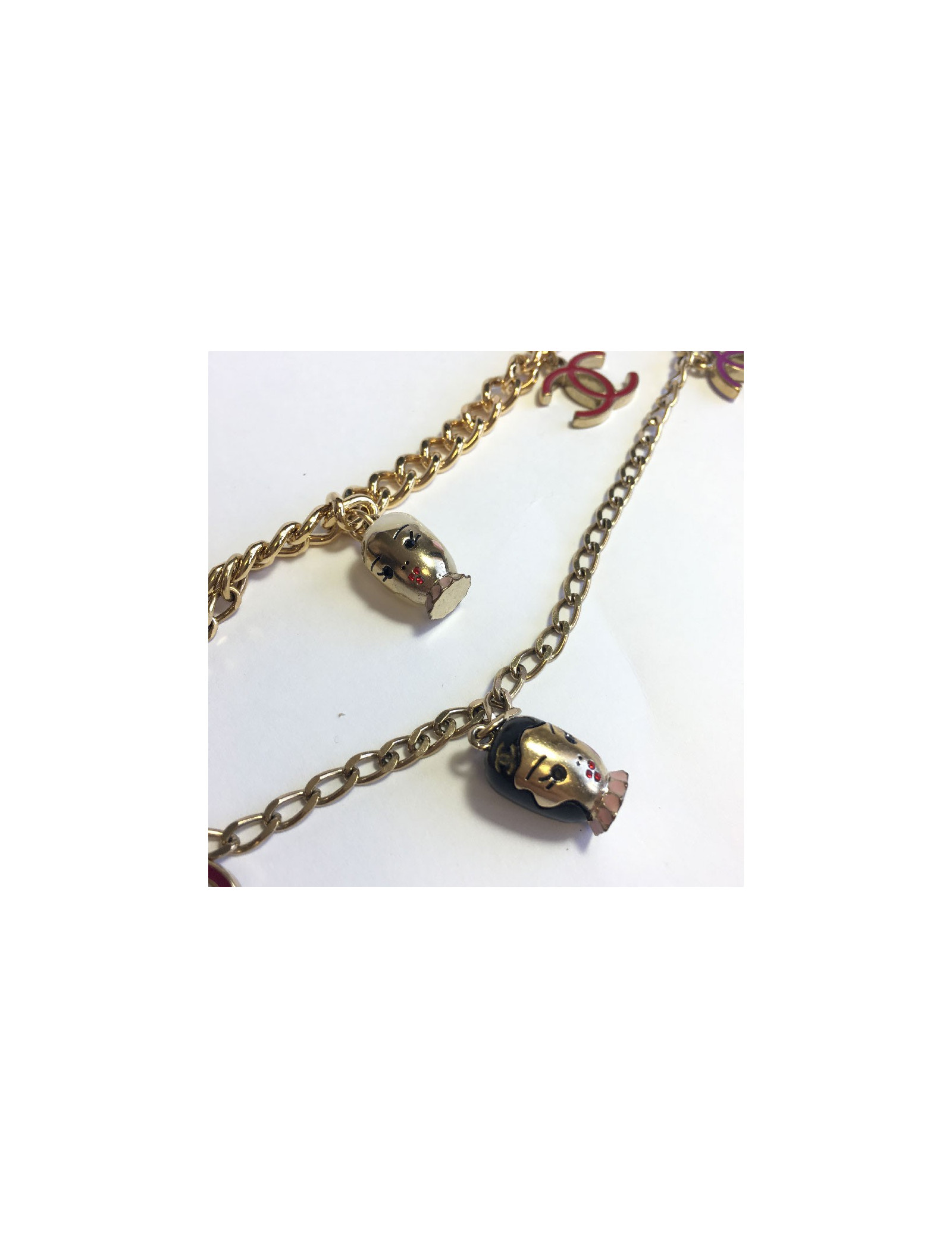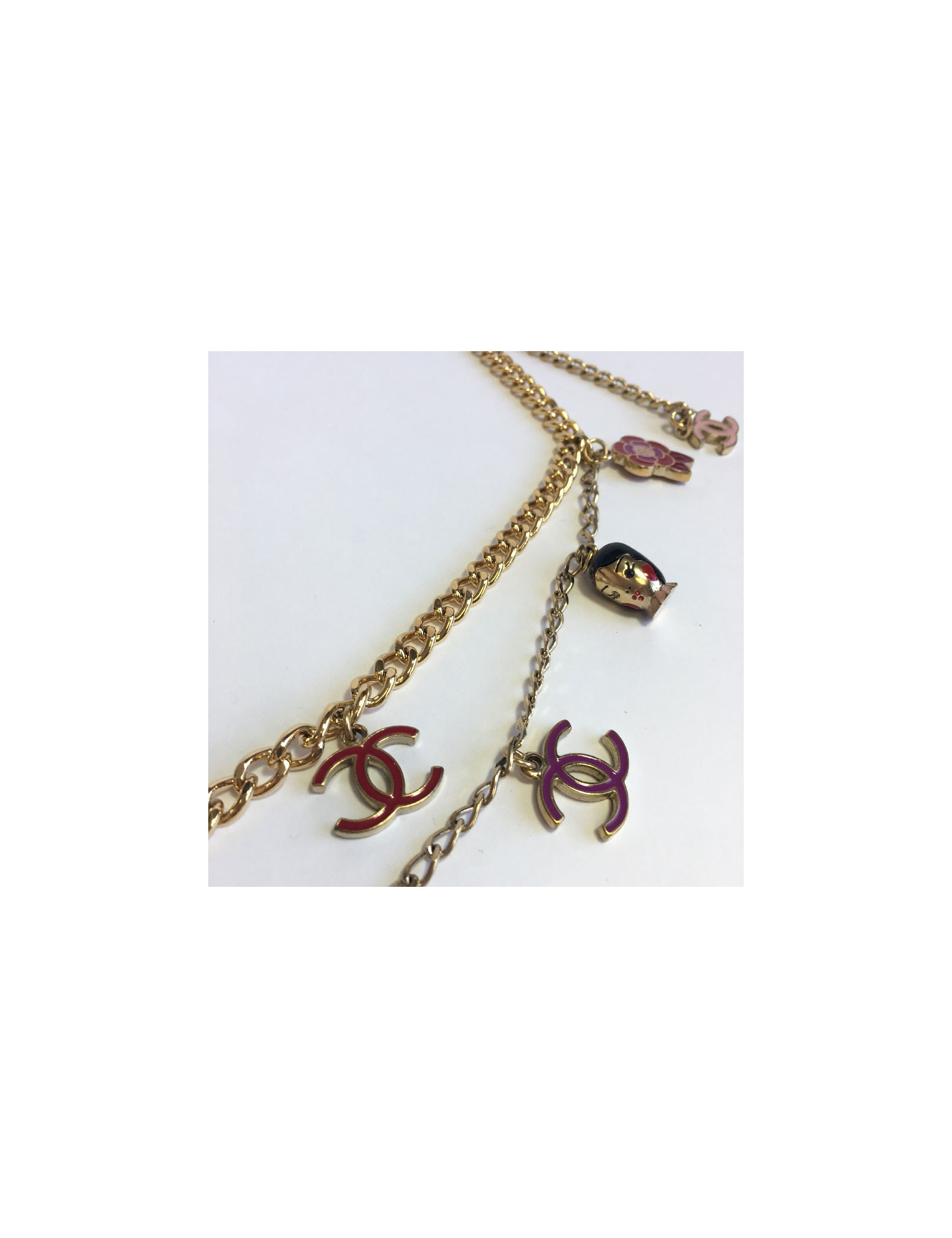 Ceinture sautoir Chanel issue de la Collection Paris Shanghaï, accessoire de défilé non signé. Bijouterie en métal doré à l’or fin, les petits accessoires tels que les poupées et les cc sont en résine noire, fuchsia, rouge. La ceinture est ajustable à toutes les tailles comprises entre 84 et 100 cm.