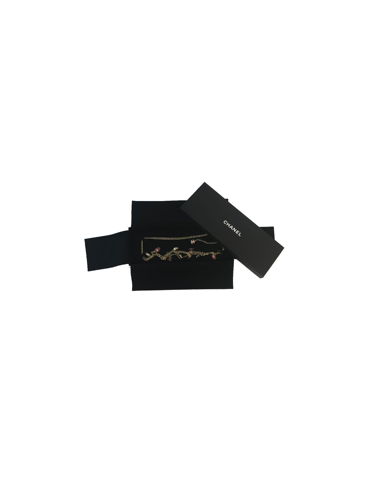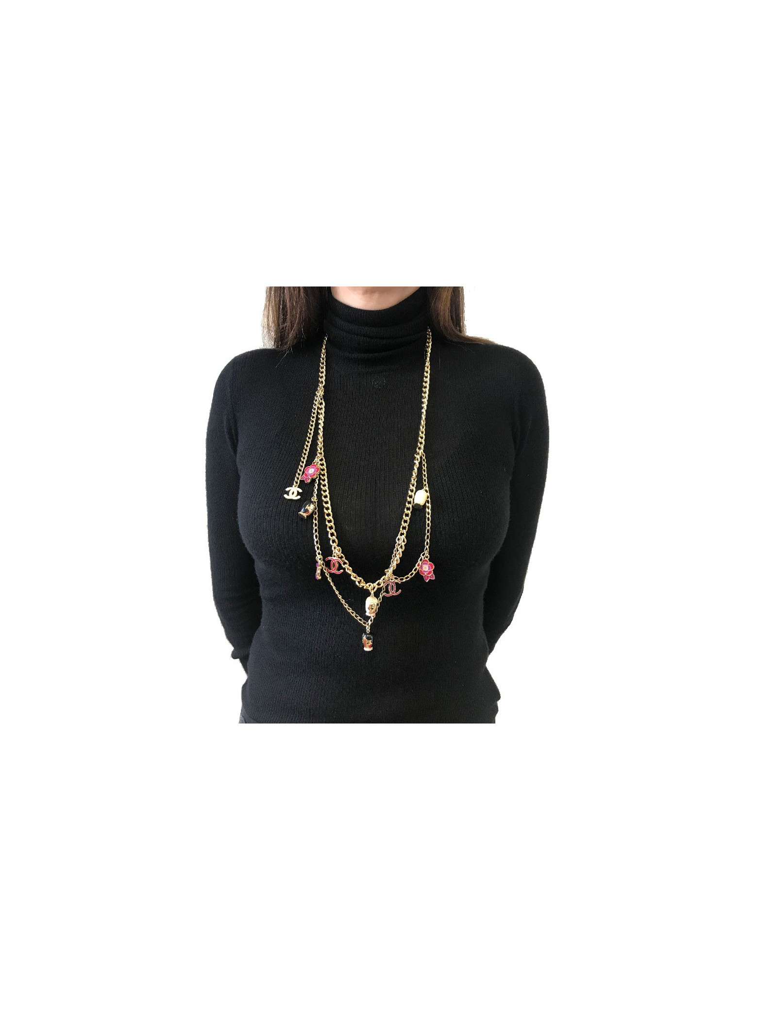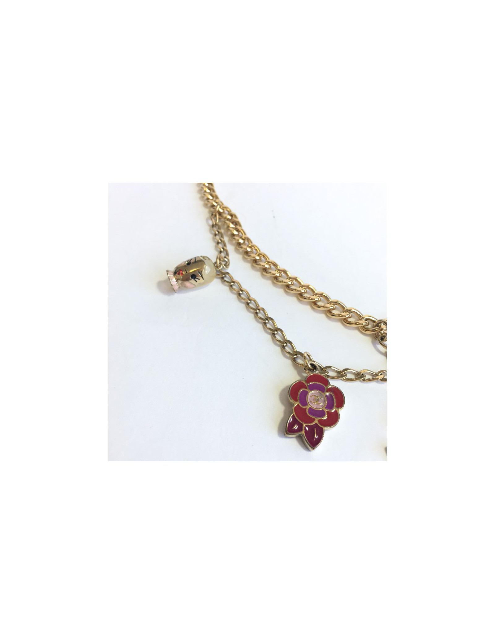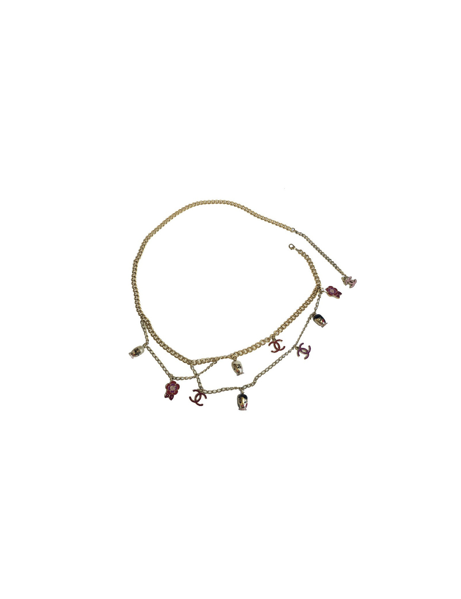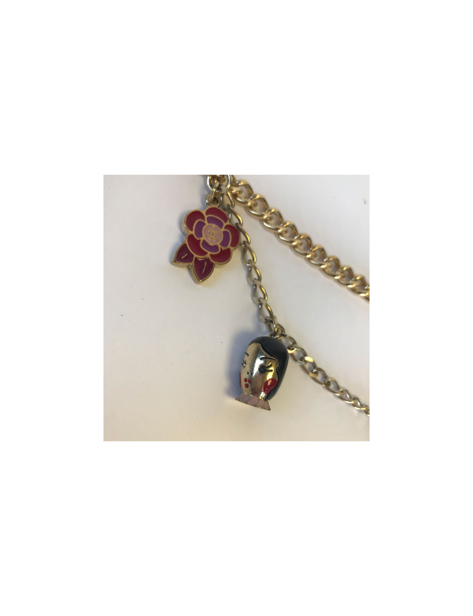 Ceinture sautoir Chanel issue de la Collection Paris Shanghaï, accessoire de défilé non signé. Bijouterie en métal doré à l’or fin, les petits accessoires tels que les poupées et les cc sont en résine noire, fuchsia, rouge. La ceinture est ajustable à toutes les tailles comprises entre 84 et 100 cm.