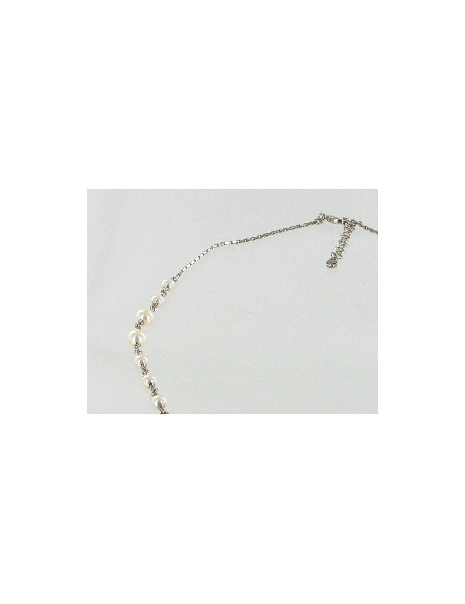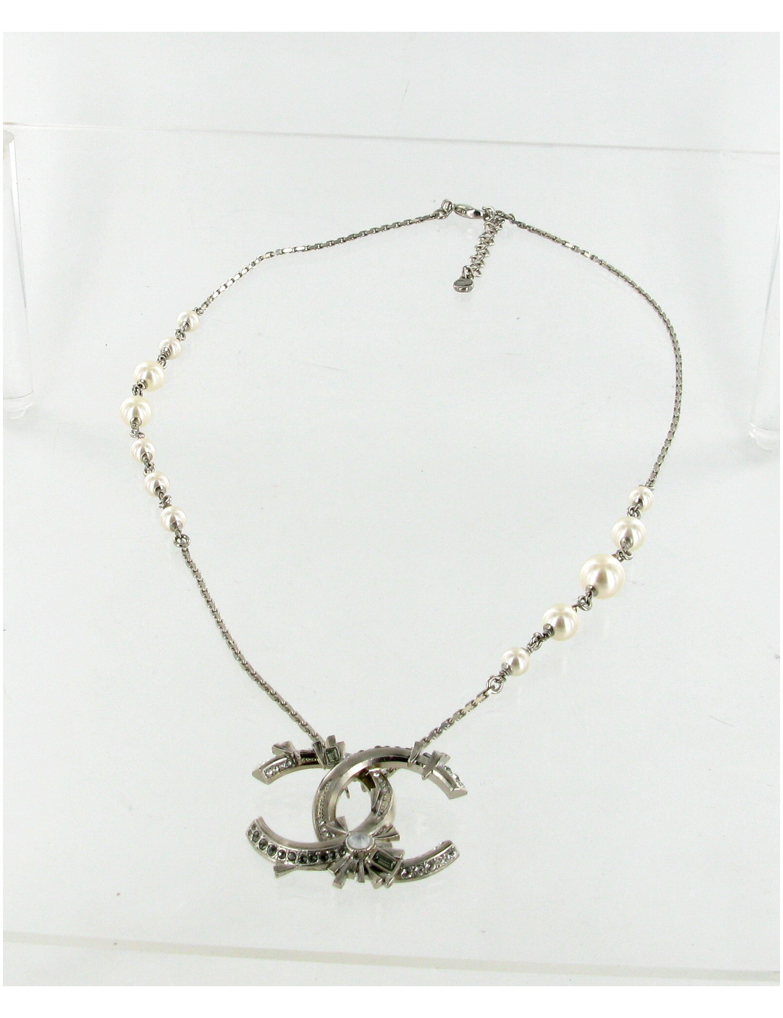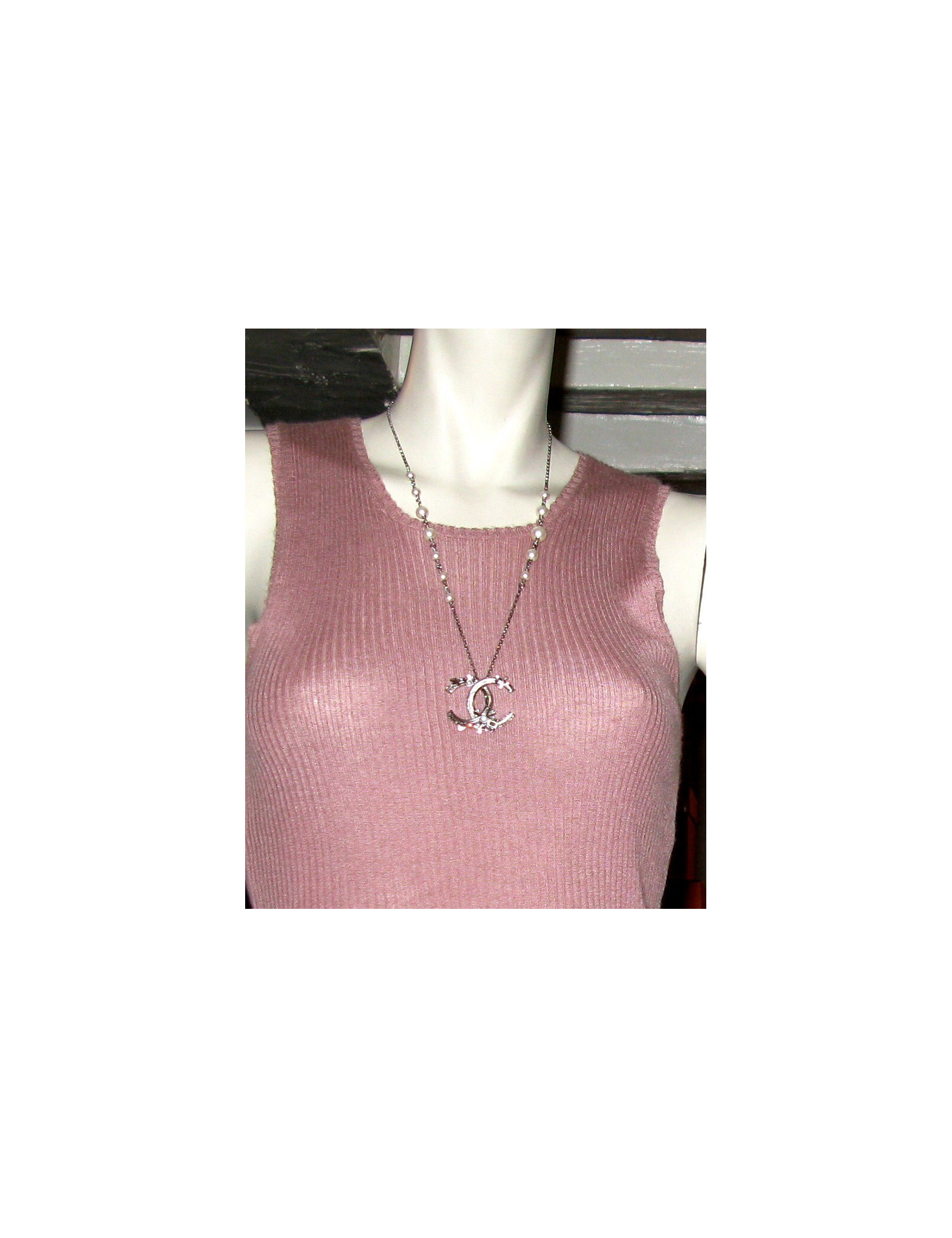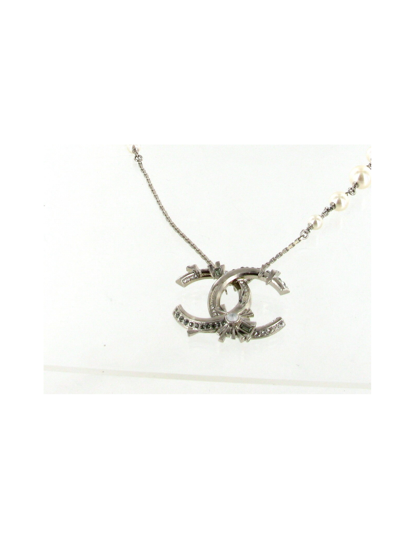 Sautoir CHANEL "CC" et perles nacrées blanches. La chaîne est en métal argenté. Le sigle "CC" a une double face, la première est sertie de strass la seconde est aussi sertie de strass mais se compose d"une petite perle nacrée blanche.