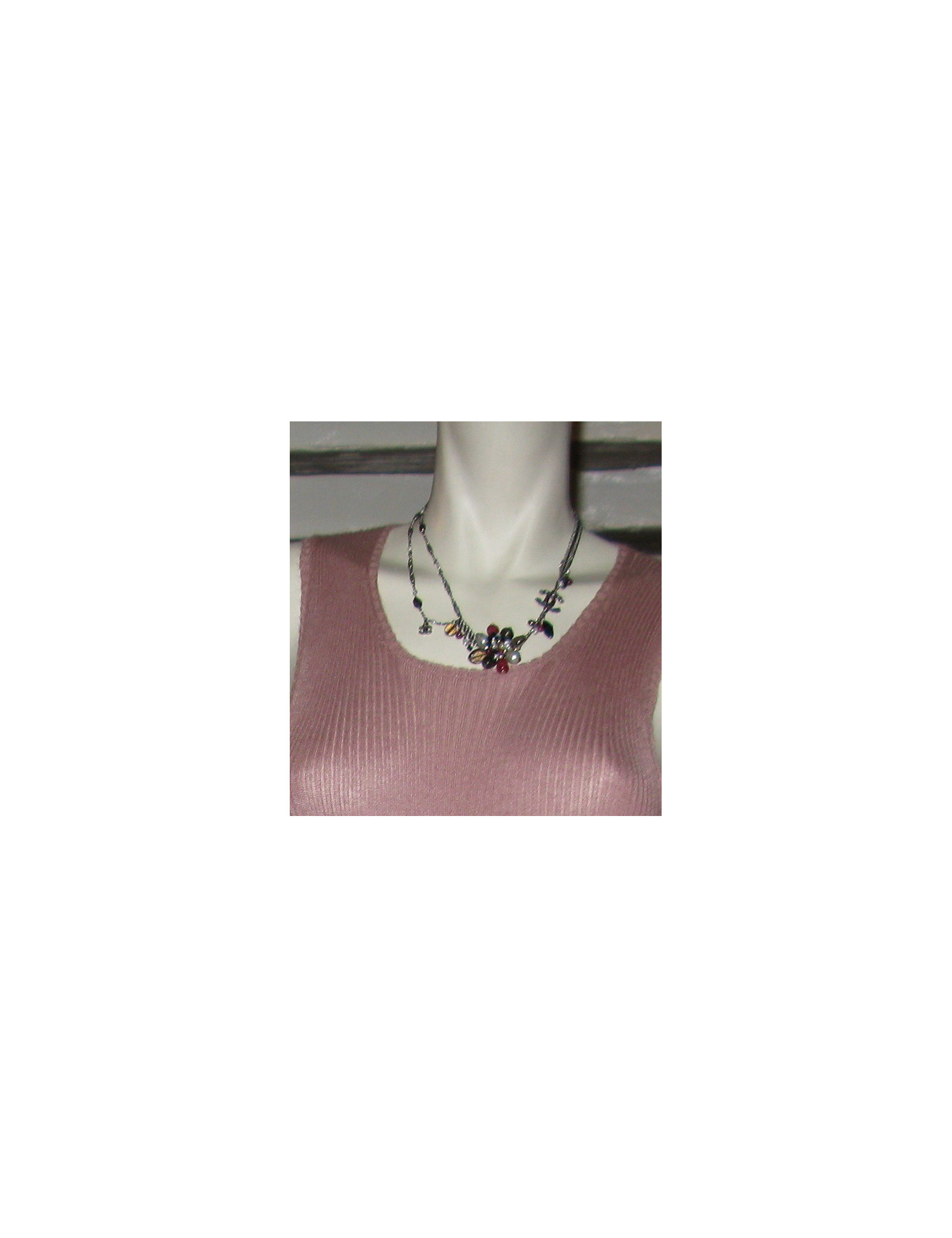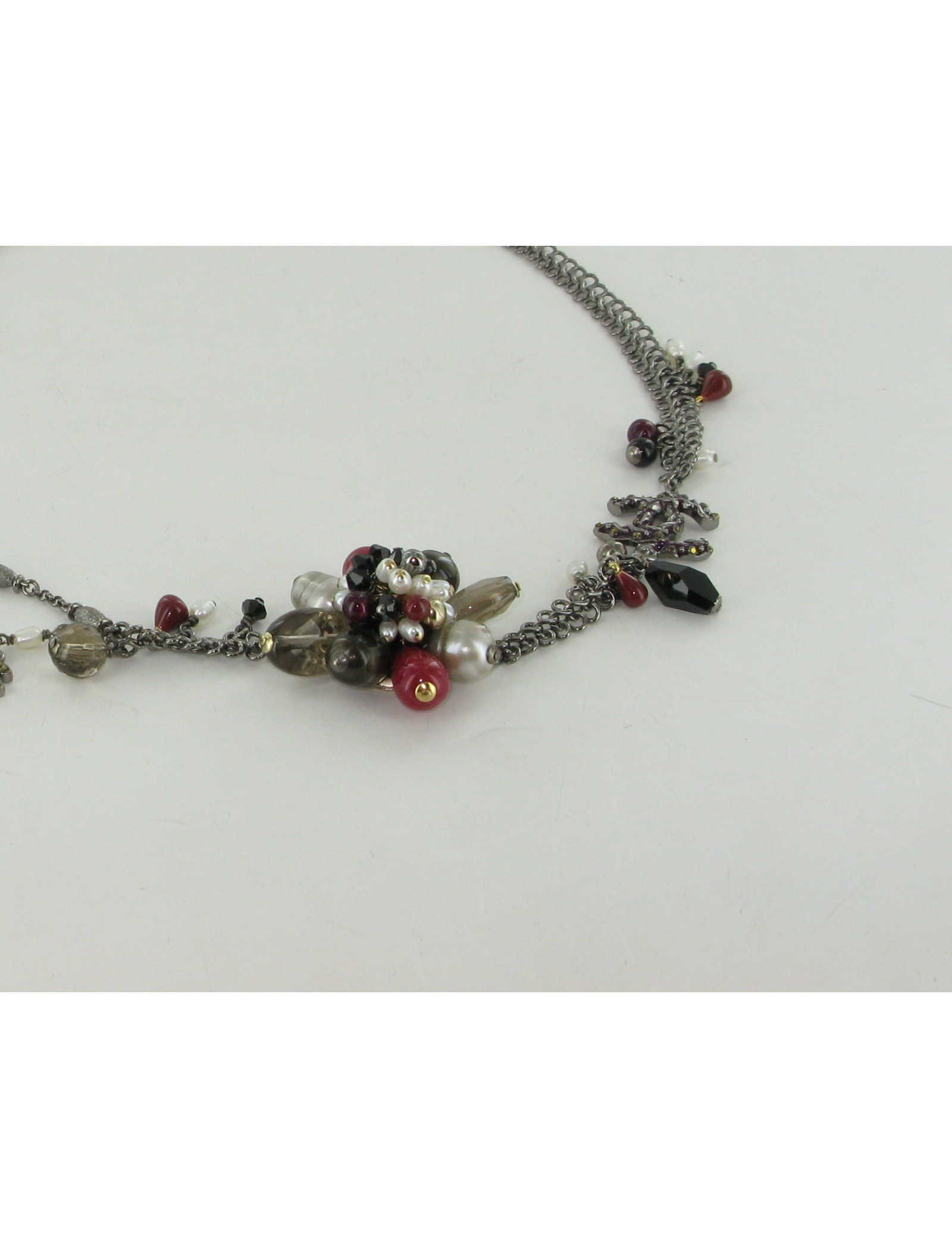 Ce collier court CHANEL est agrémenté d' un bijou en forme de fleur. La chaîne en métal argenté, avec des perles de couleur : rouge, blanche, argentée et noires. Chaque coté de la chaîne est serti d'un sigle CC. Le pendentif est composé des perles et révèle de joyeuses couleurs : rouge, ambre, blanche, gris perle.