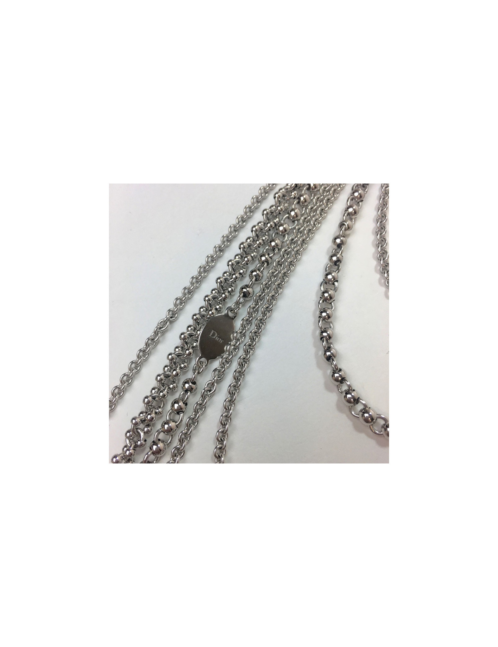 Beau sautoir Dior multi-rangs en métal argenté.