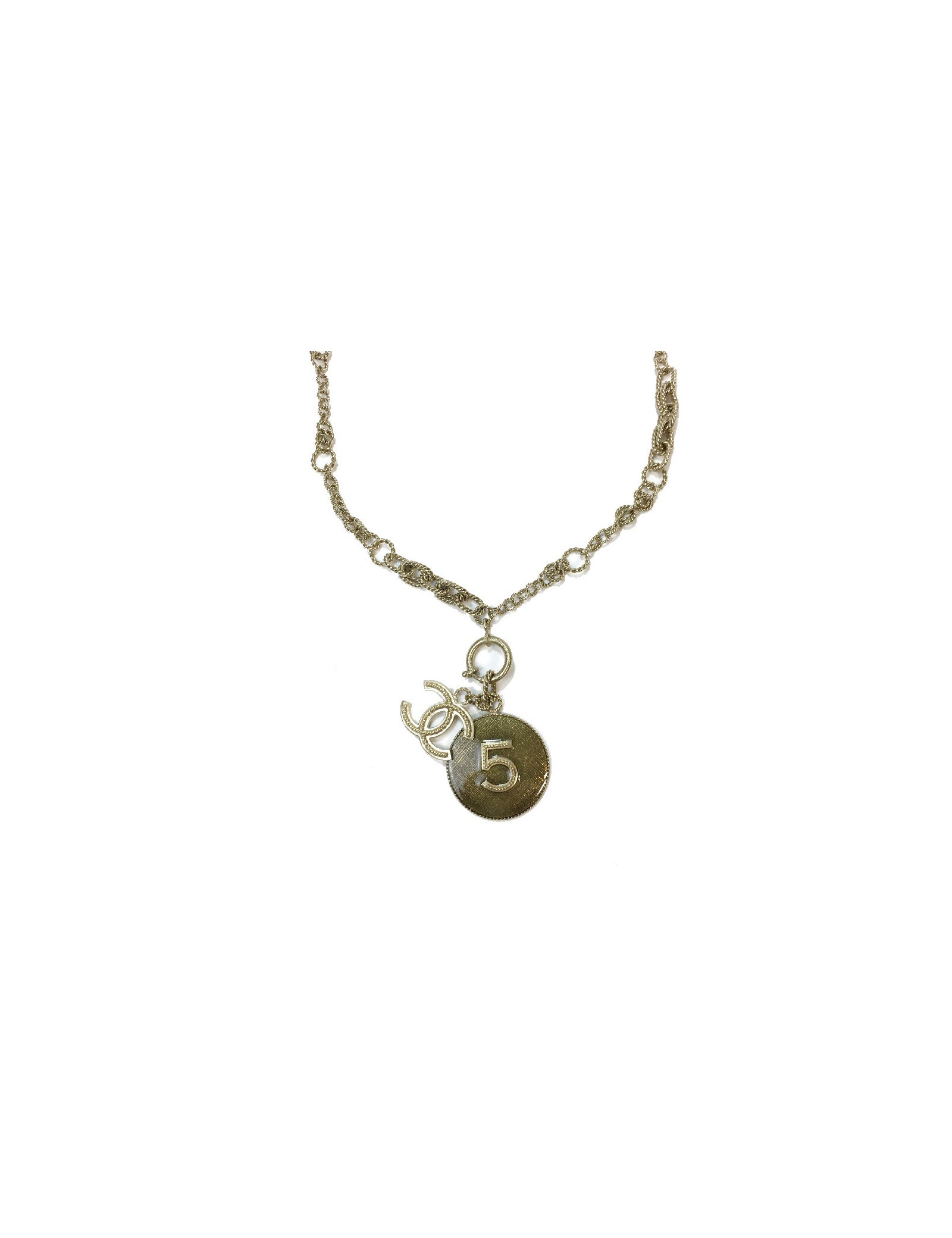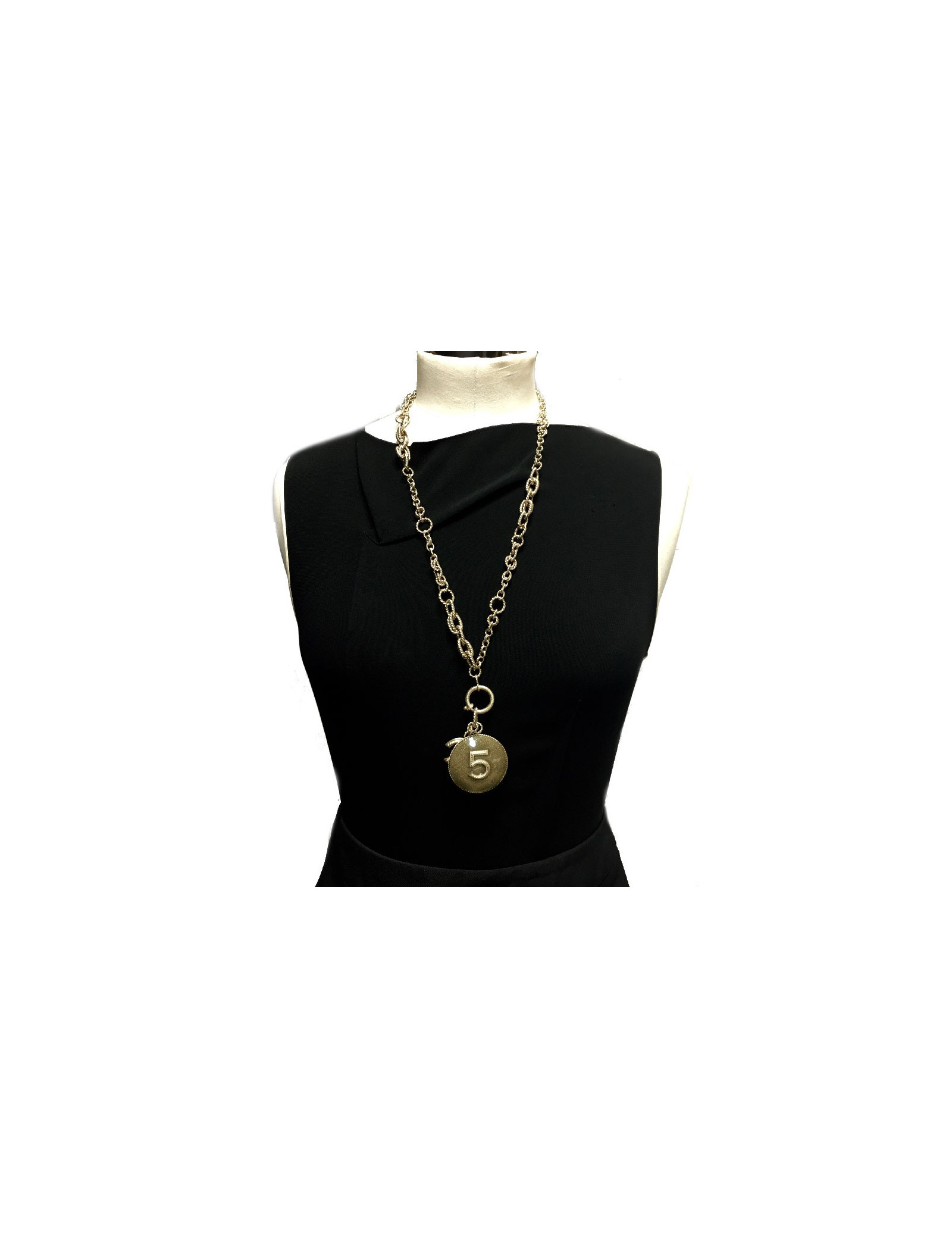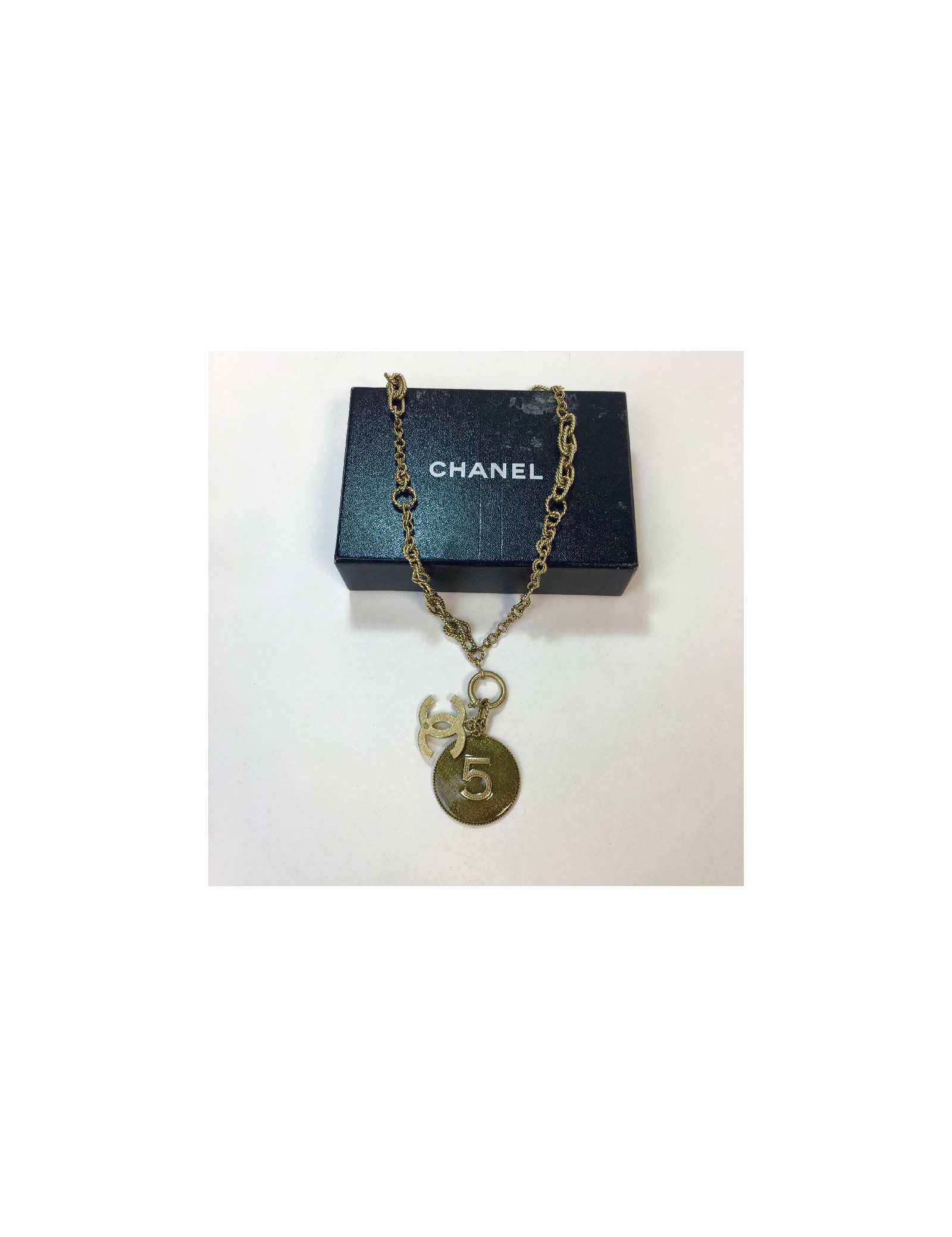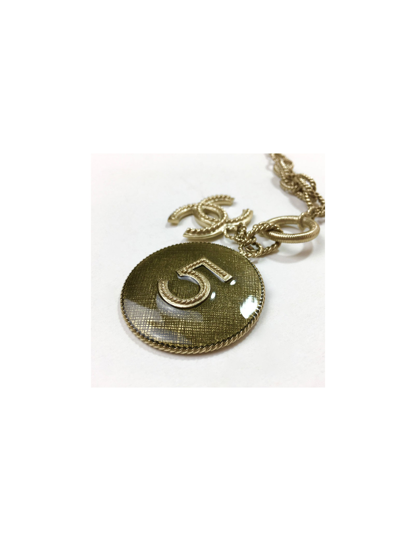 Collier Chanel pendentif N°5 en résine dorée et pailletée et CC doré, chaîne anneaux en métal doré or pâle.