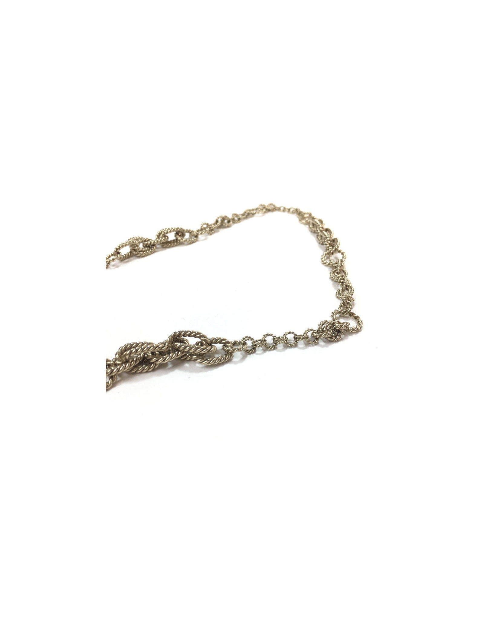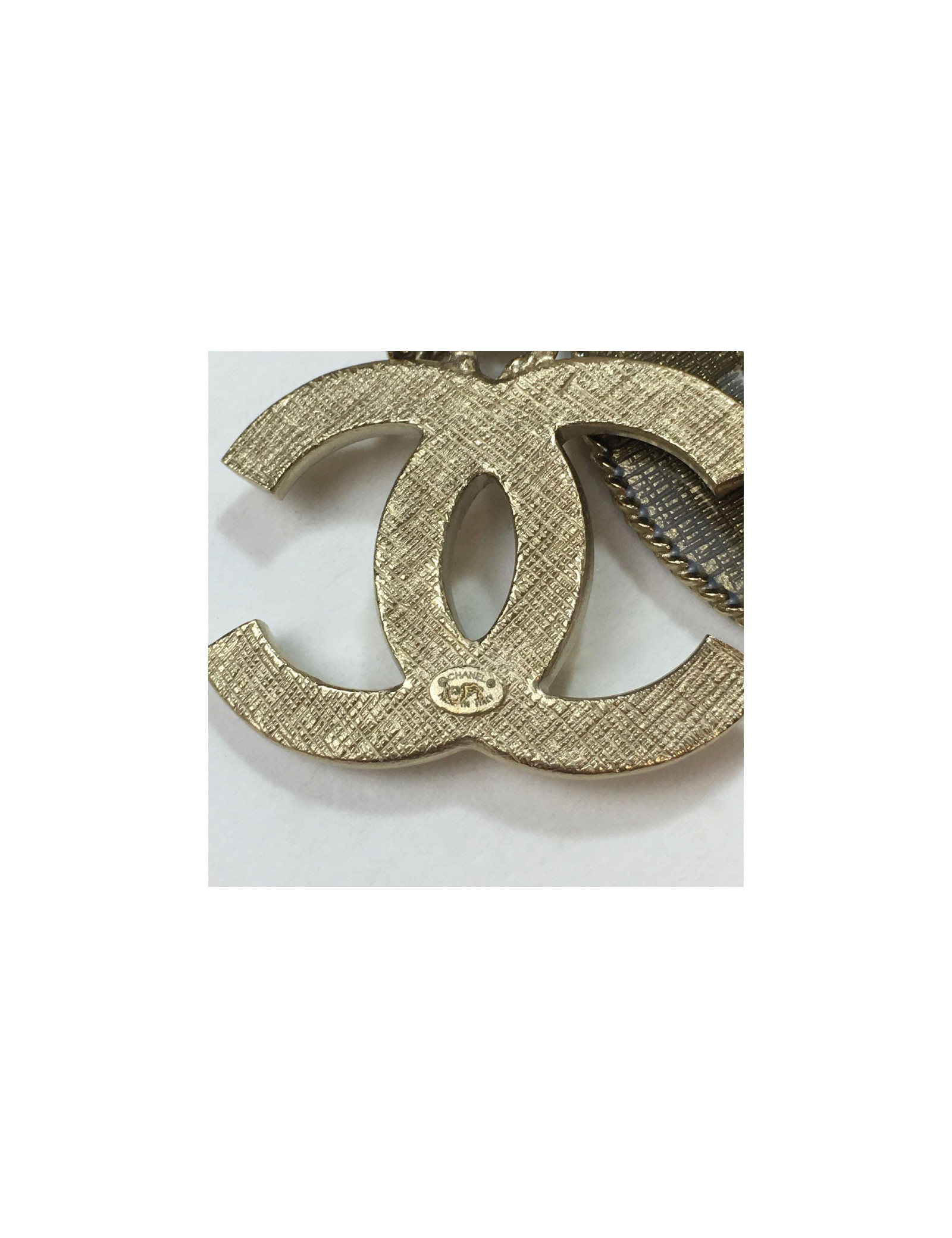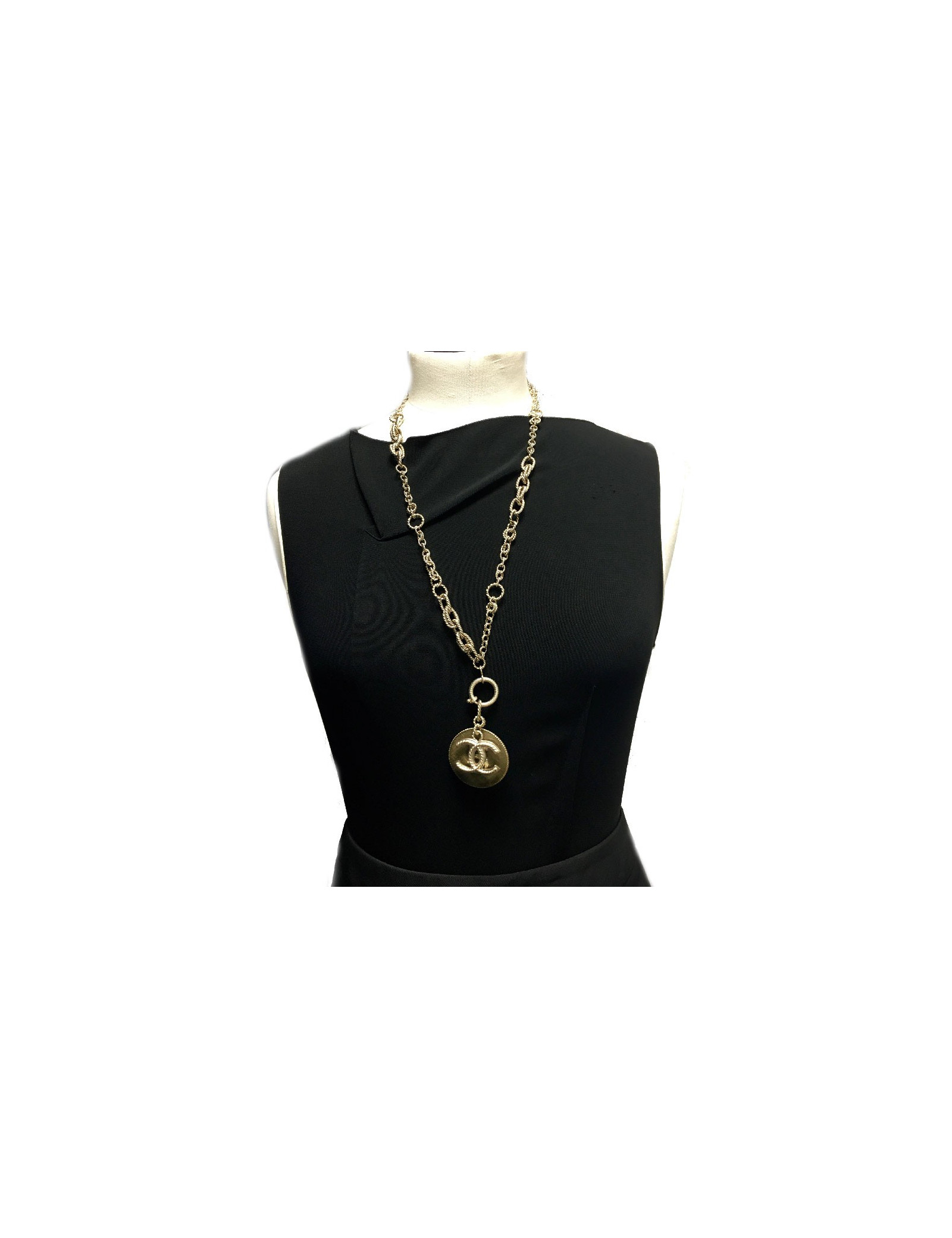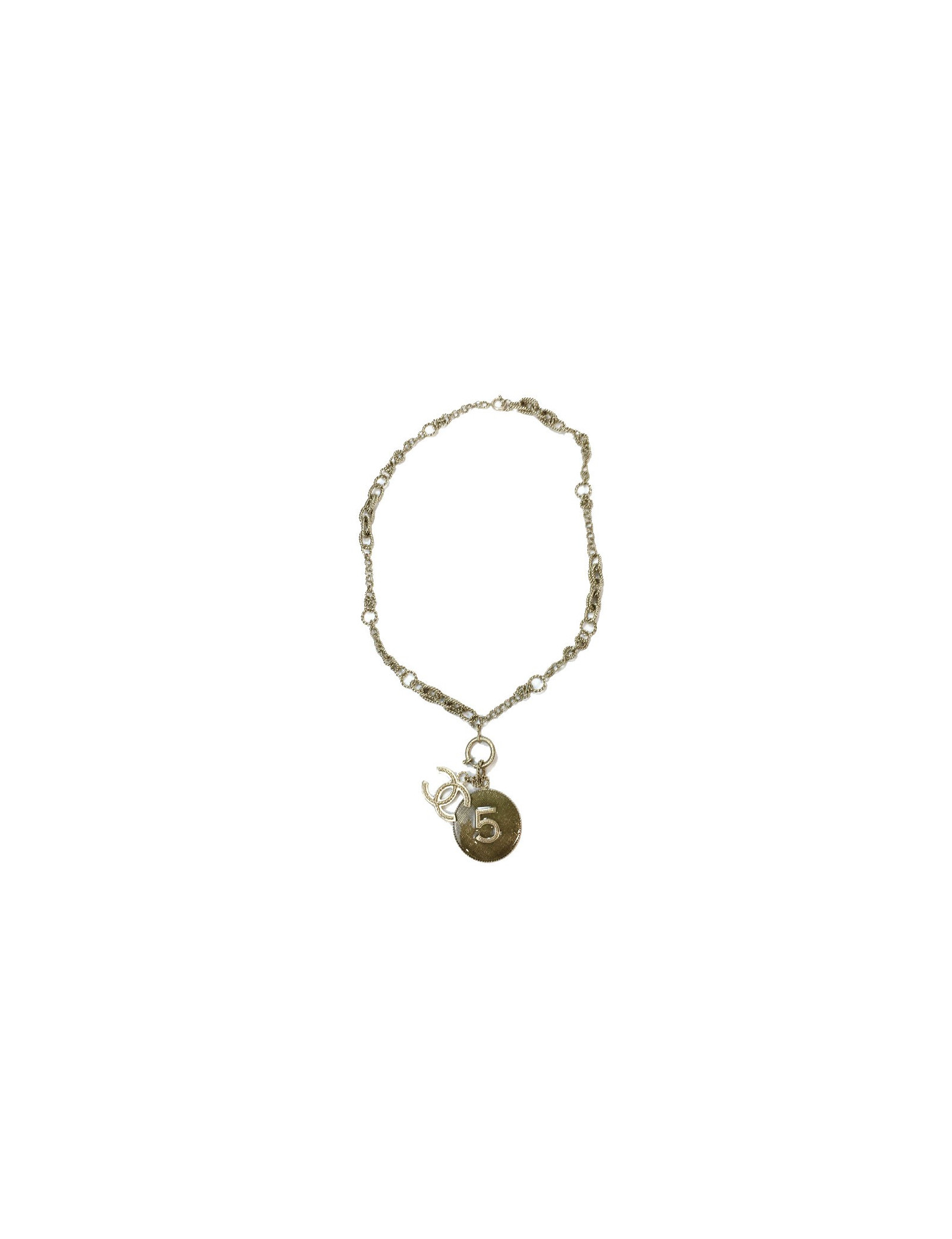 Collier Chanel pendentif N°5 en résine dorée et pailletée et CC doré, chaîne anneaux en métal doré or pâle.