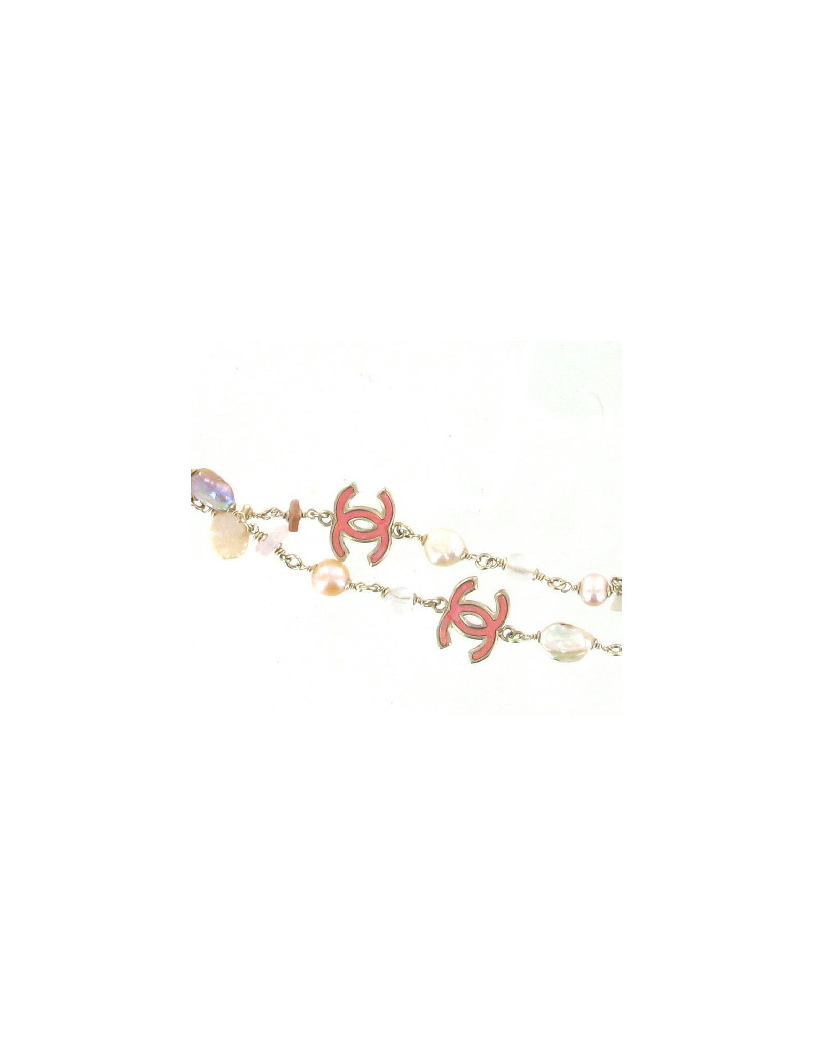 Ce sautoir CHANEL aux couleurs estivales rose pâle, blanc et doré. Il est composé de perles d'eau douce et de perles de différentes tailles, formes plates et CC à effet miroir multicolore. La chaîne est en métal doré brillant ainsi que les sigles "CC". Ces derniers changent de couleurs à la lumières (rose, jaune, bleu). Livré dans un joli pochon.
