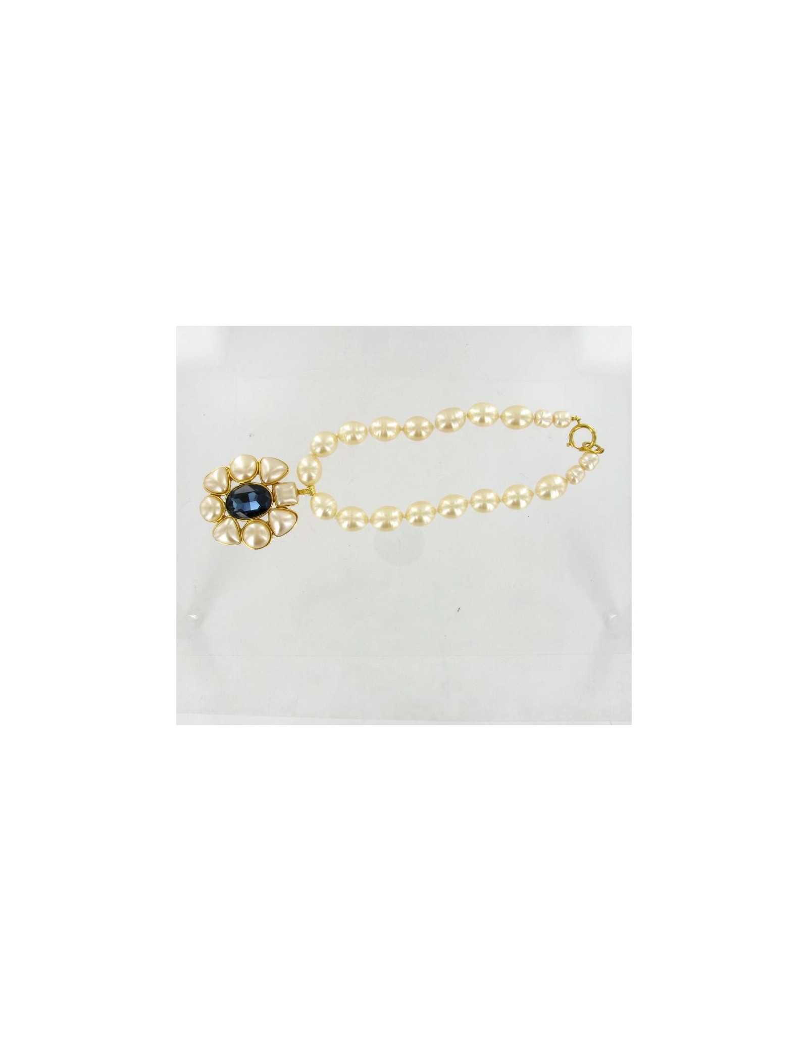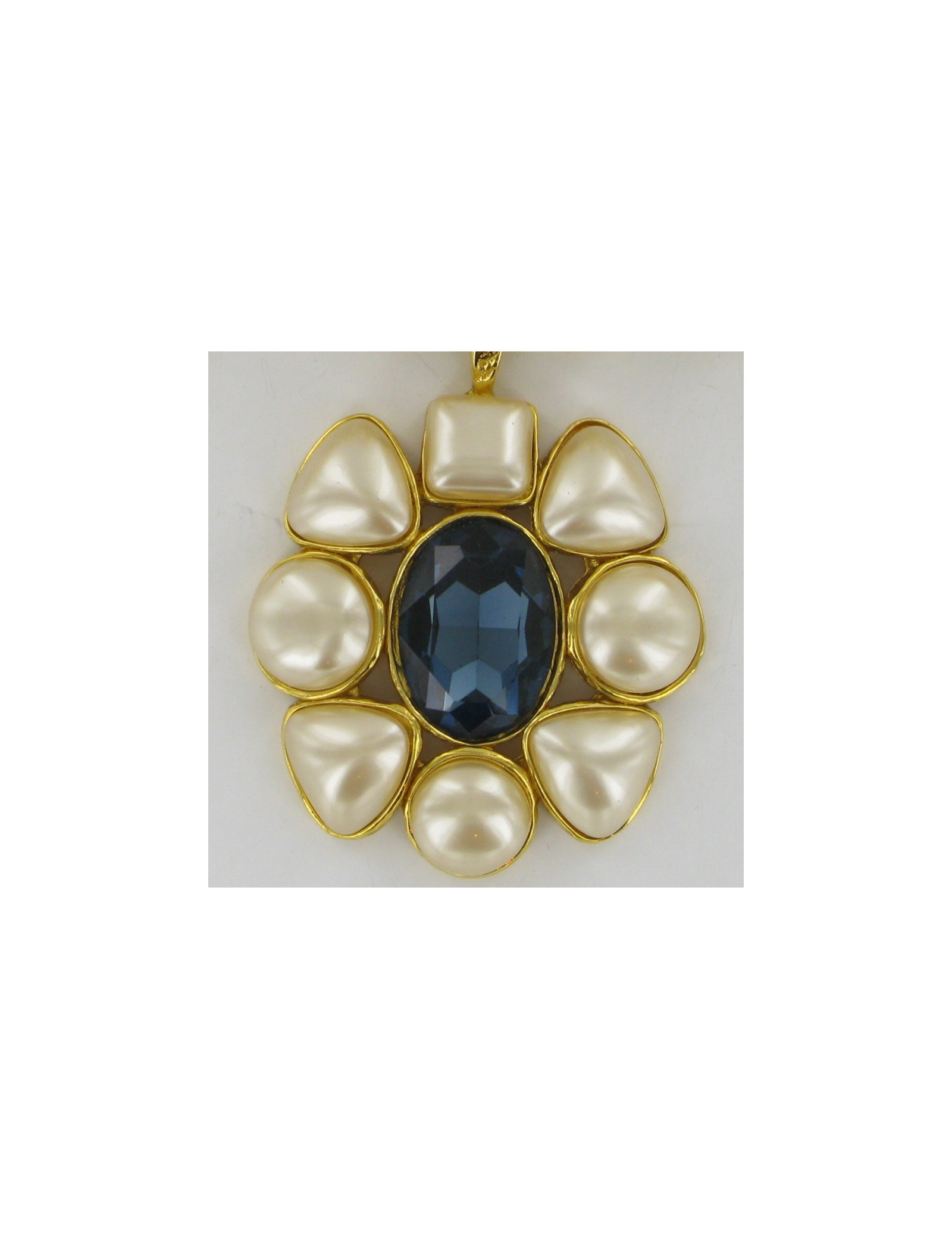 Bijou doré serti de perles en pâte de verre nacrée et d'un cabochon bleu Swarovski