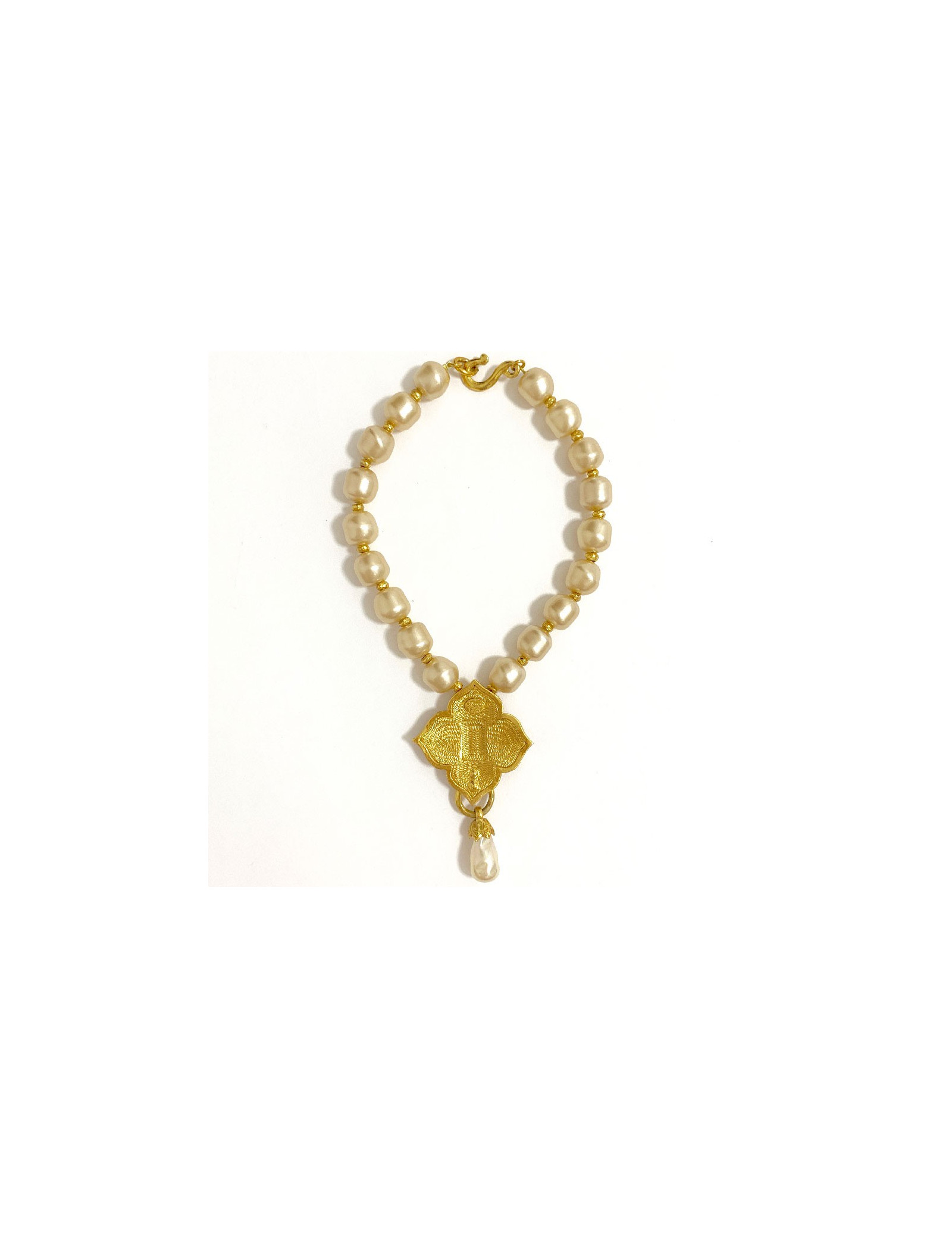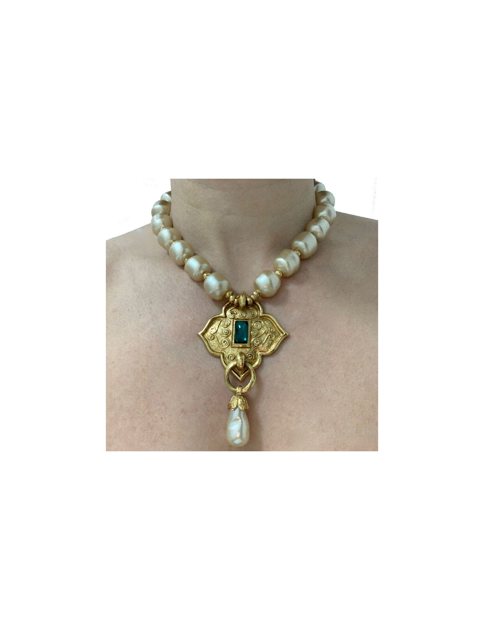Ses dimensions : longueur totale (perles+fermoir) : 21 cm, taille du pendentif (métal + perle) : 5,5x9,5 cm. Taille des perles : 1,5 cm