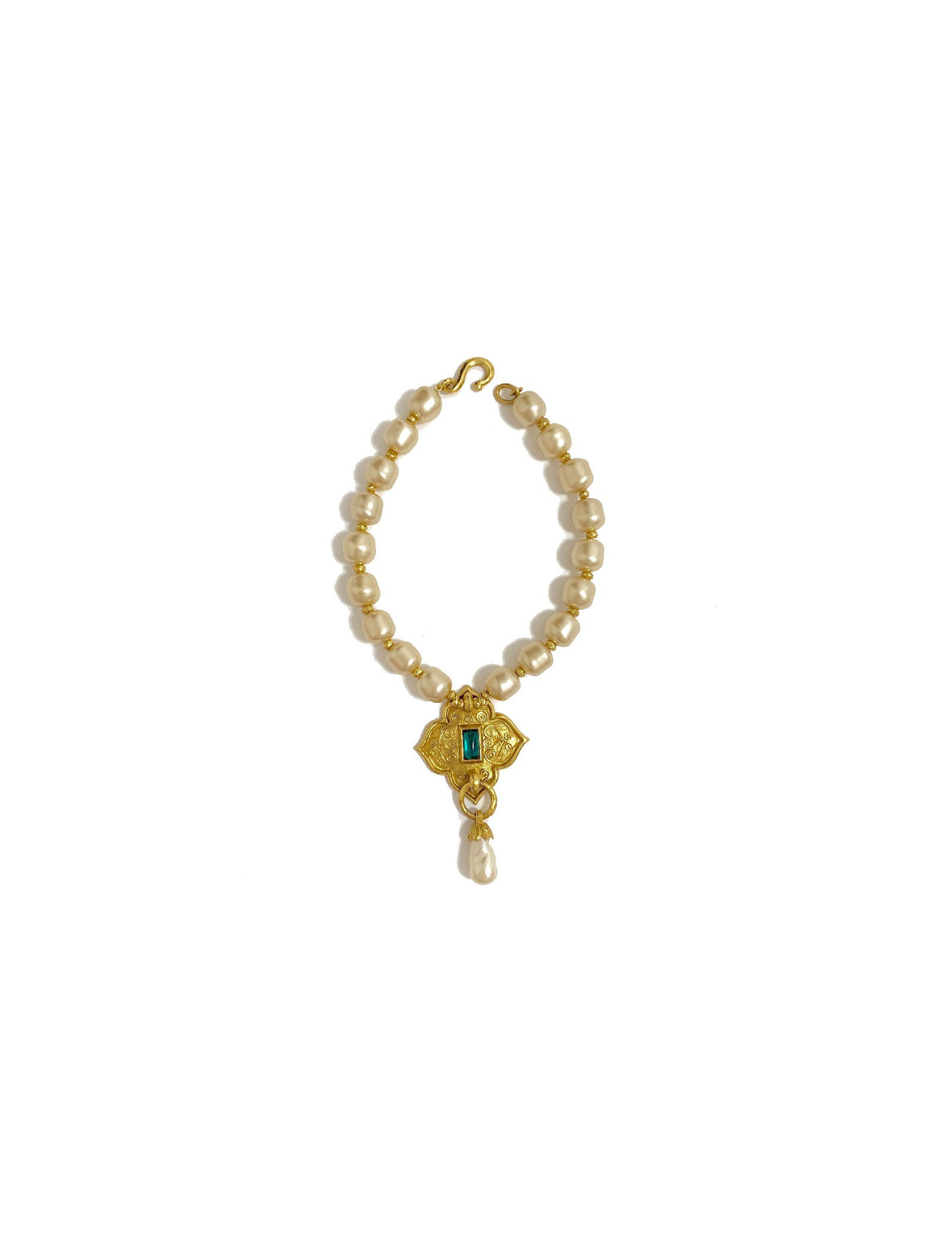 Très beau collier Jean Louis SCHERRER vintage. Il est fait de grosses perles carrées nacrées, d'un pendentif en métal doré serti d'une pierre fantaisie couleur émeraude et d'une perle goutte. Le fermoir est un fermoir crochet en métal doré.