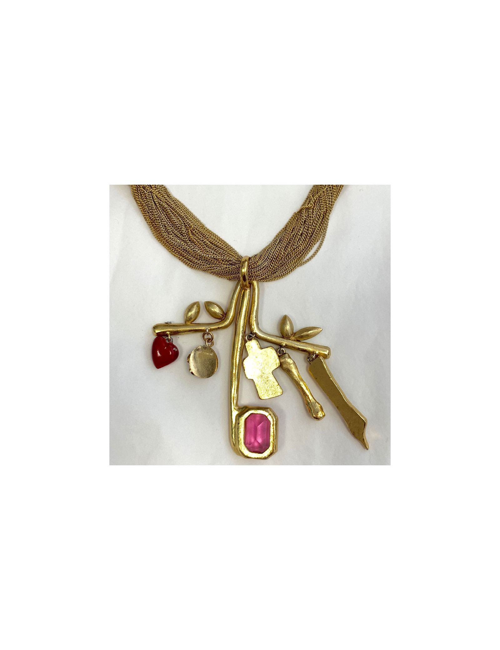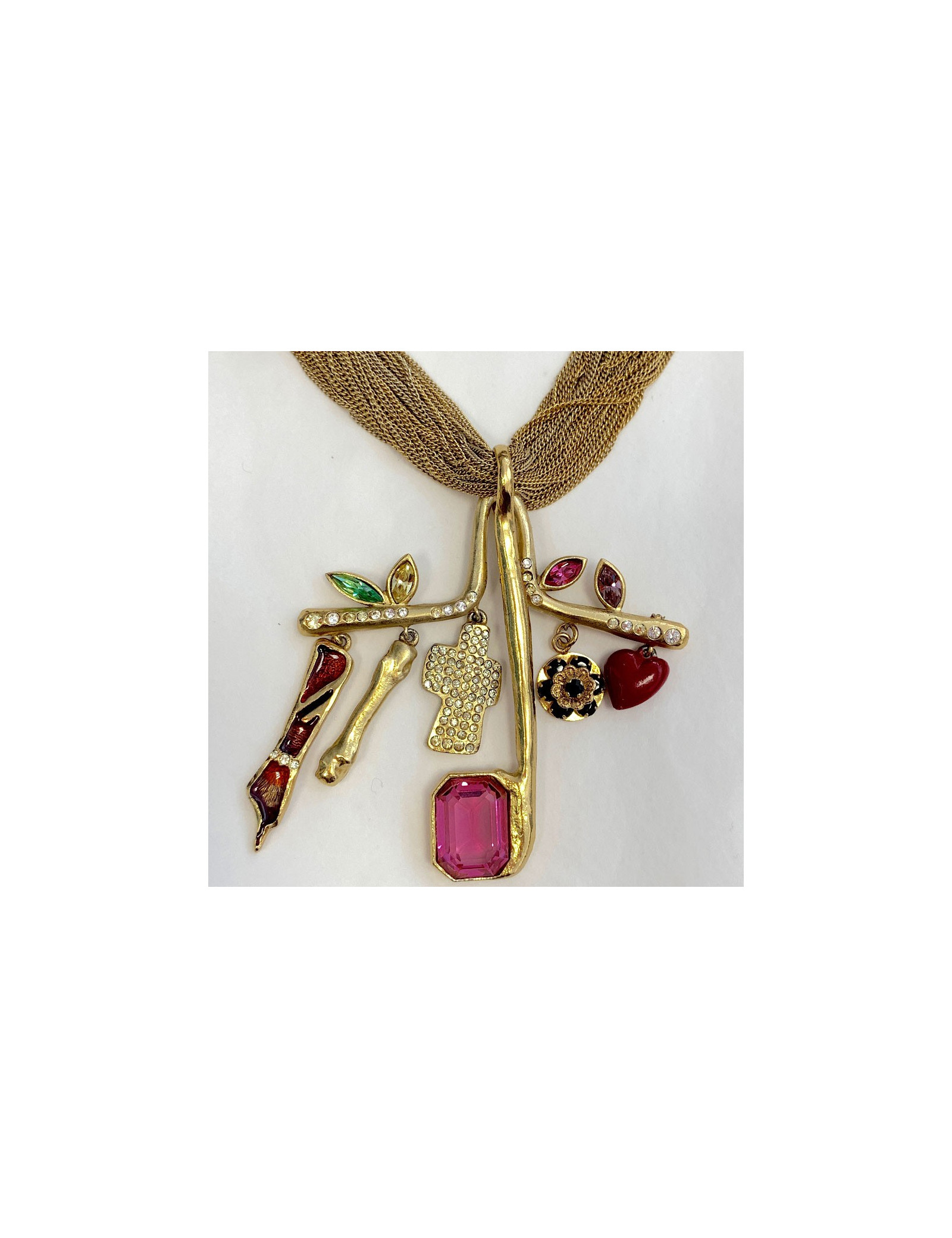 Original et tendance, collier CHRISTIAN LACROIX composé de multi chaines fines en métal doré, agrémenté d'un pendentif en métal or mat composé de charms. Les charms (coeur, croix...) sont sertis de strass, pierre fantaisie rose.