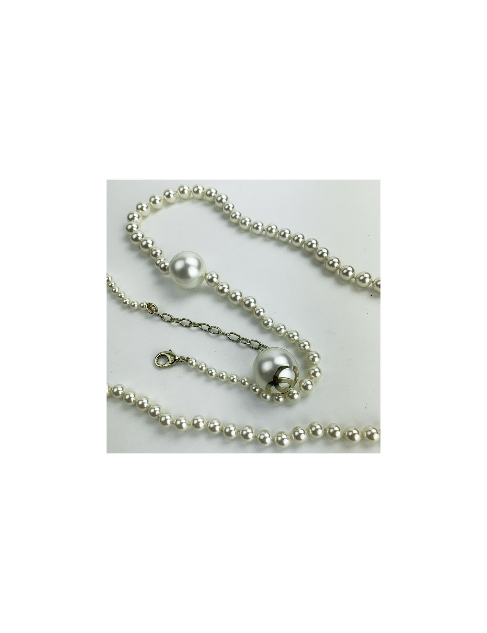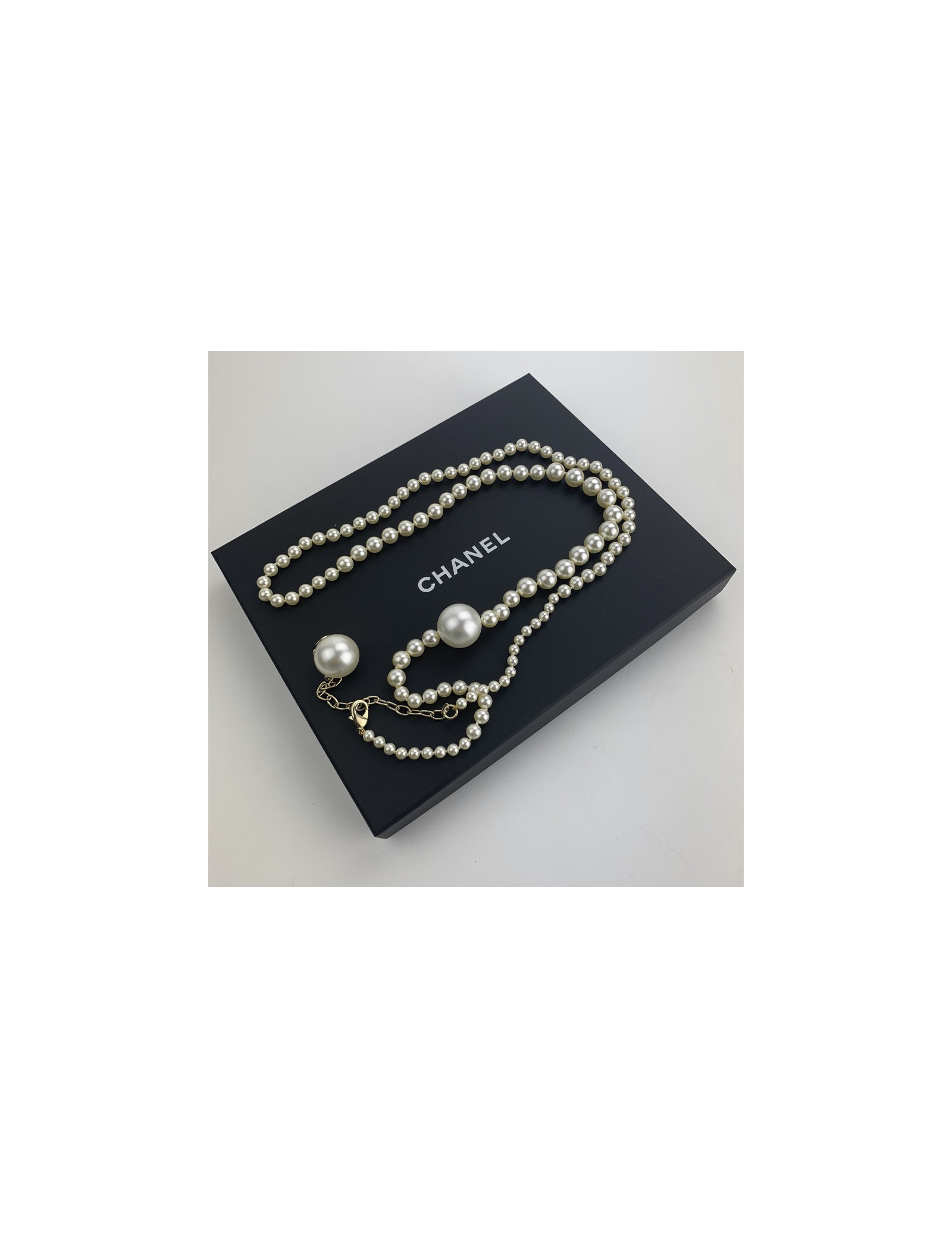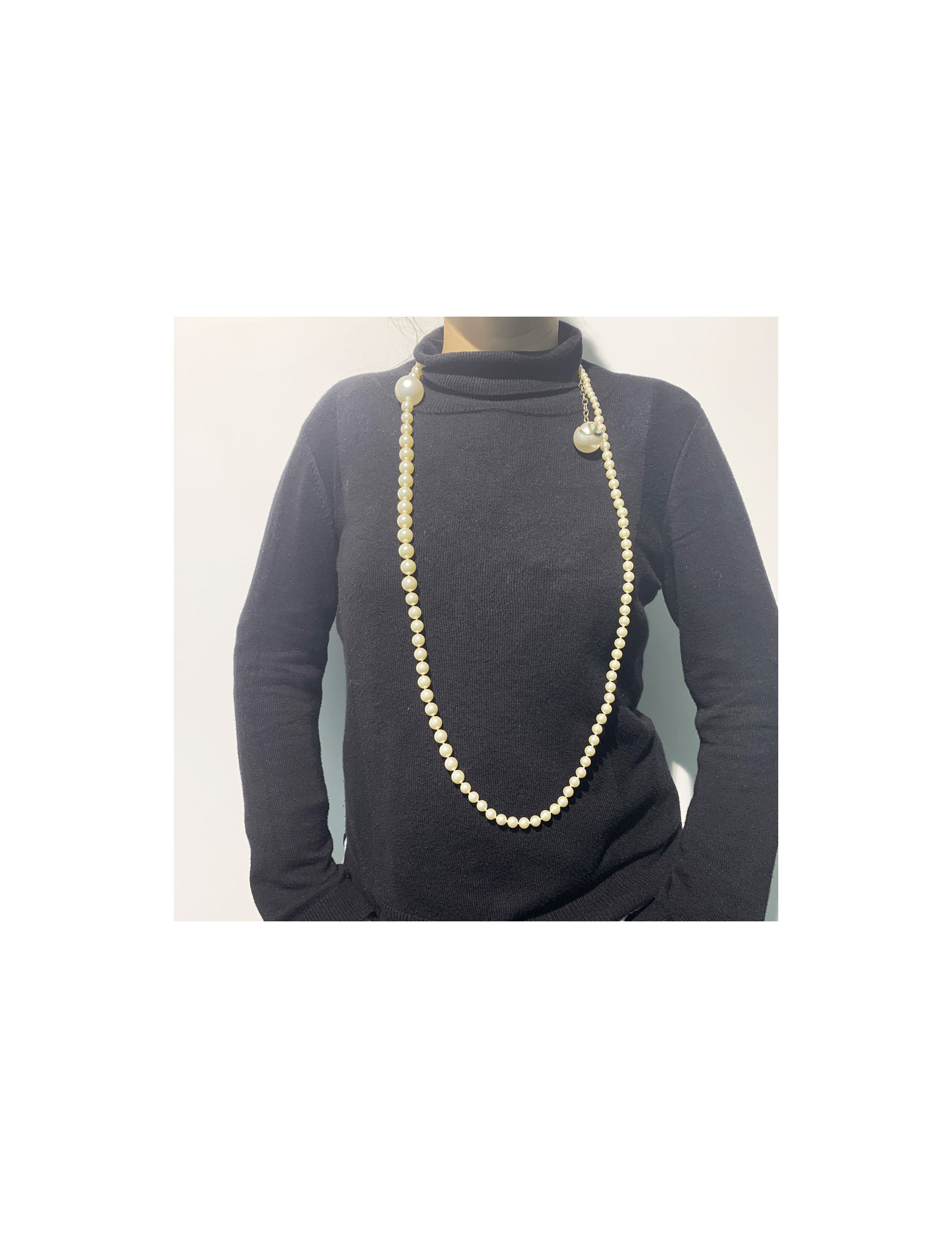 Ce sublime sautoir a été créé par la maison CHANEL. Il est composé d'un rang de perles de trois tailles différentes dont deux maxi-perles qui font l'originalité du collier. La dernière perle est ornée d'un double CC doré. Le sautoir CHANEL est un bijoux iconique de la maison parisienne. Gabrielle CHANEL aimait le marier à de simples marinières, à des vestes en Tweed ou même le porter sur une tenue de cavalière. Chez Valois Vintage Paris, nous voulons penser que ce collier, emblème du style Coco, accompagnera vos moments les plus précieux.