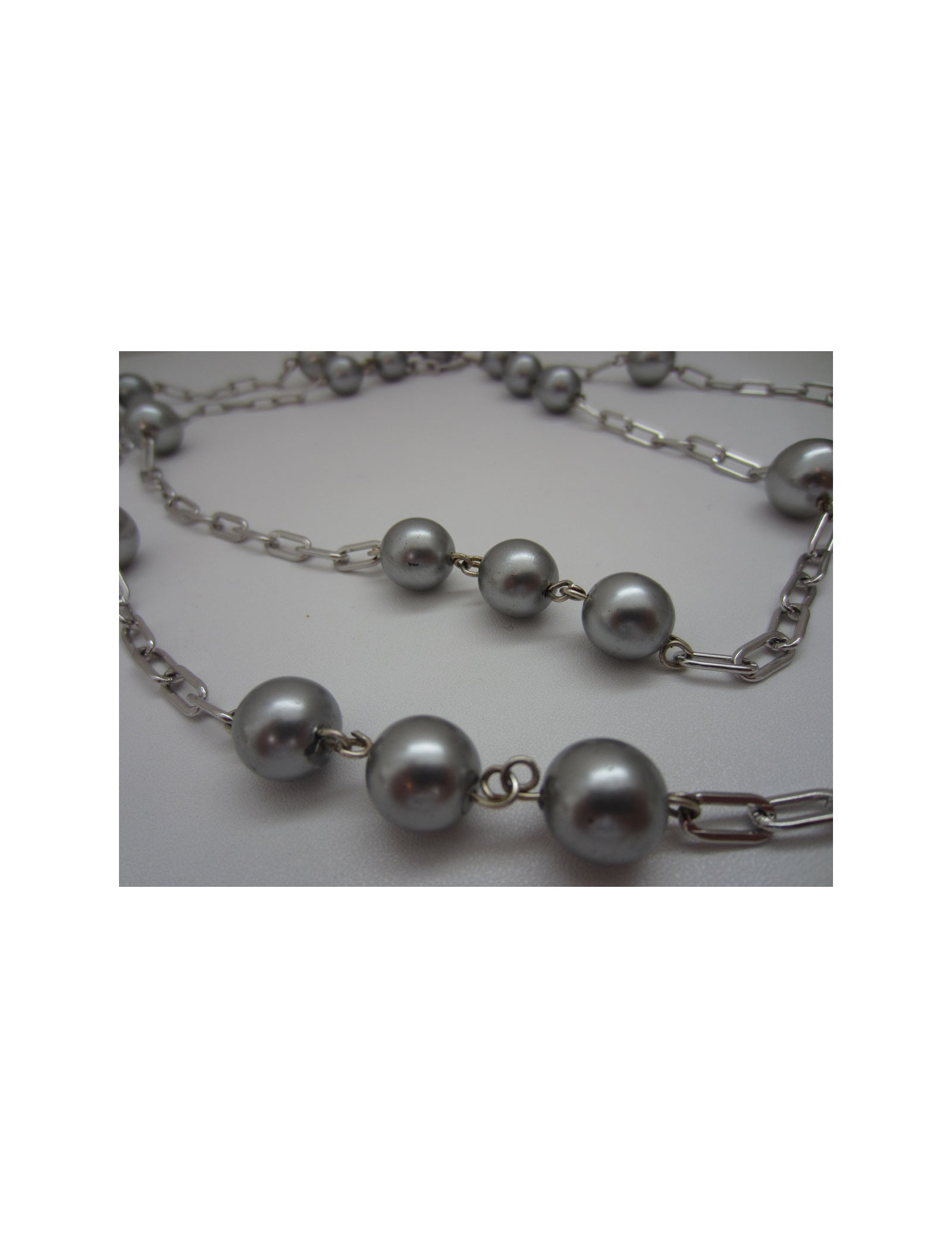 Élégant sautoir Marguerite de Valois en perles nacrées grises et chaine en métal argenté.