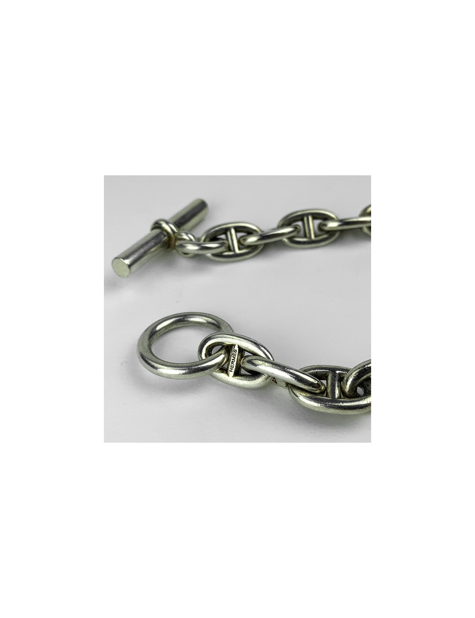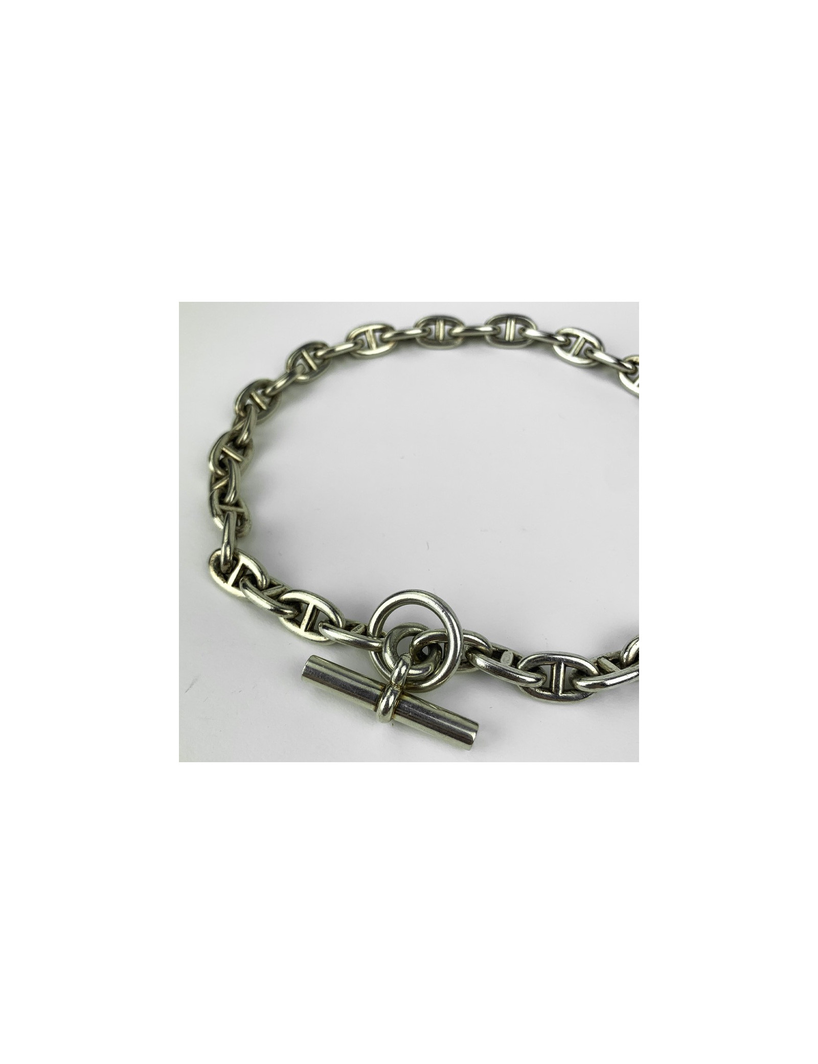 Le collier est en très bon état. Il mesure une longueur totale de 43 centimètres et comporte 36 maillons en argent 925. Présence de la marque HERMES gravée dans l'argent.