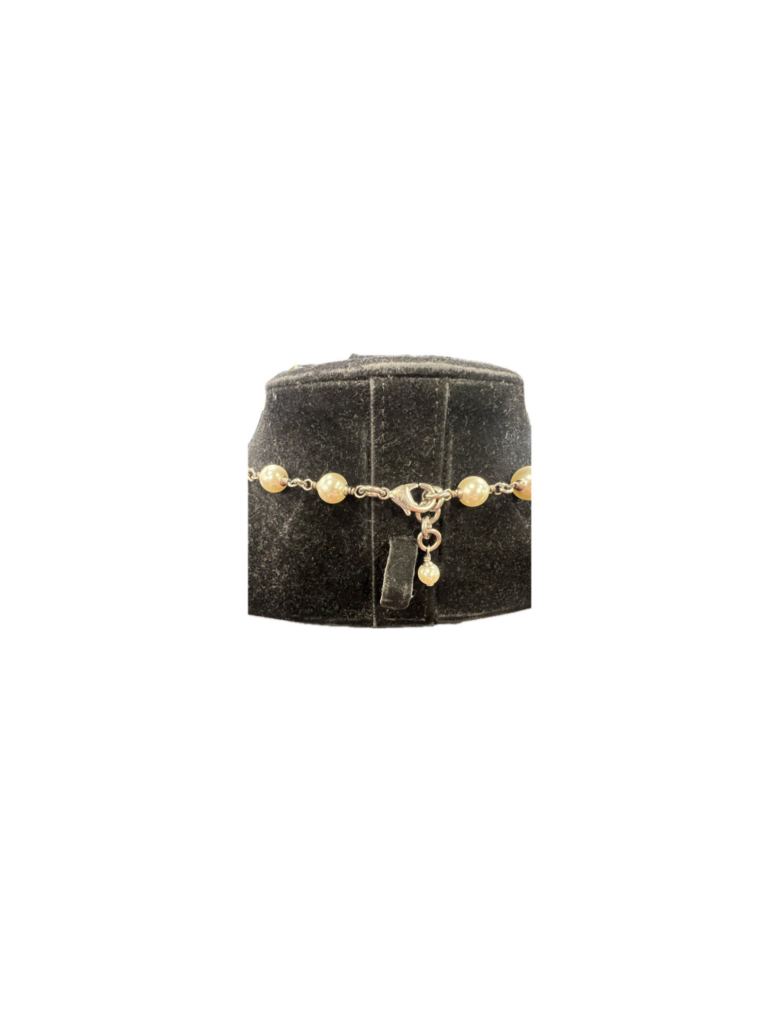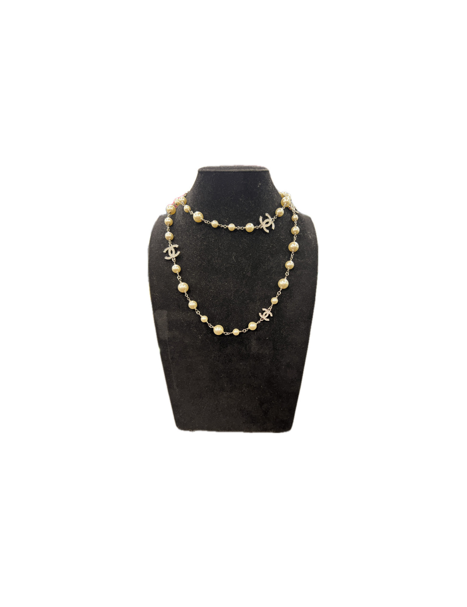 Détails : ce long sautoir Chanel est en métal argent, perles nacrées et CC en strass. Il est reversible à l'identique de chaque côté. Il peut être porté long ou en double. Stamp sur le fermoir mousqueton.