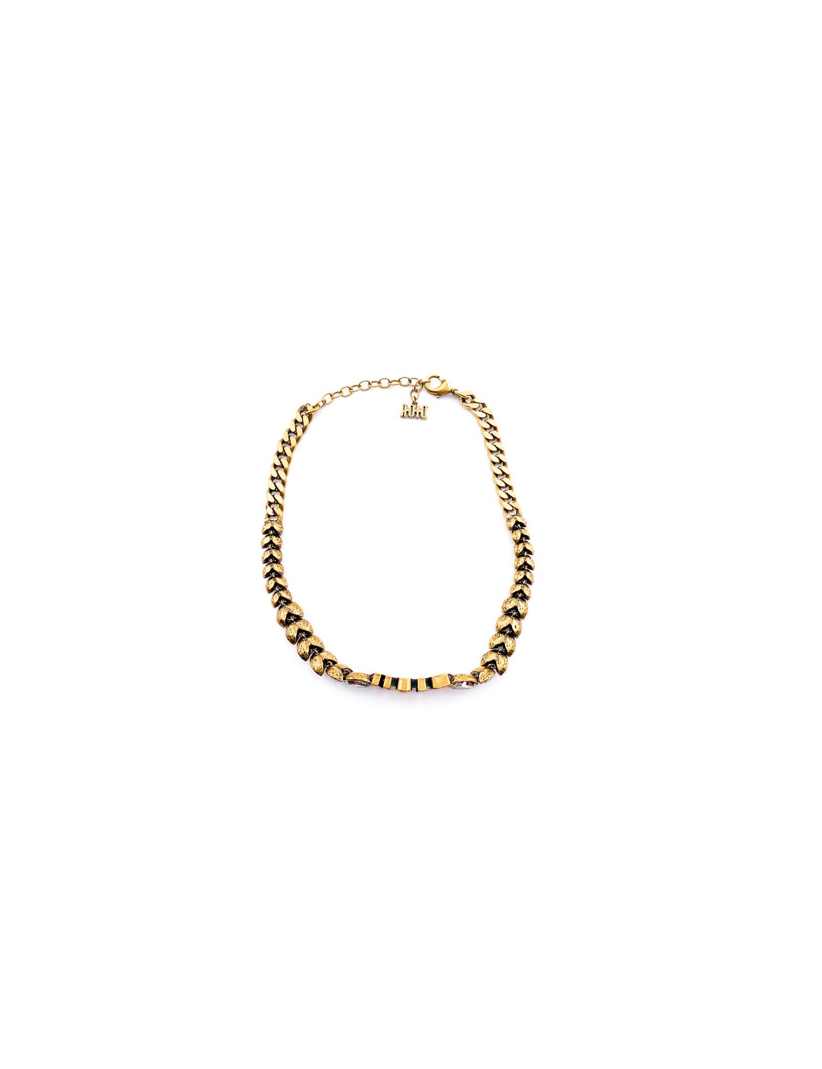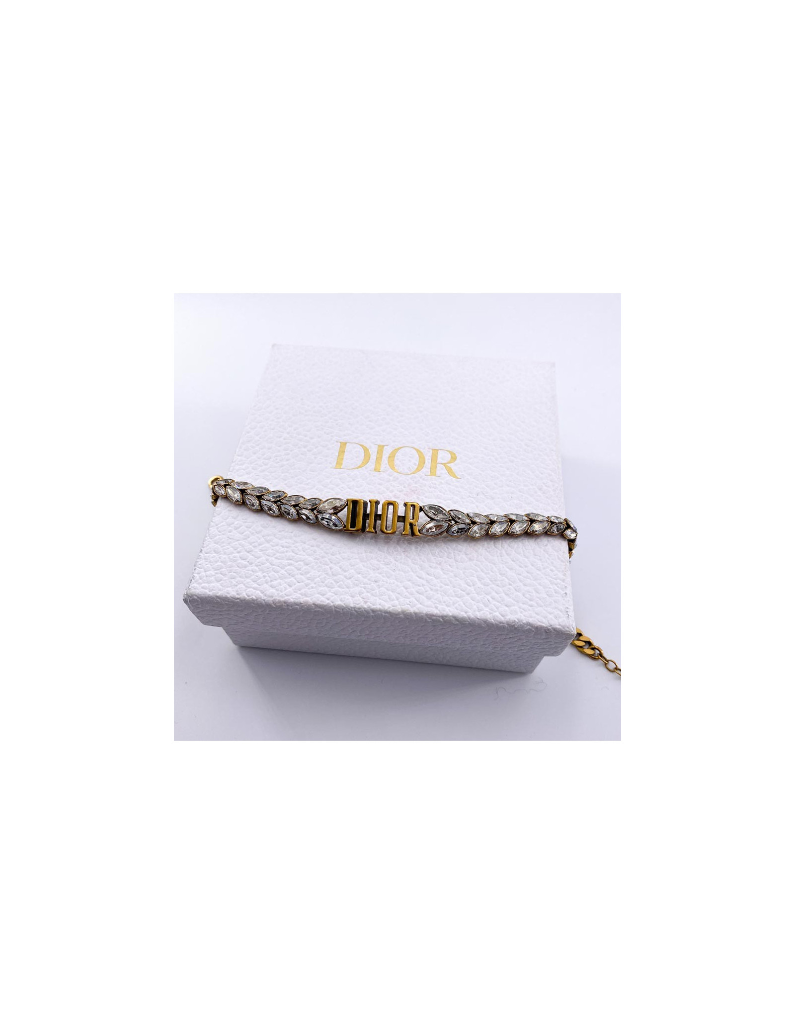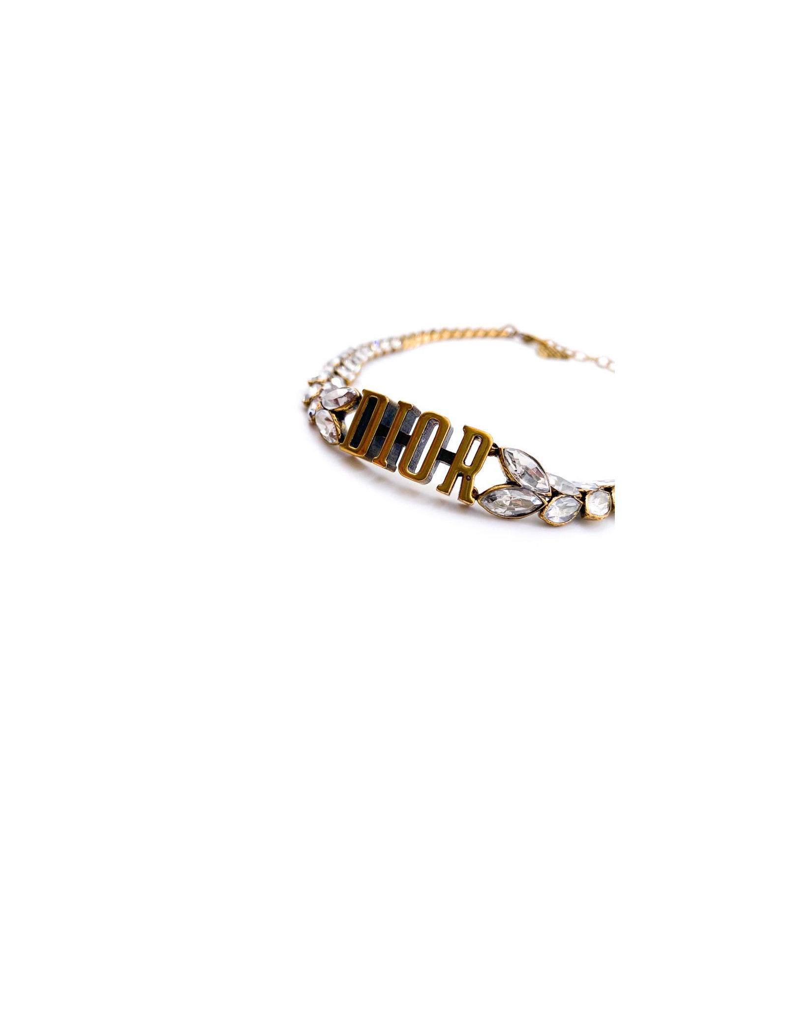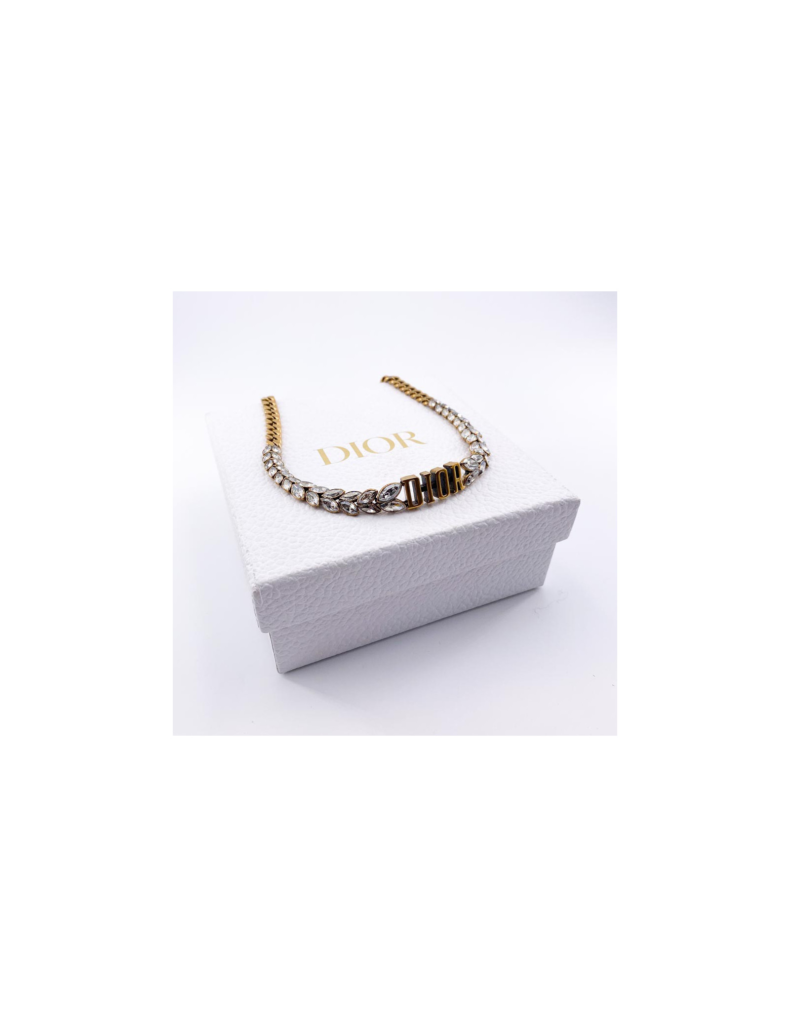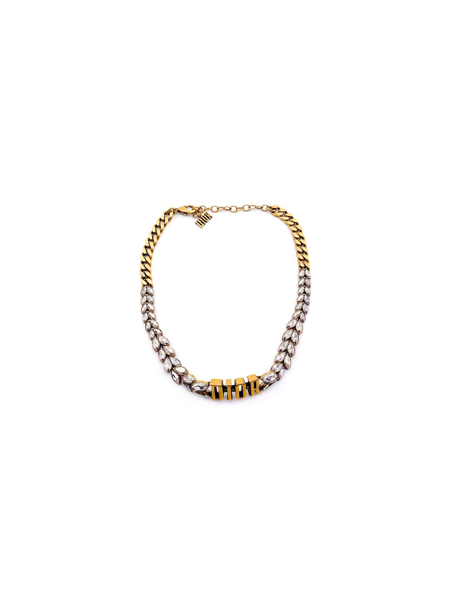 Le collier est de la Maison DIOR. Il se compose d'une chaîne en métal doré vieilli, sertie de strass. L'inscription DIOR prend place au centre du collier. Le bijou est à porter avec les créoles DIOR ref 28624. Retrouvez tout l'esprit DIOR dans ce bijou !
