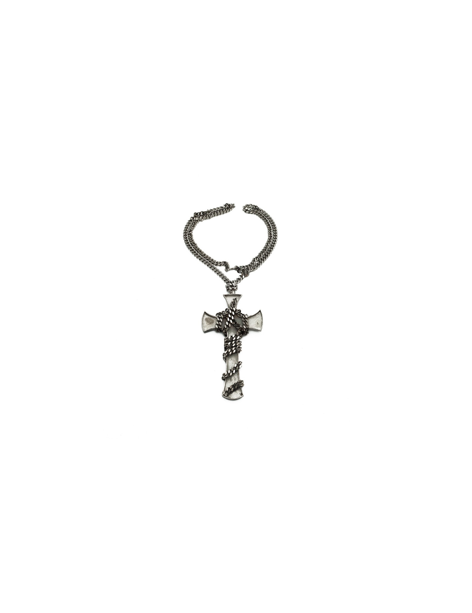 Unique pièce croix enchainée Couture Marguerite de Valois, en métal argent vieilli. Bijoux exclusivité de Valois Vintage Paris. Cette croix fantaisie est unisex. Jamais portée.