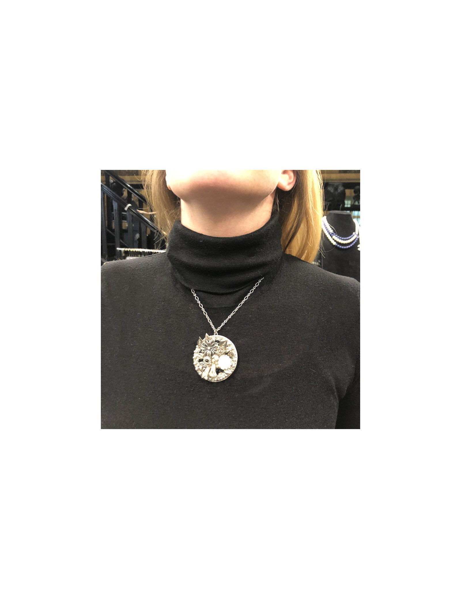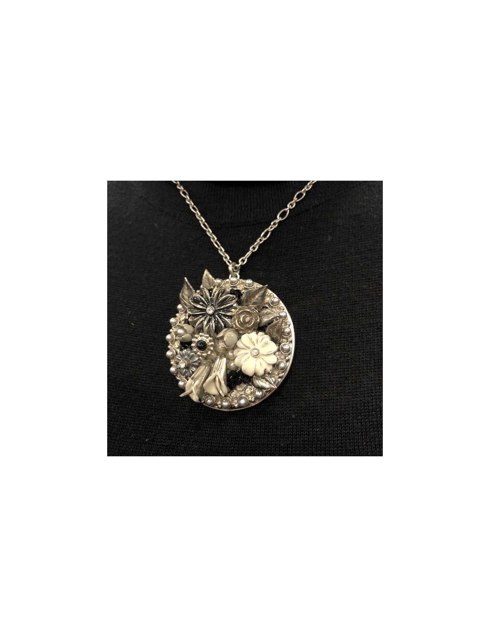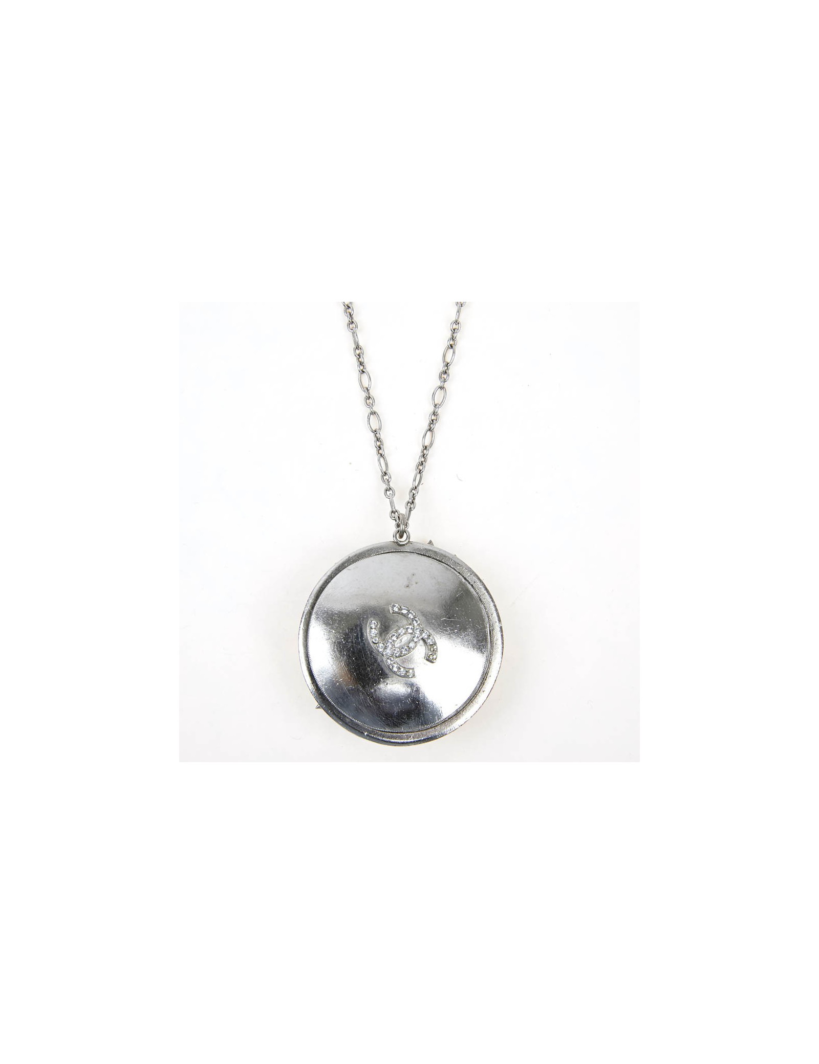 Petit collier CC en métal couleur argenté avec son pendentif double face. Une face avec l'emblématique CC serti de strass. La deuxième face du médaillon est un jolie composition florale faite de rose, de marguerites, entourées de perles grises. Le coeur des fleurs est un petit strass pour plus de brillant. La longueur de la chaine à l'attache est de 44 cm. Il est en très bon état.