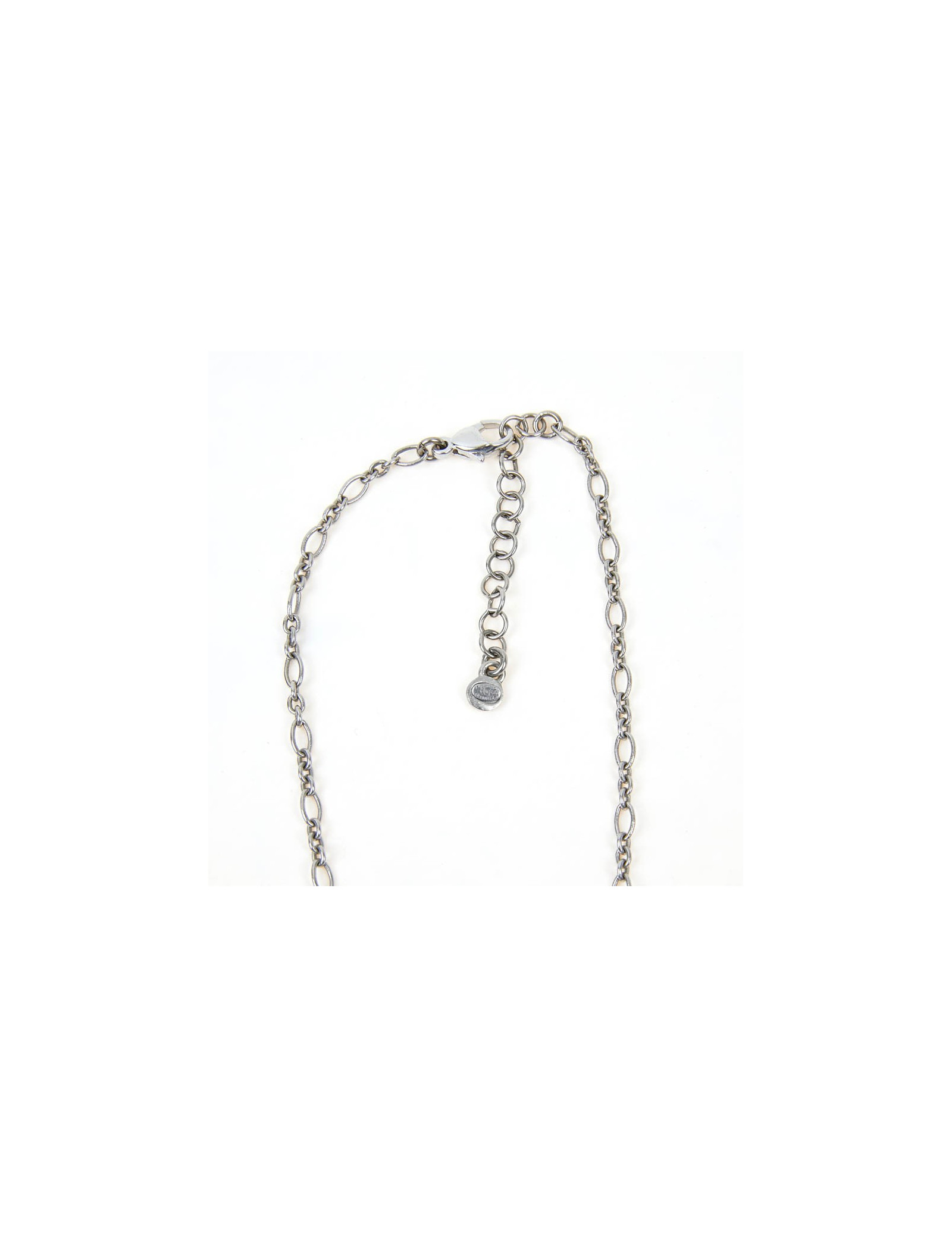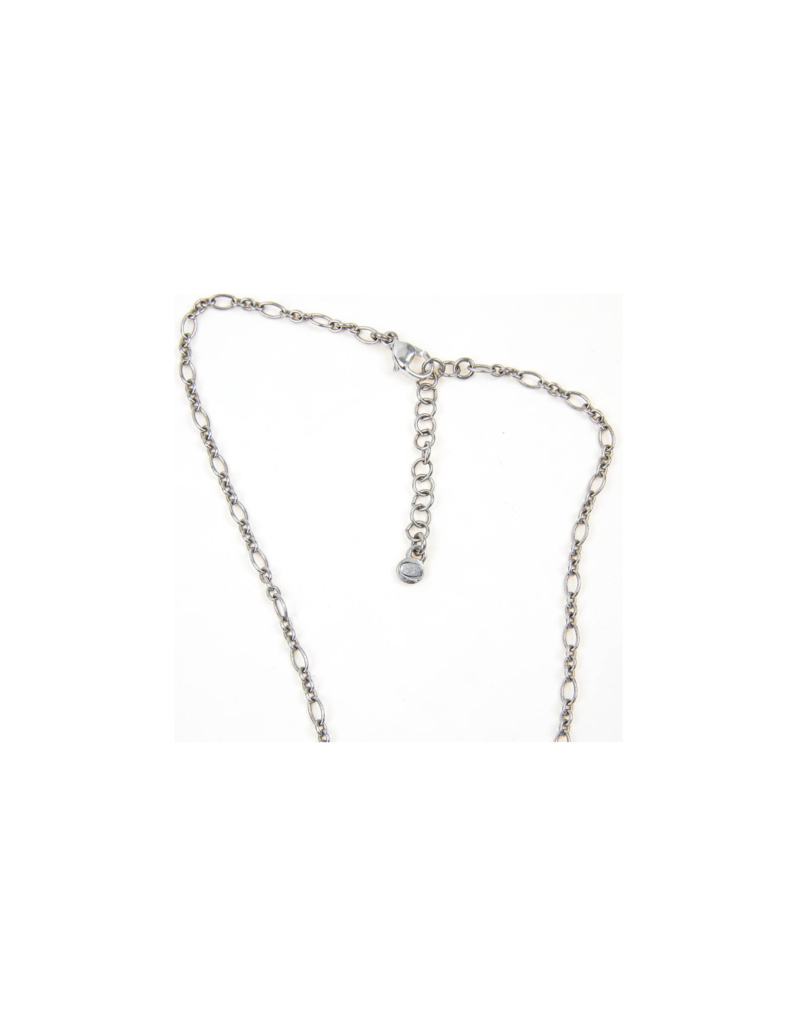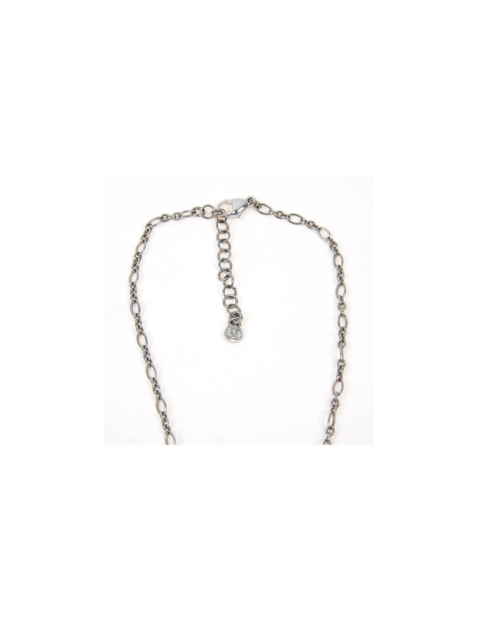Petit collier CC en métal couleur argenté avec son pendentif double face. Une face avec l'emblématique CC serti de strass. La deuxième face du médaillon est un jolie composition florale faite de rose, de marguerites, entourées de perles grises. Le coeur des fleurs est un petit strass pour plus de brillant. La longueur de la chaine à l'attache est de 44 cm. Il est en très bon état.