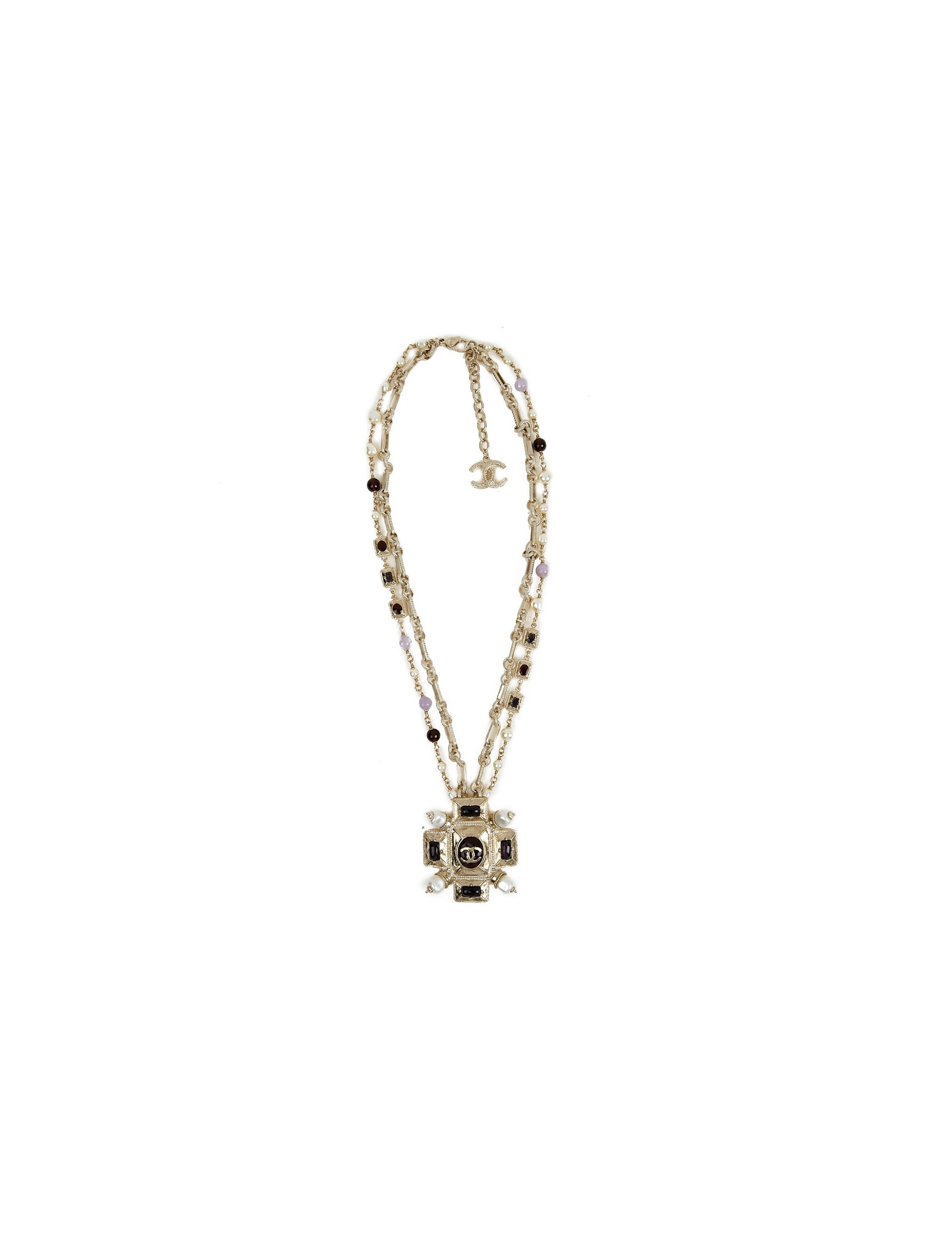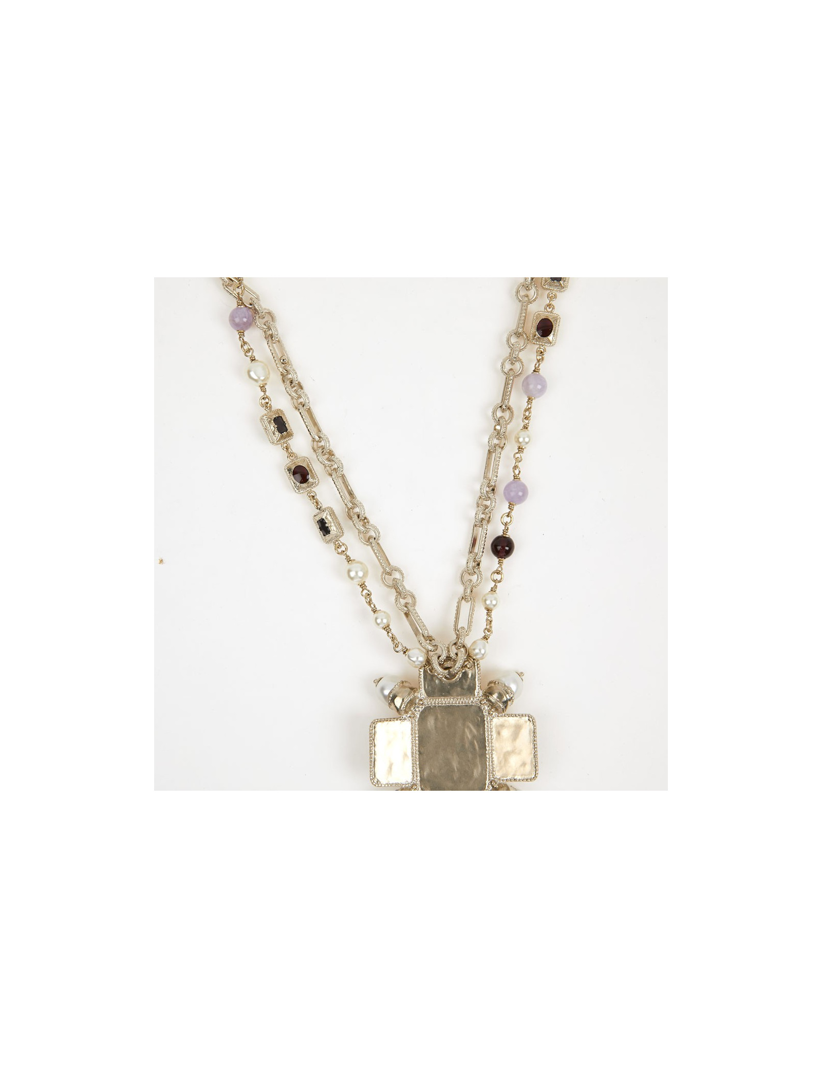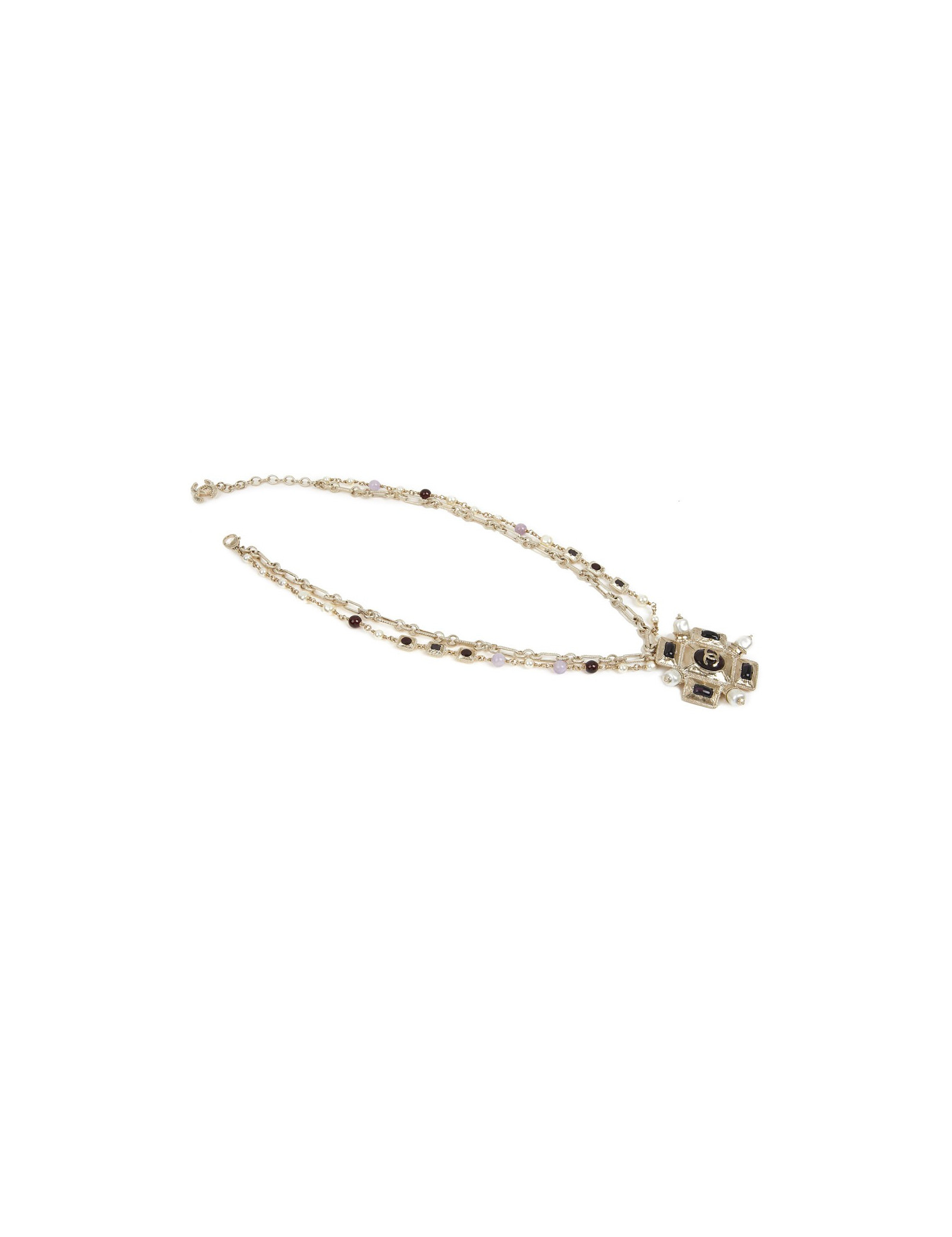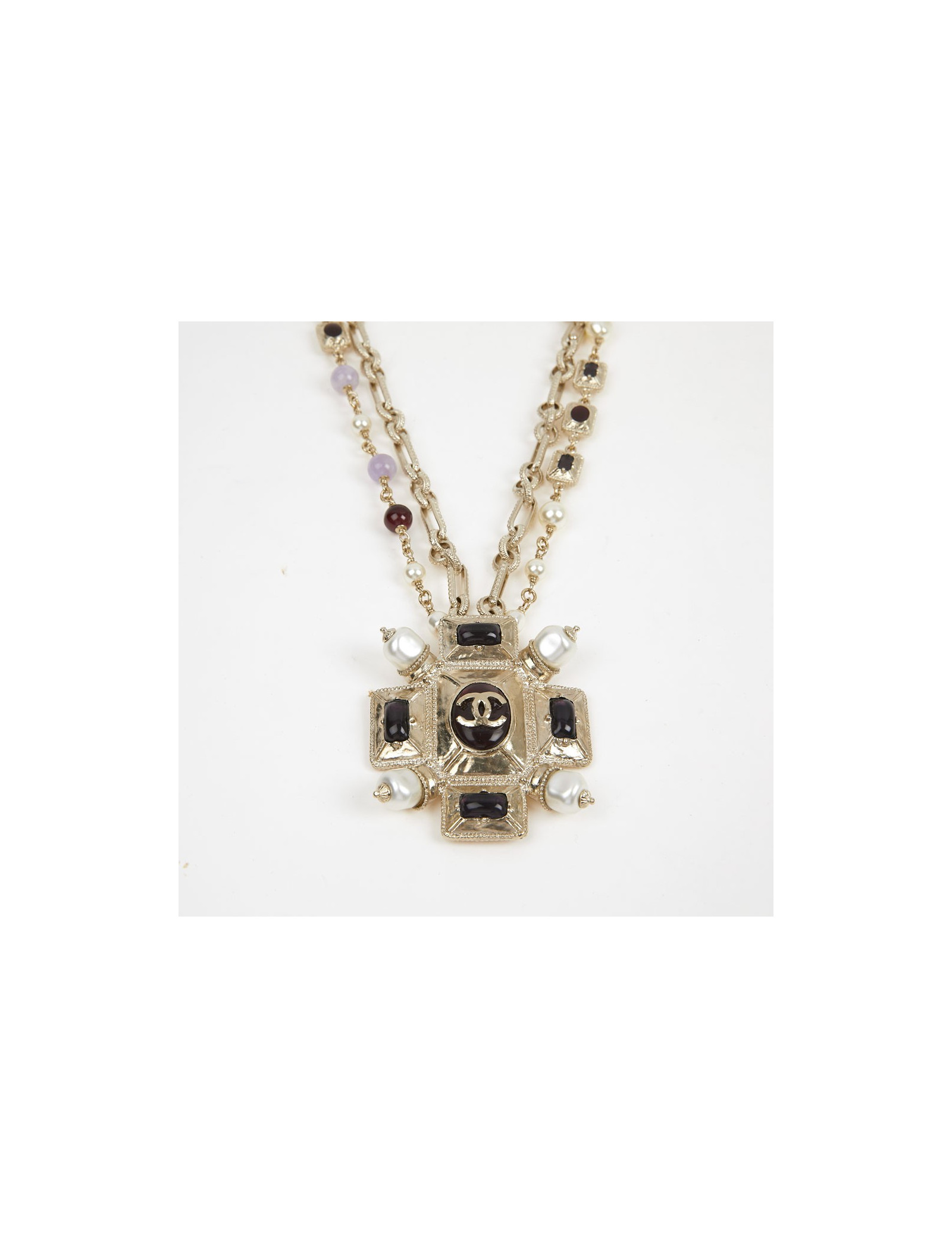 Ce joli collier de la Maison Chanel est doré or pâle. Le pendentif est une croix sertie de perles avec à son centre un CC. La chaine est doublée, la première est une succession de maillons entrelacés tandis que la deuxième de perles nacrées et pâtes de verre.