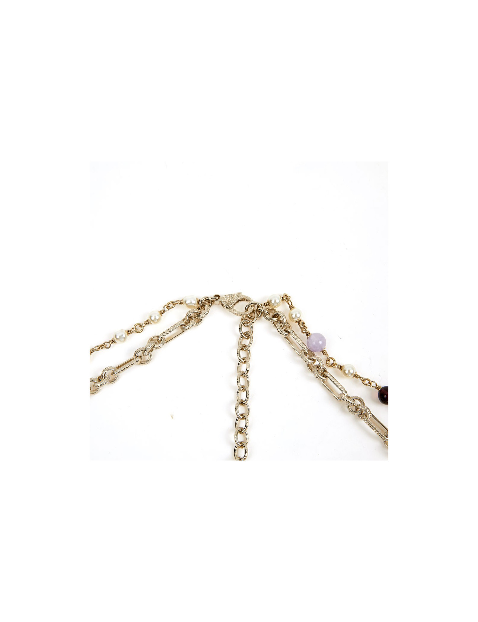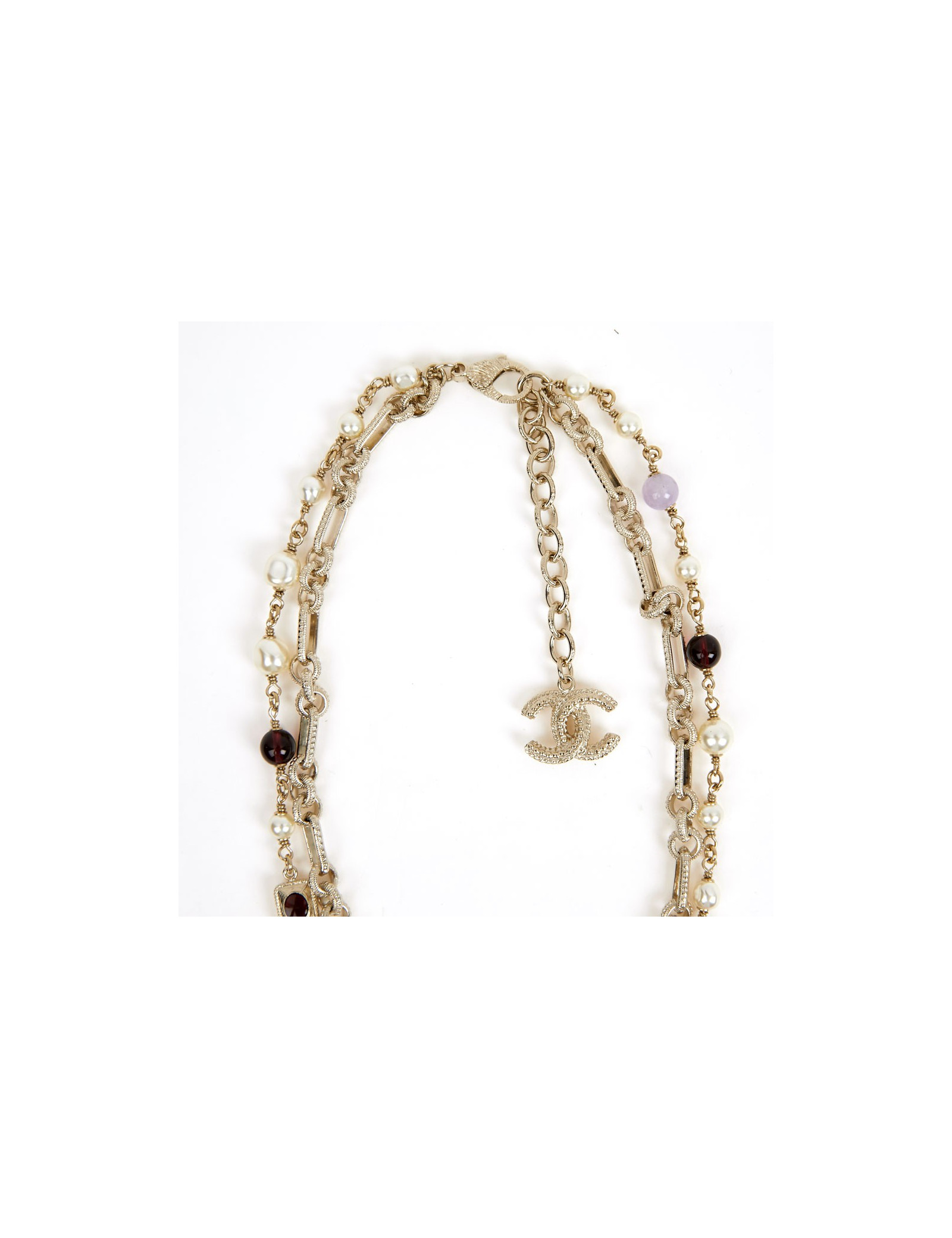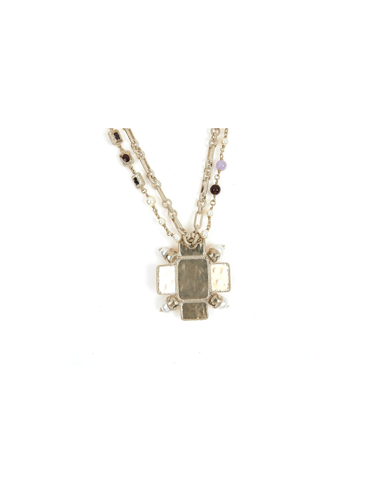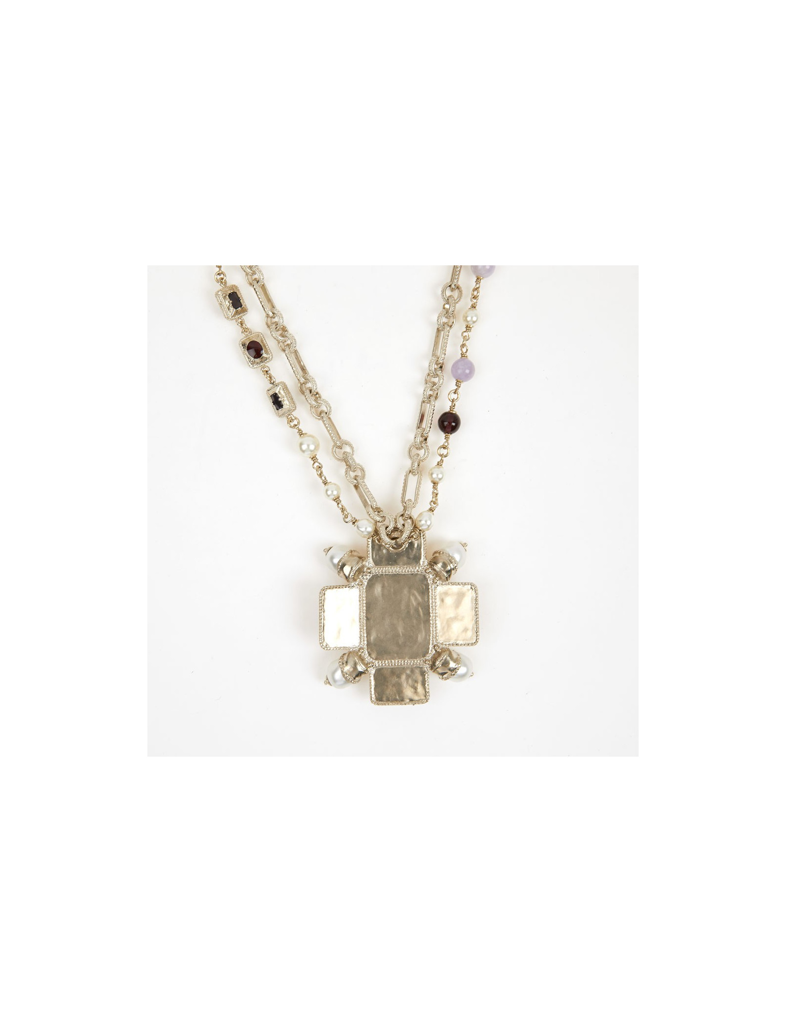 Ce joli collier de la Maison Chanel est doré or pâle. Le pendentif est une croix sertie de perles avec à son centre un CC. La chaine est doublée, la première est une succession de maillons entrelacés tandis que la deuxième de perles nacrées et pâtes de verre.