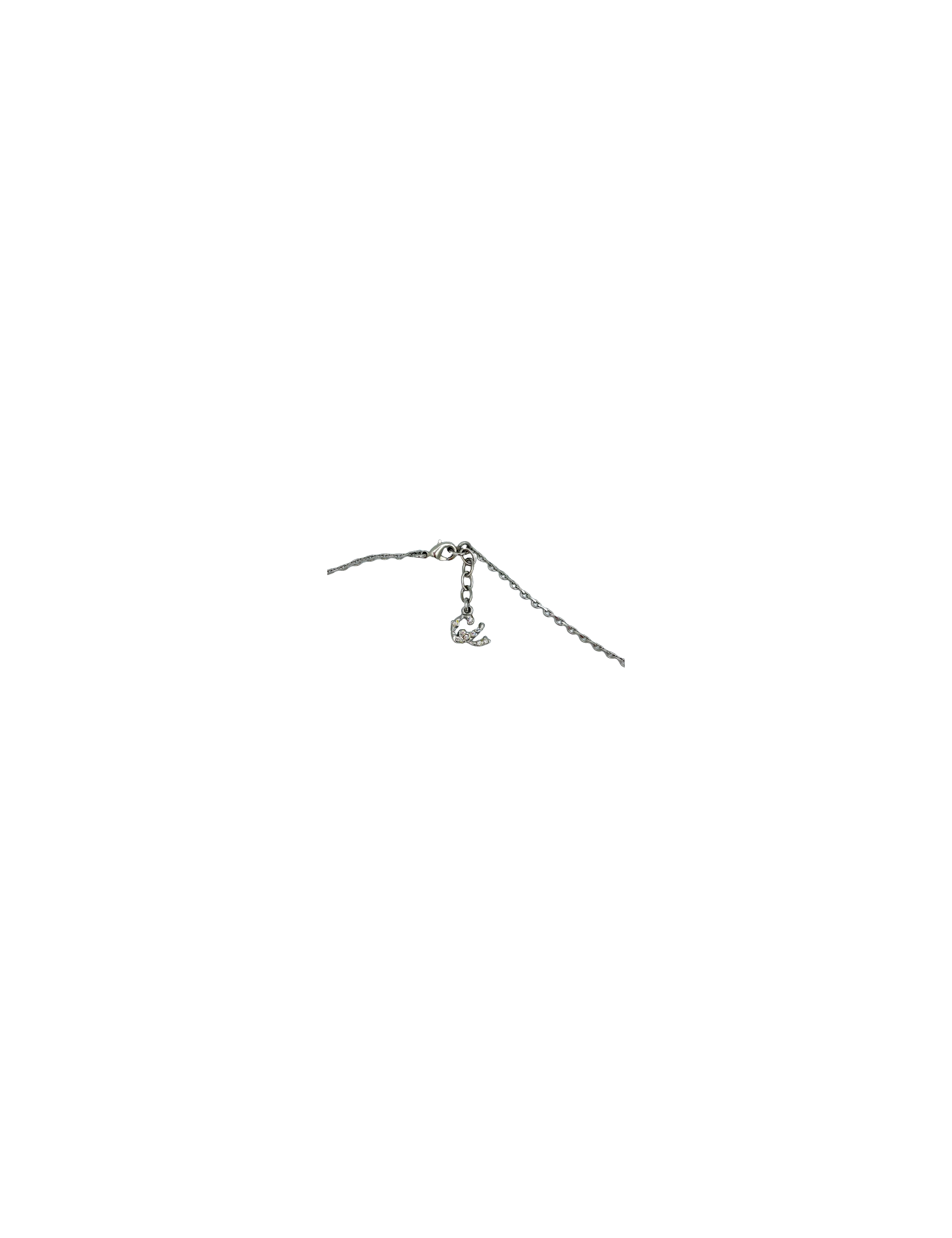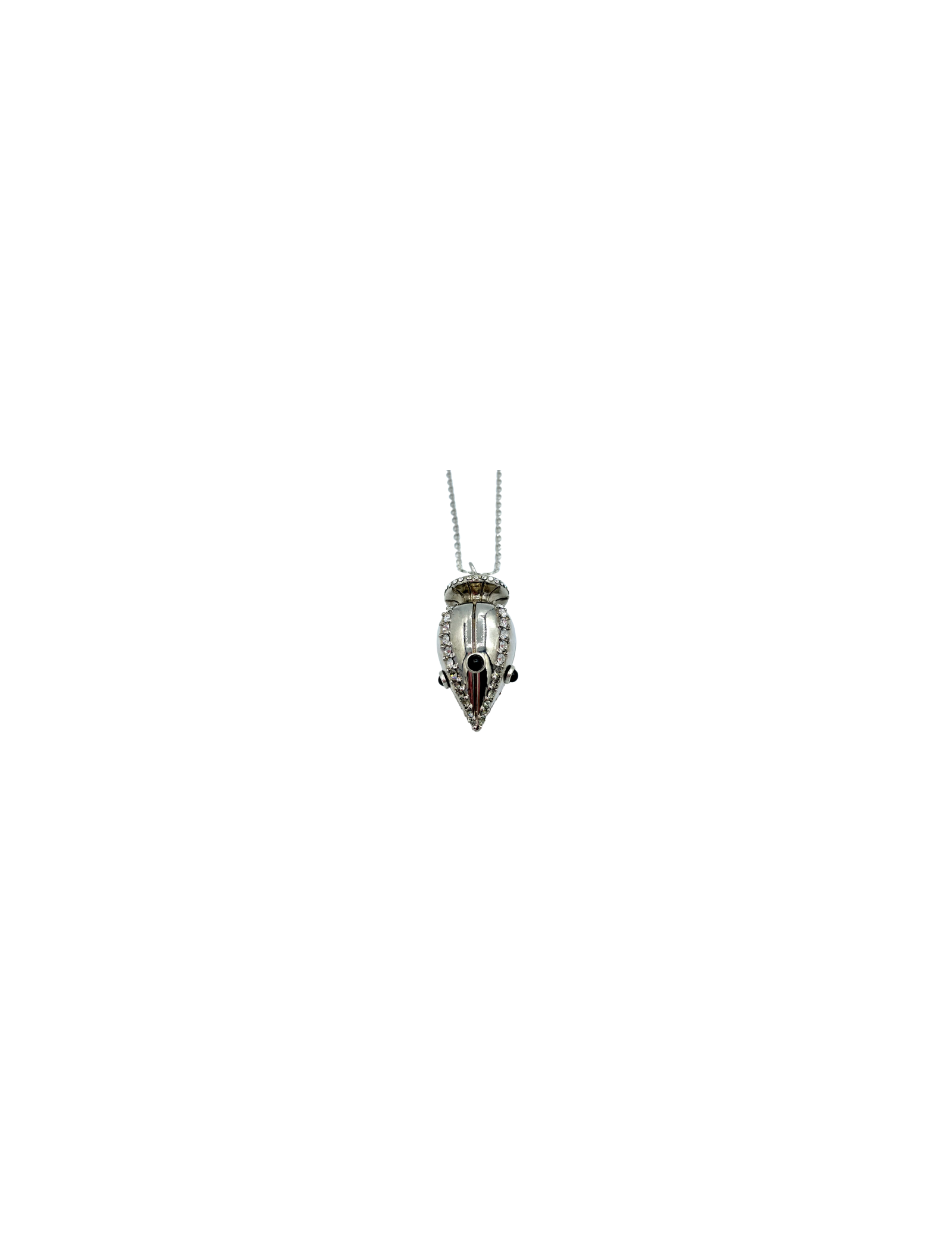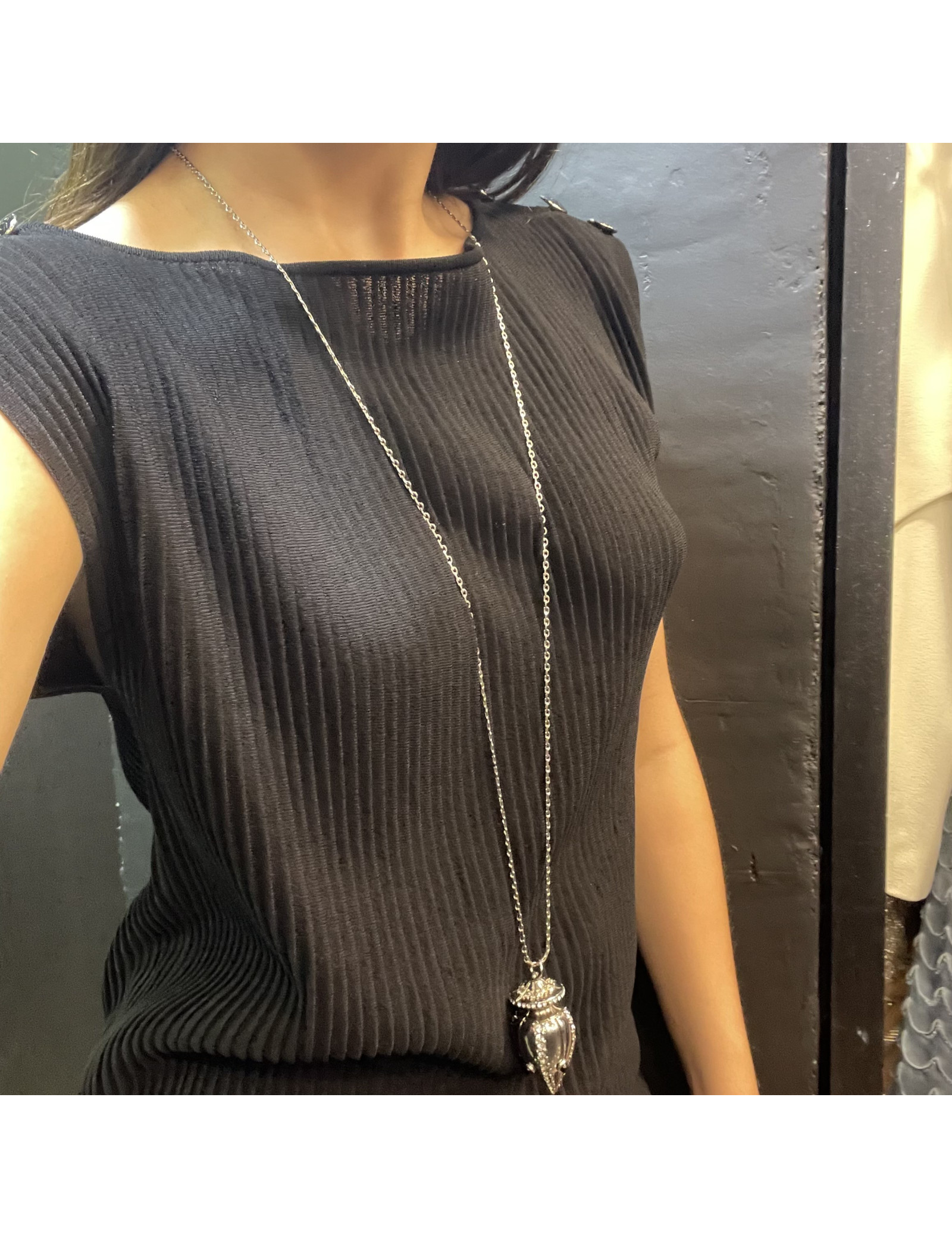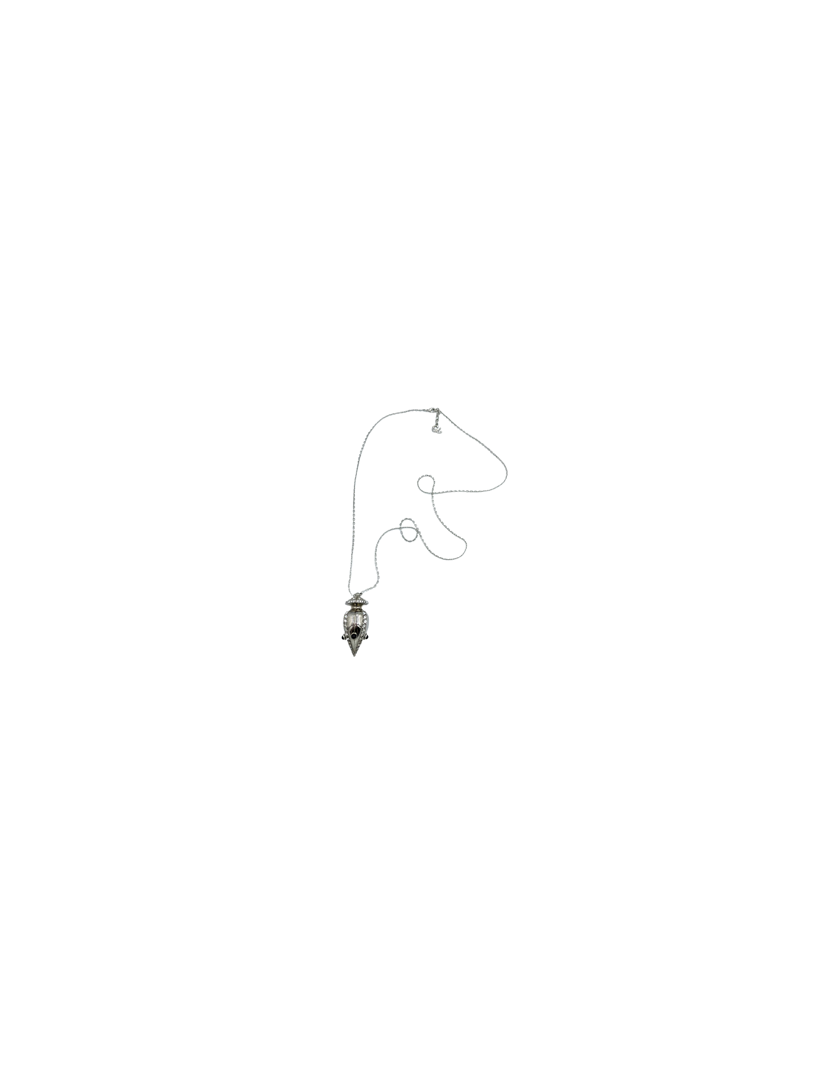 Pendentif Christian Lacroix en métal argent monté sur une longue chaine argent. L'amphore est serti de strass.