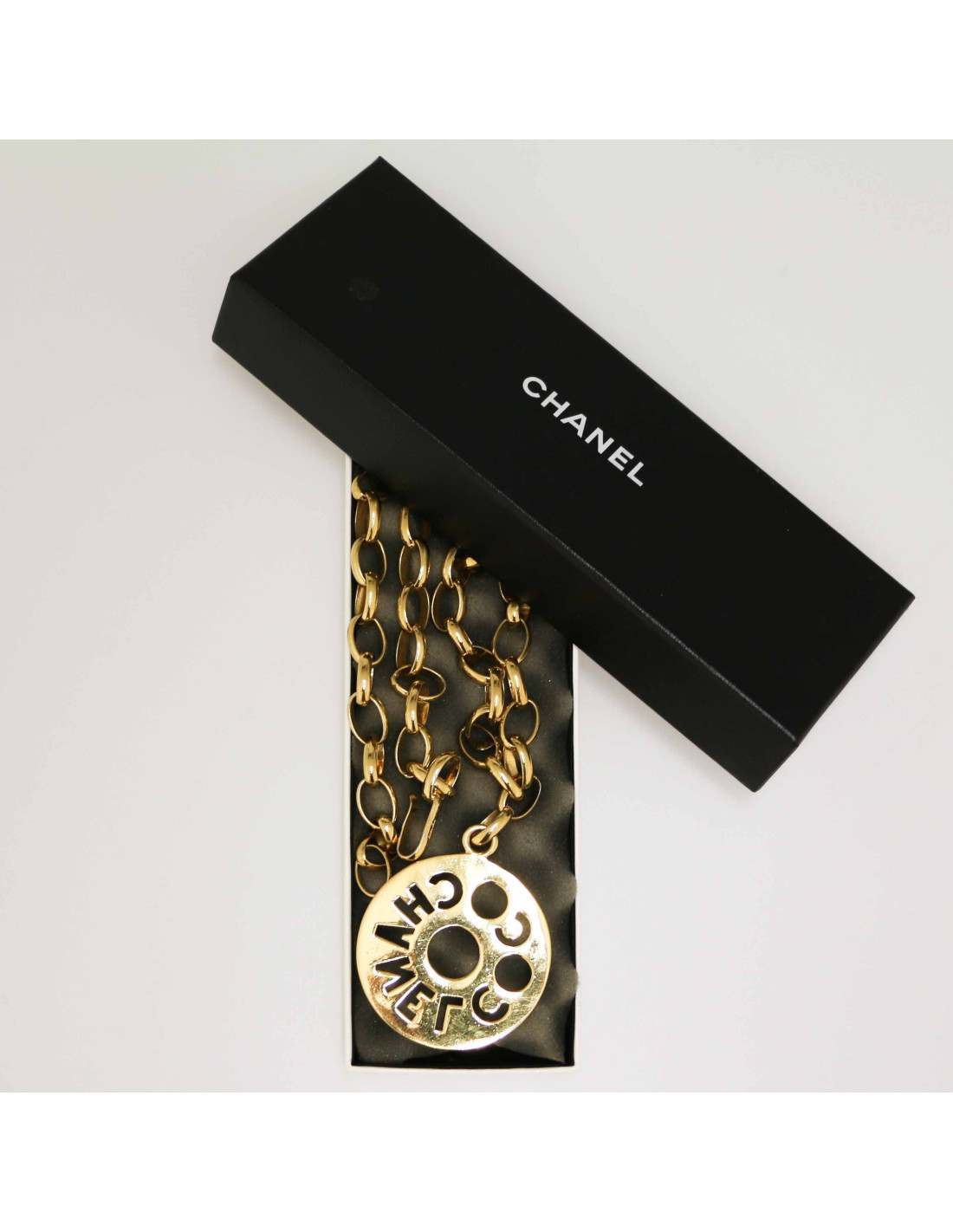 Détails : médaillon avec inscription COCO CHANEL, signature sur le fermoir