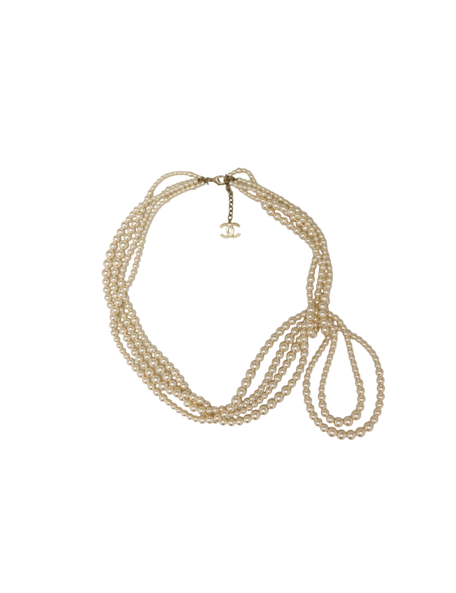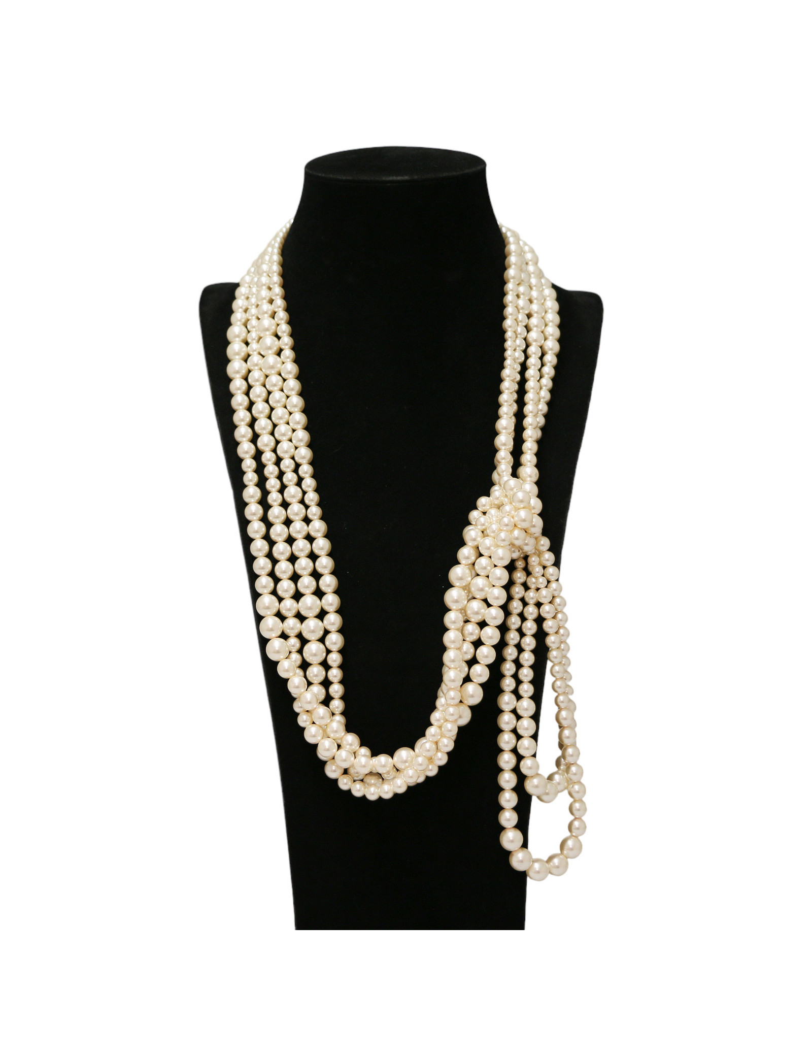 Détails : collier asymétrique composé de quatre rangs de perles, bijou CC sur le fermoir