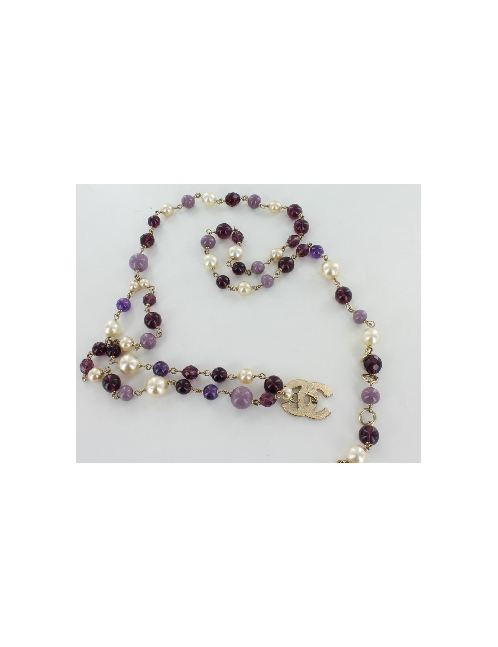 Ceinture sautoir CHANEL en perles violettes, mauves, et nacrées, monté sur métal doré à l'or fin. Les perles nacrées sont légèrement marquées. Elle a été peu portée.