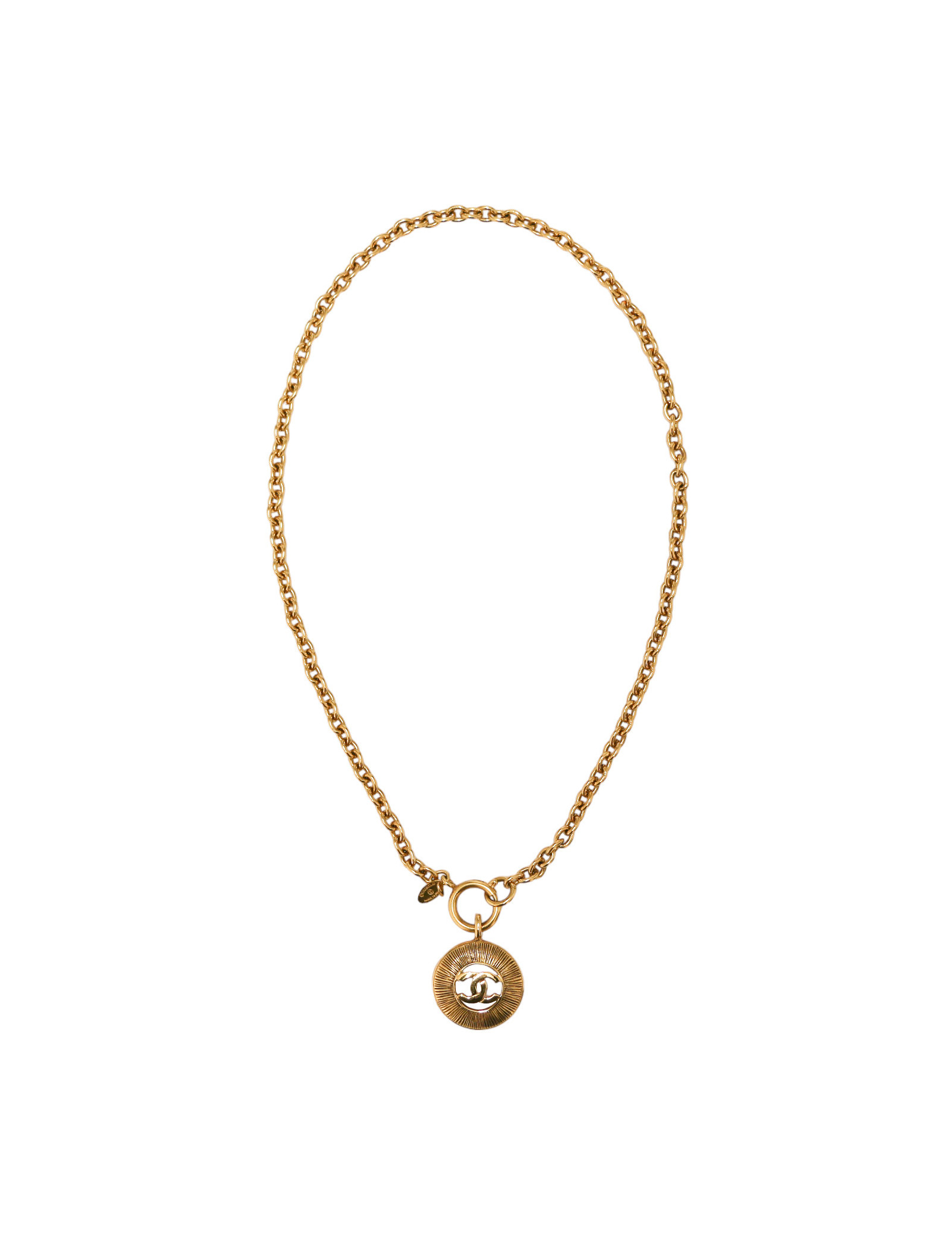 Détails : collier vintage avec son pendentif strié rond avec au centre un CC.