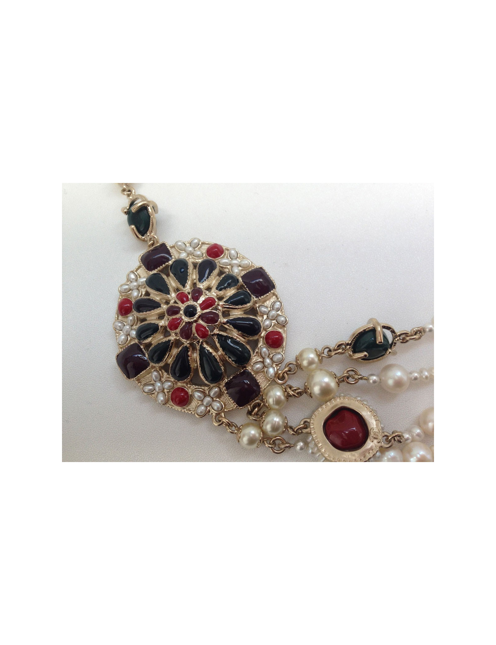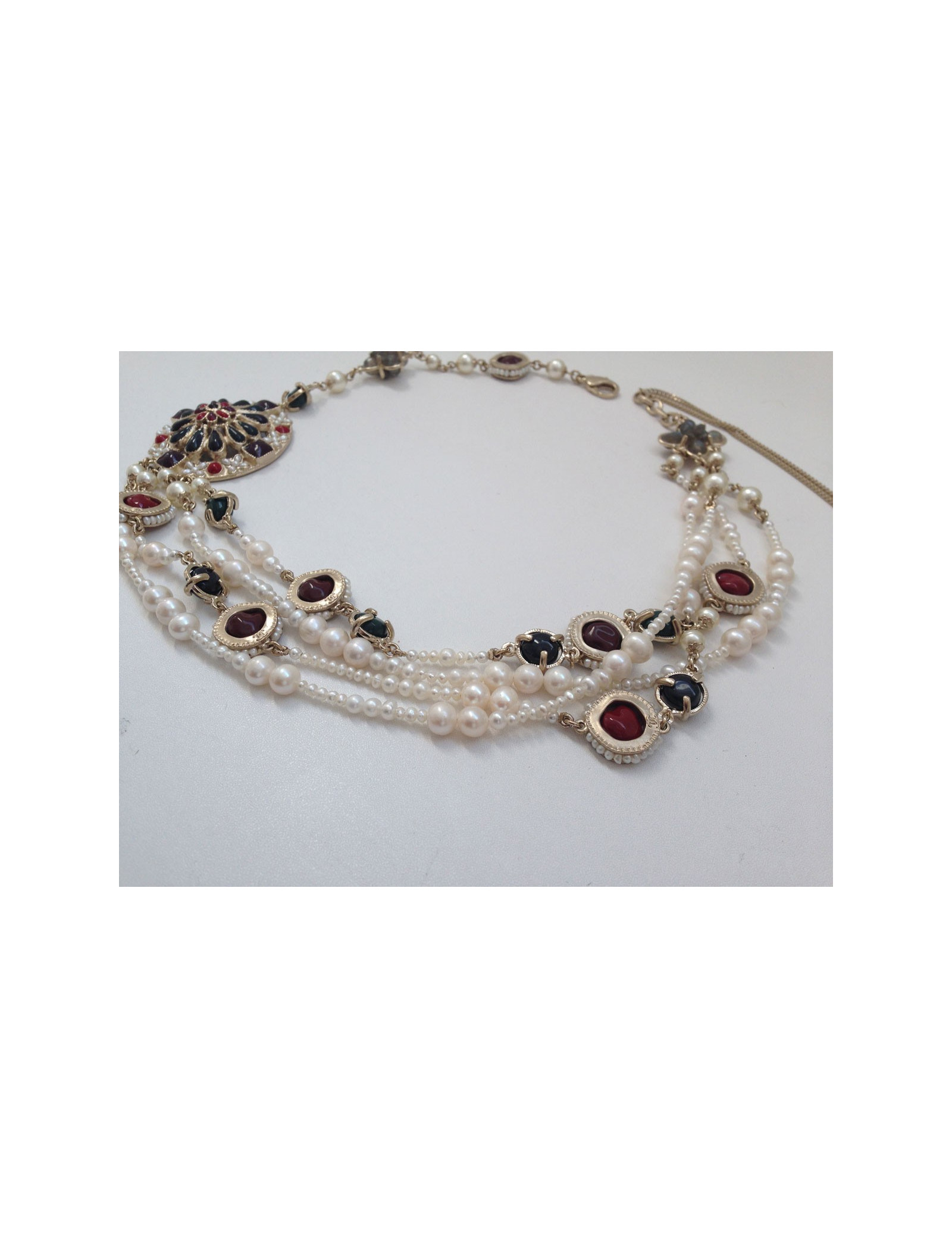 Collier quadruple rangs Chanel, composé de deux rangs de perles nacrées et de deux rangs de bijoux en pâte de verre (rouge, bordeaux, noir et vert) cerclés de métal doré à l'or fin et de perles nacrées. Deux jolis trèfles en quartz fumés réhaussent chaque extrémités de ce collier.