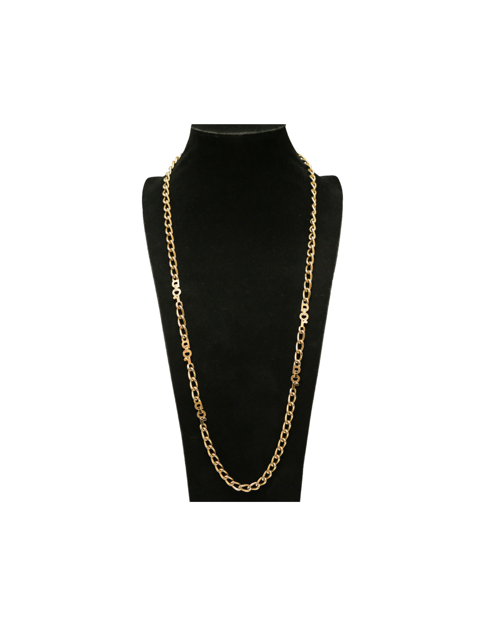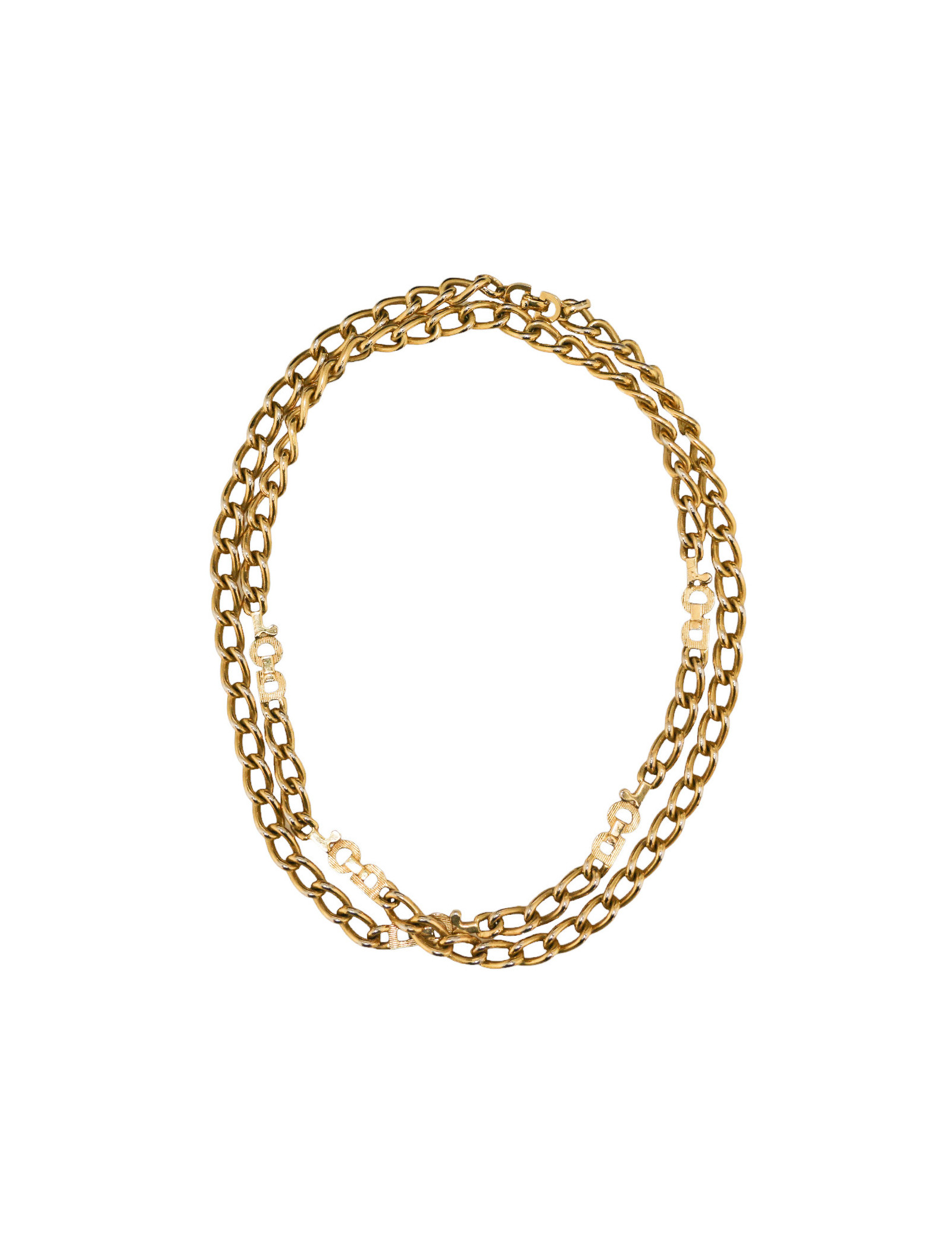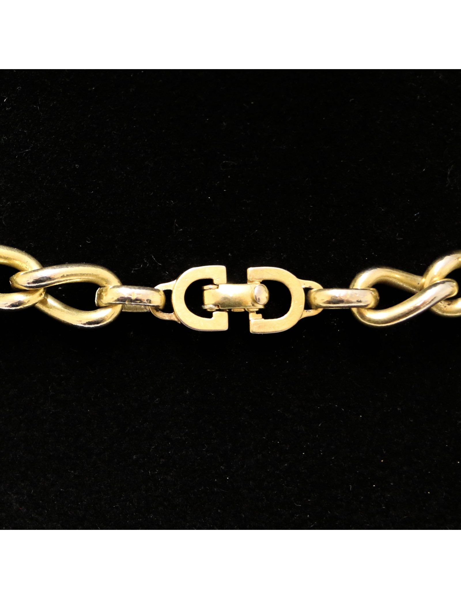 Détails : chaîne constituée de maillons dorés et lettres DIOR. Le métal est un peu décoloré par endroit, c'est peu visible quand le collier est porté.