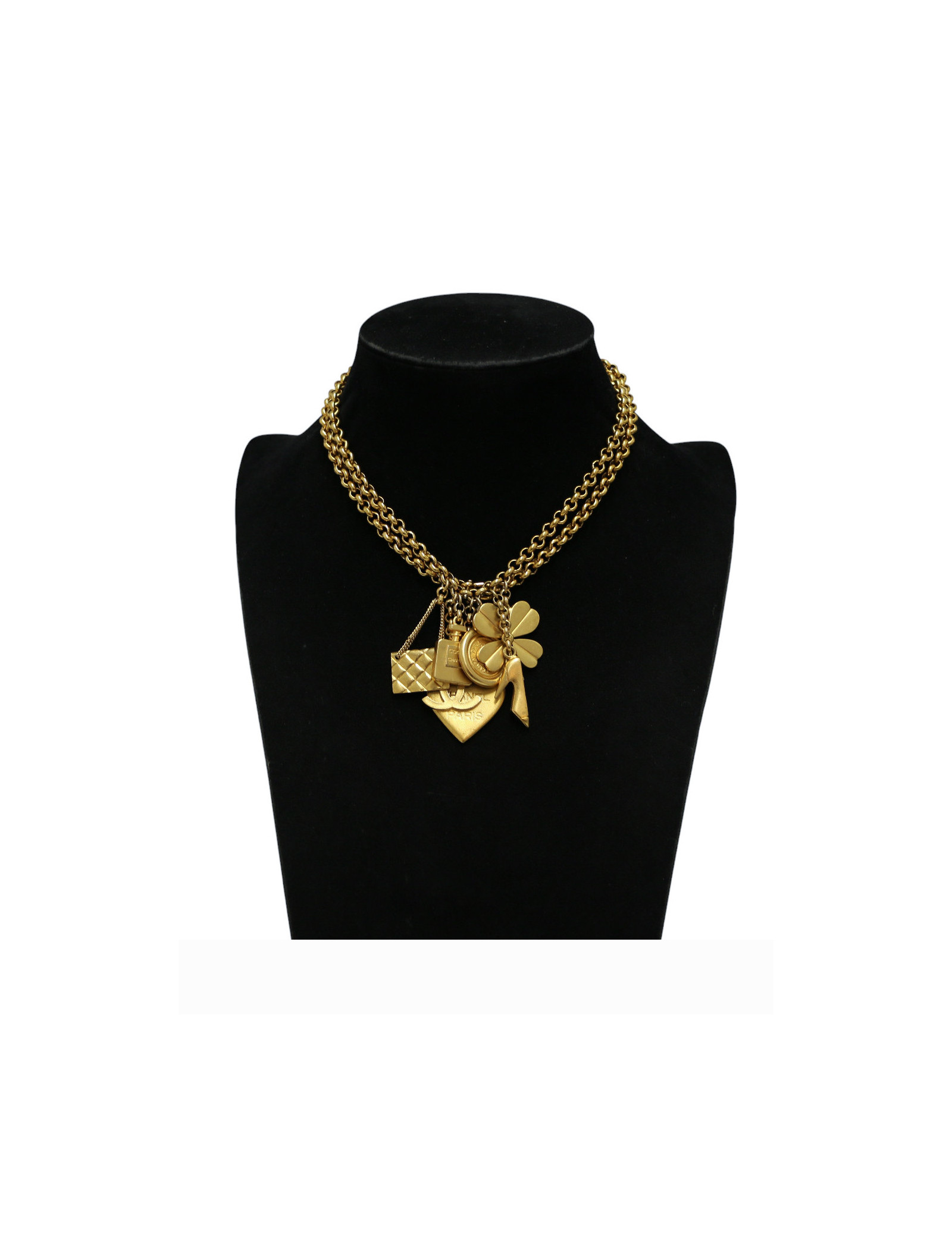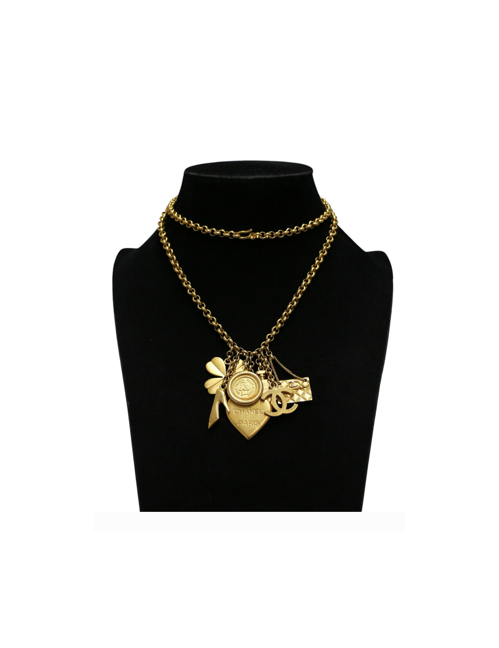 Détails : long collier vintage orné de tous les charms de la Maison de couture : le célèbre CC que l'on reconnaitrait parmi tous, le sac matelassé modèle emblématique de chez Chanel, la bouteille de parfum et l'escarpin bicolore imaginé par Gabrielle Chanel. Le médaillon rond double face gravé CC et 31 rue Cambon Paris l'adresse mythique de la Maison Française. Un coeur, autre symbole fort que la créatrice de la marque aimait intégrer également à ses collections, ainsi que le trèfle à 4 feuilles symbole porte bonheur qui lui était également cher. Aucune usure, fermeture par un crochet, possibilité de le porter long ou de doubler la chaine autour du cou.
