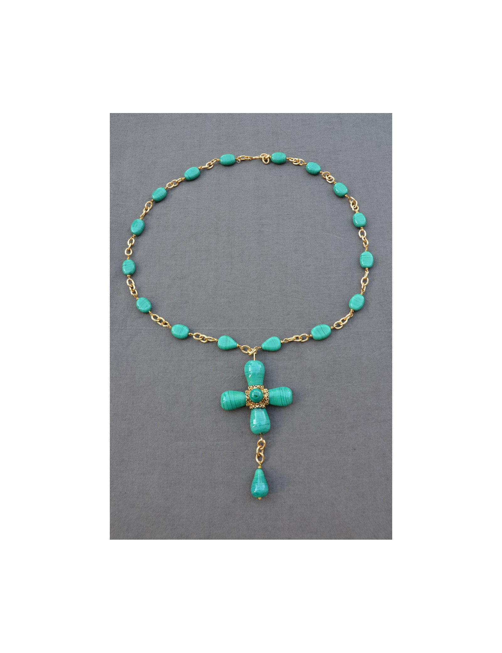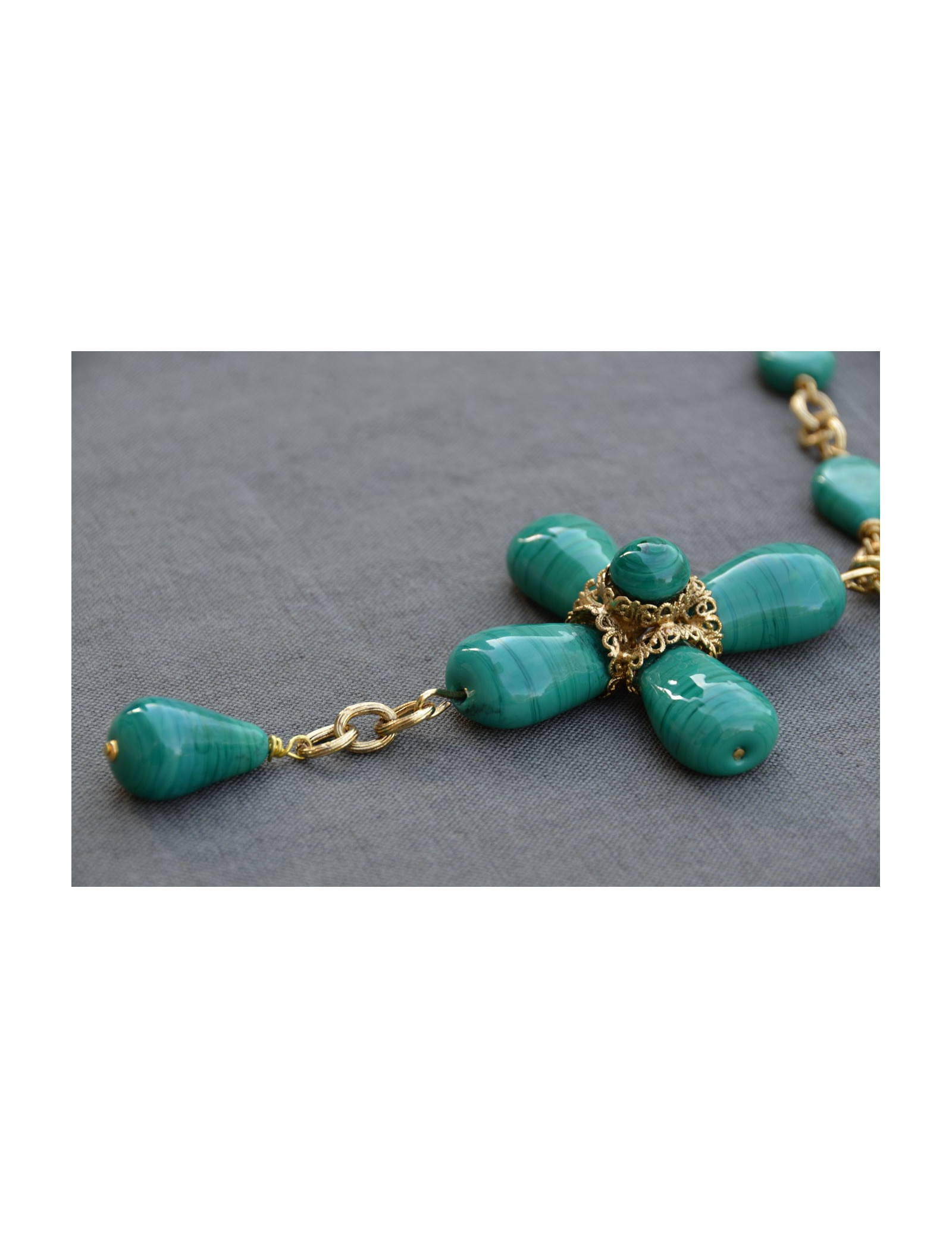 Sautoir Croix Marguerite de Valois en pâte de verre vert jade et métal doré à l'or fin.