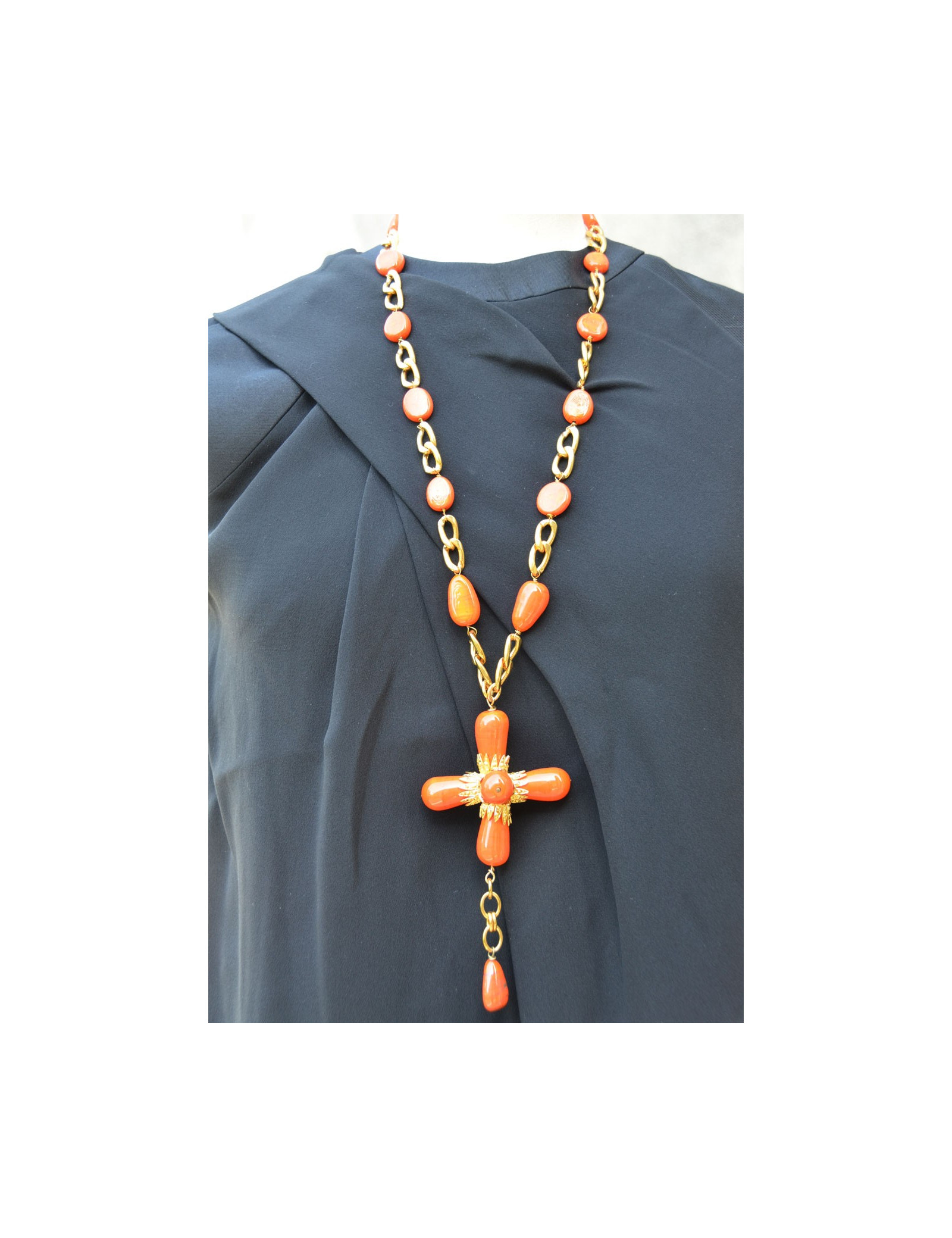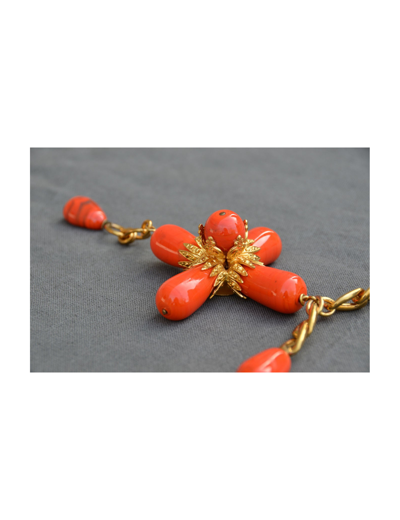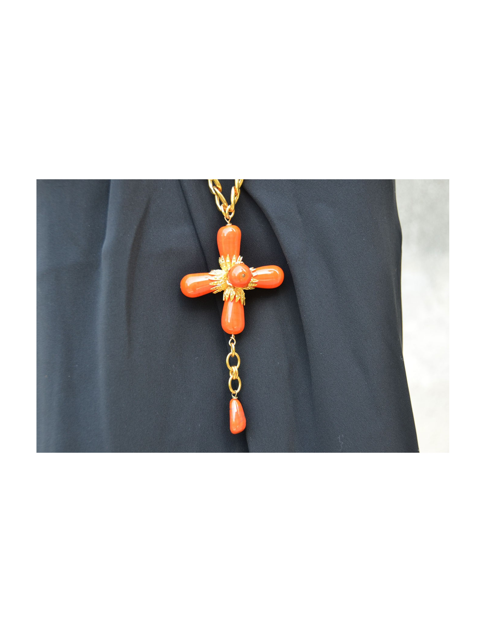 Sautoir Croix Marguerite de Valois en pâte de verre corail et métal doré à l'or fin.