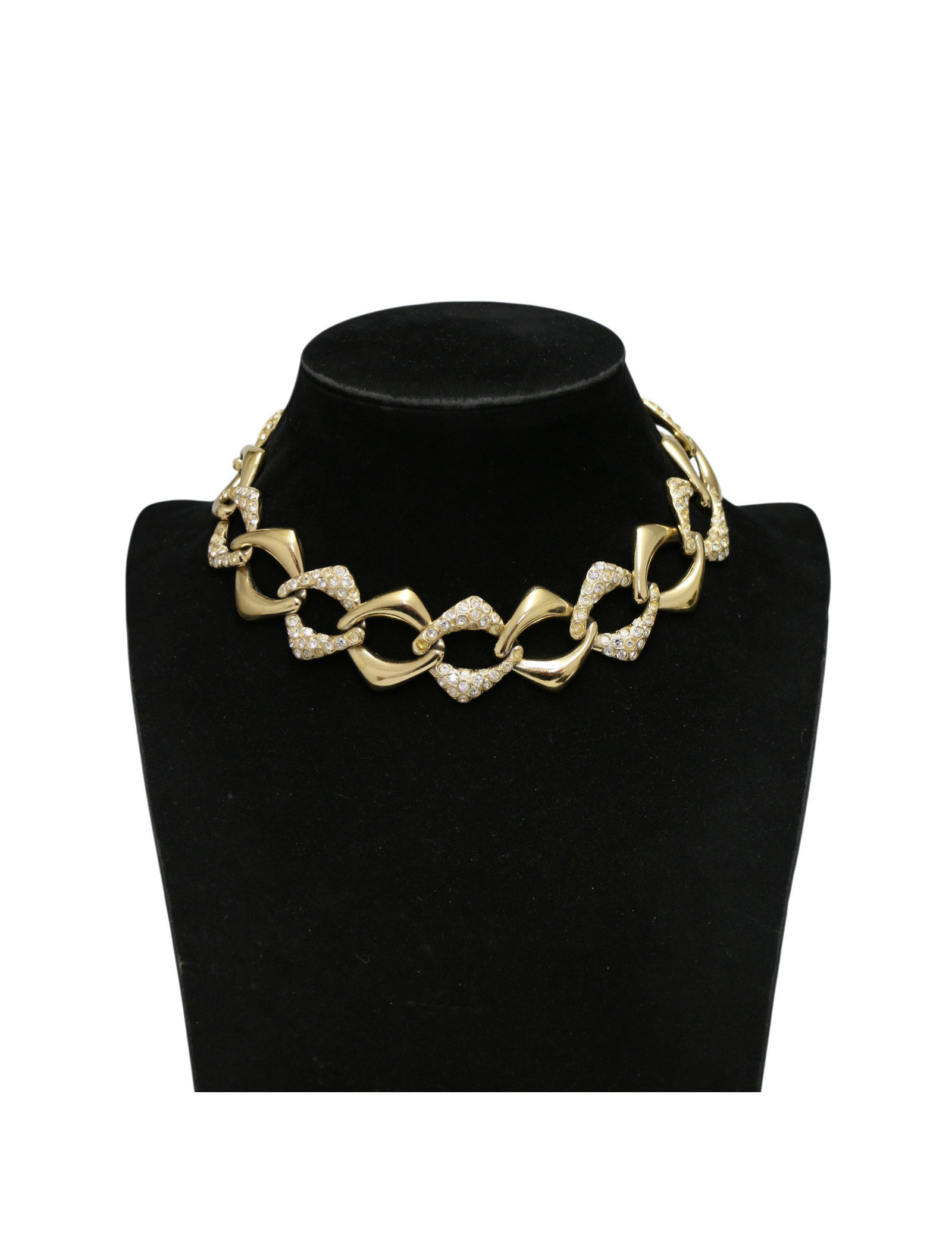 Sublime collier ras de cou vintage Yves Saint Laurent Doré et Strass. Véritable emblème de l'héritage d'YSL, ce collier audacieux se compose de maillons articulés en laiton doré, chacun minutieusement orné de strass.