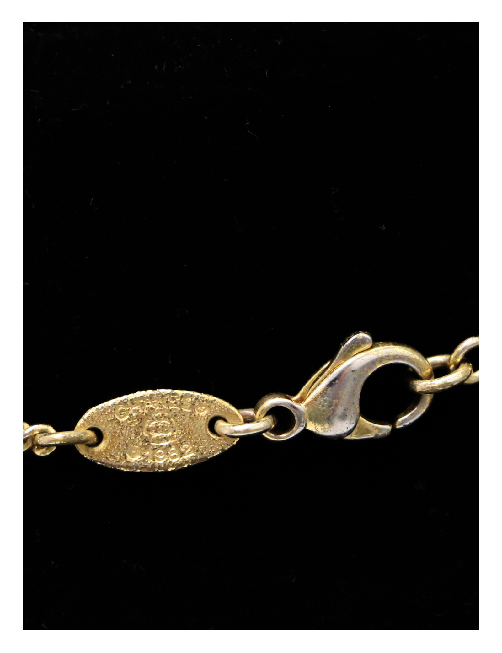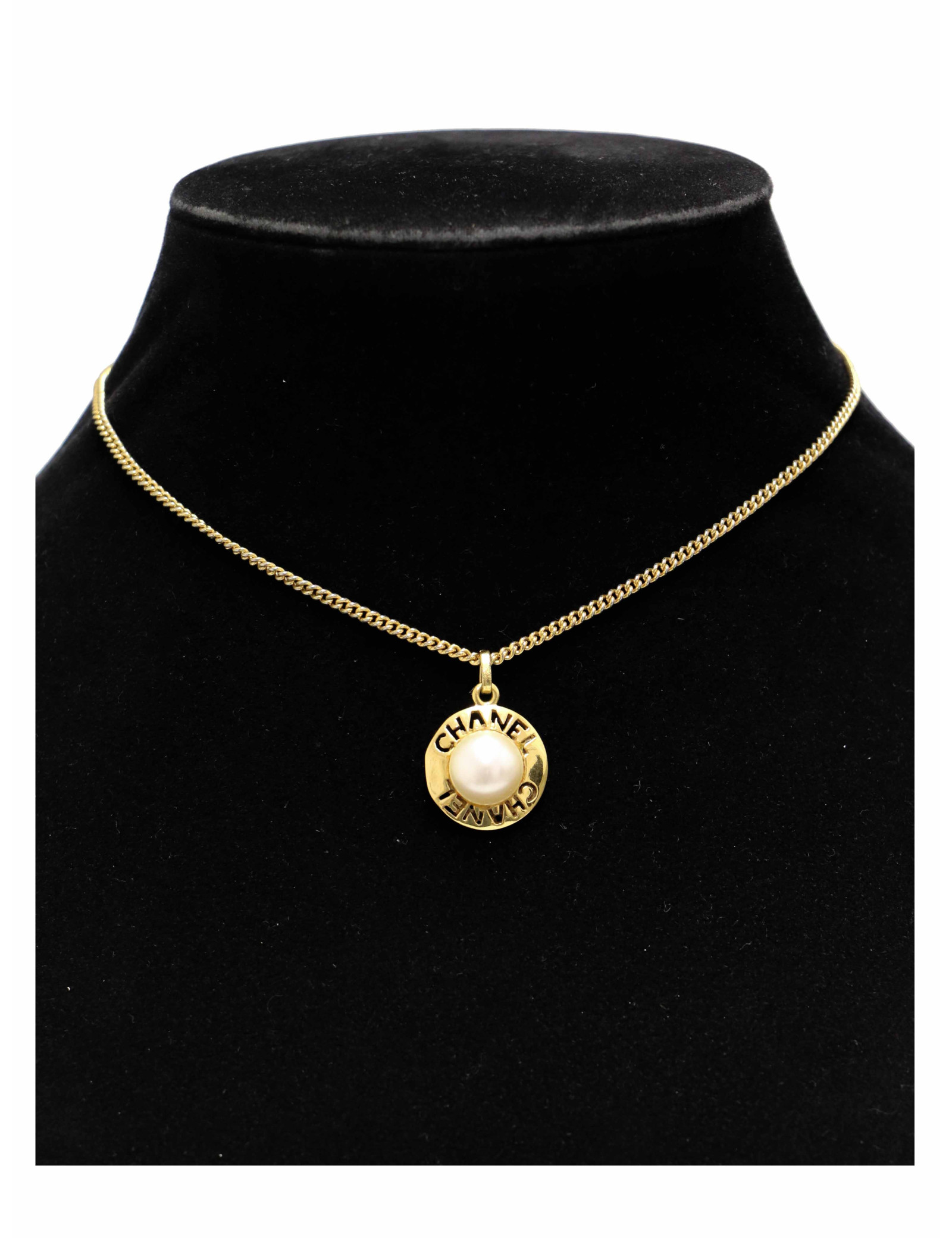 Détails : collier court avec pendentif rond signé CHANEL et perle nacrée en résine au centre.