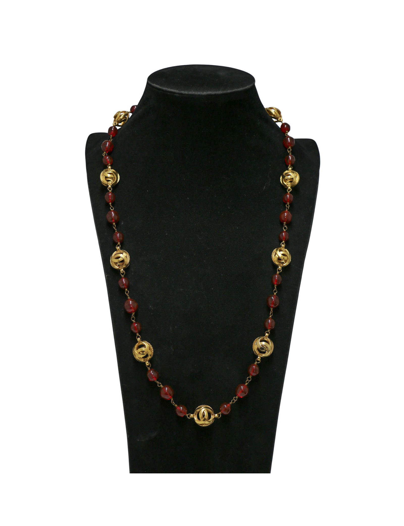 Détails : sautoir composé de perles en pâte de verre rouge rubis et de petits logo CC ronds dorés.