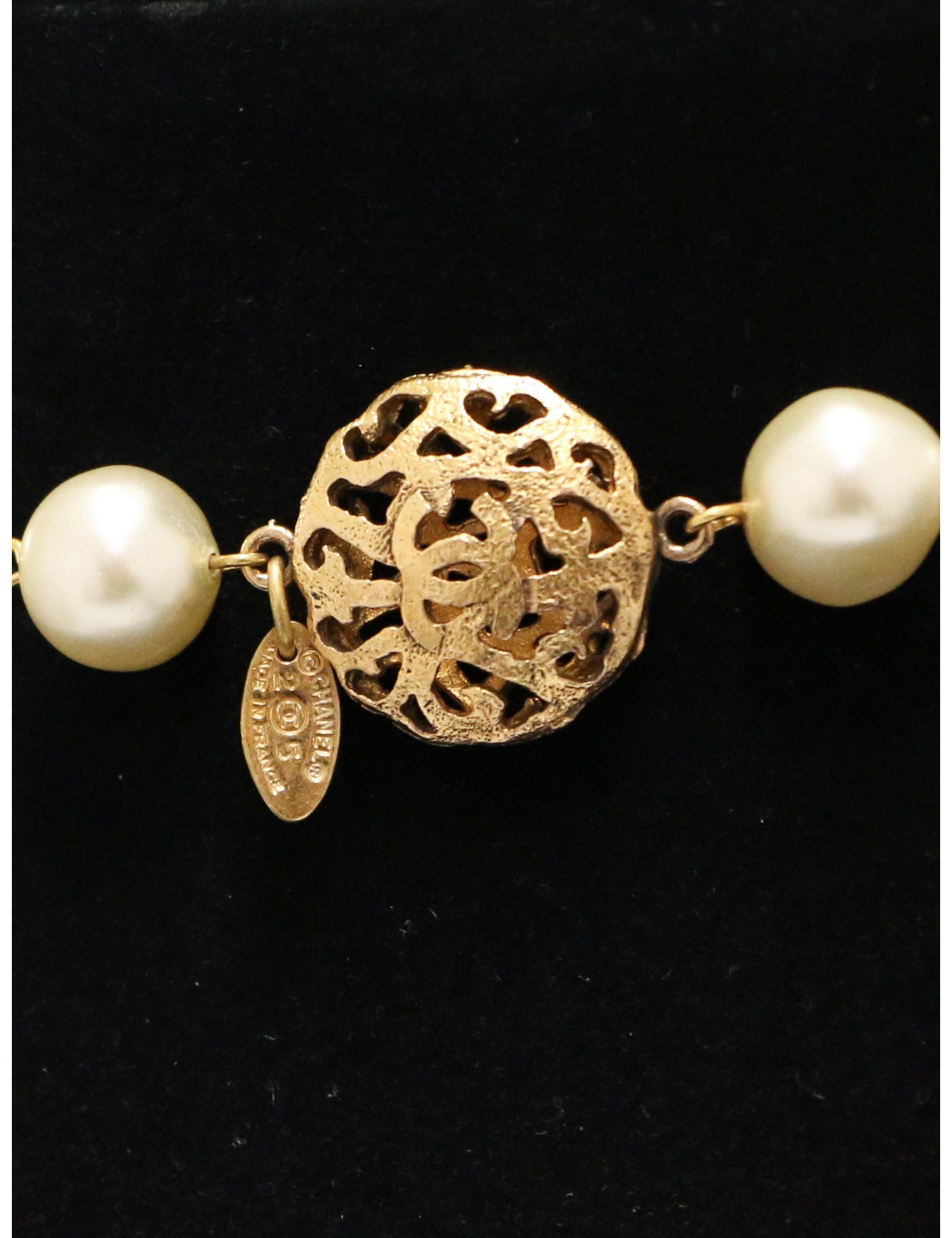 Nouveau Vendu COLLIERS - SAUTOIRS Collier Chanel médaillon et perles CHANEL 42168 1 250,00 € Collier Chanel médaillon vintage Condition : très bon étatPays de fabrication : FranceMatière : métal, pâte de verreCouleur : nacre, doréDimensions : longueur totale : 43 cm , médaillon CC : 4.5 x 5 cmStamp : ouiPériode : 1990-1992Bijouterie : métal doréDétails : magnifique collier Chanel vintage en perles en pâte de verre avec au centre du médaillon un... Voir