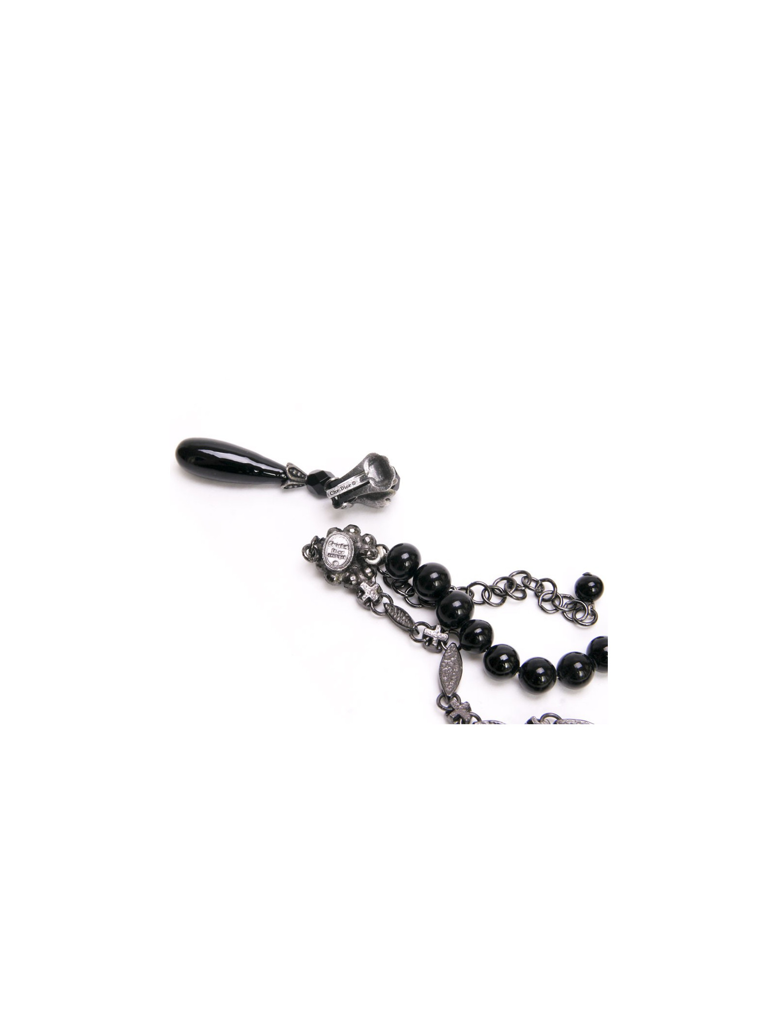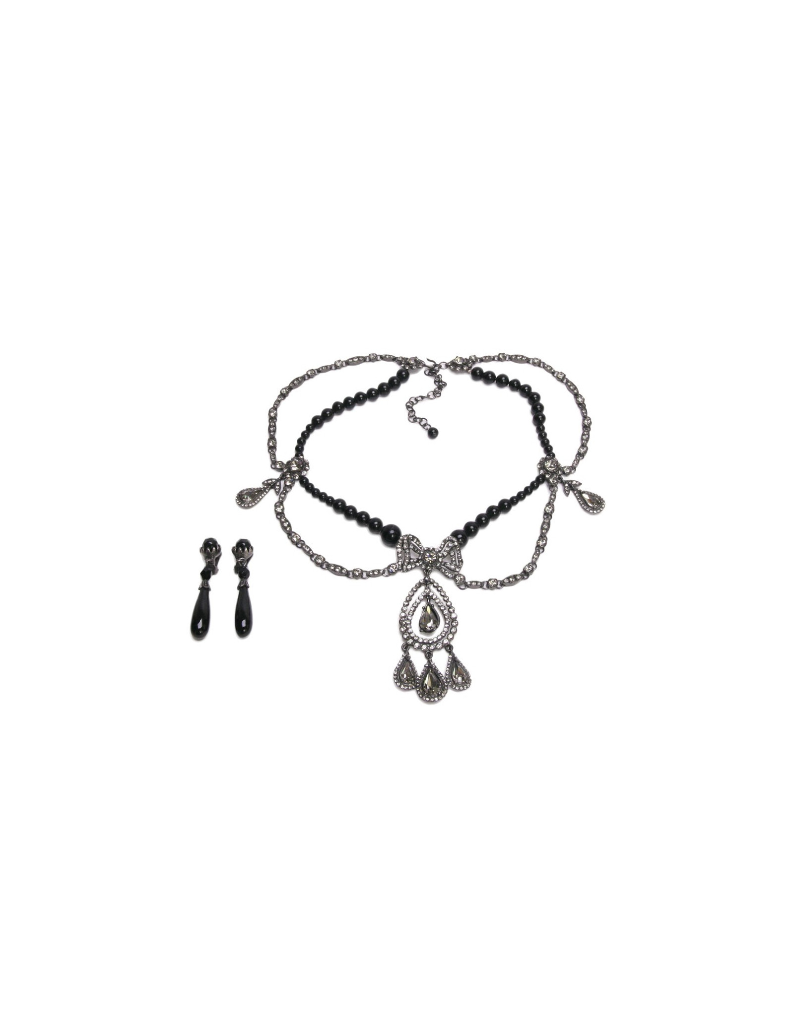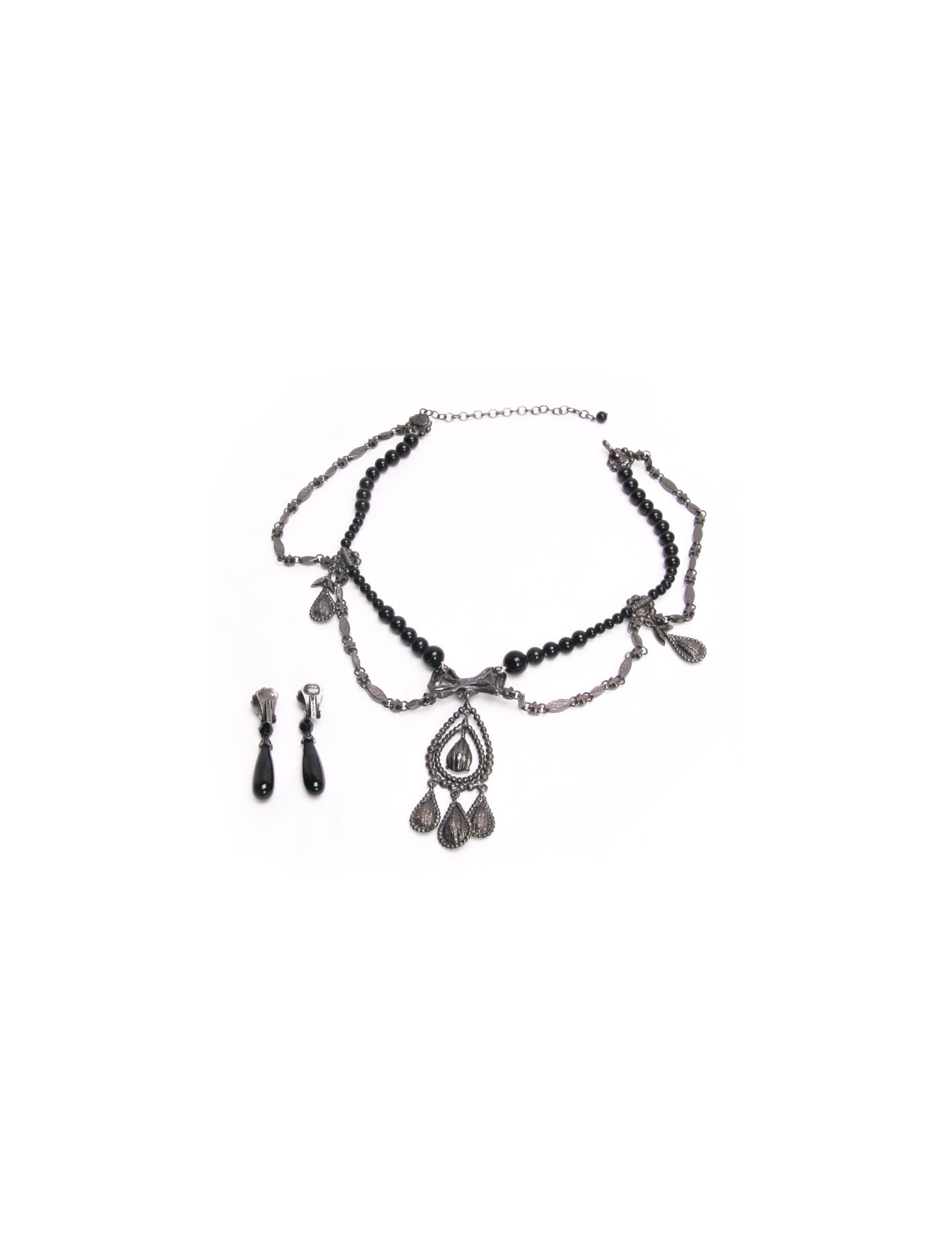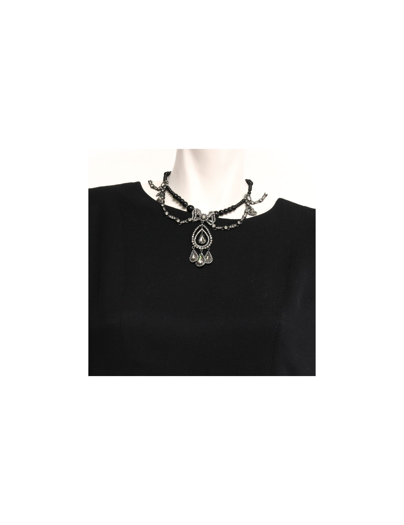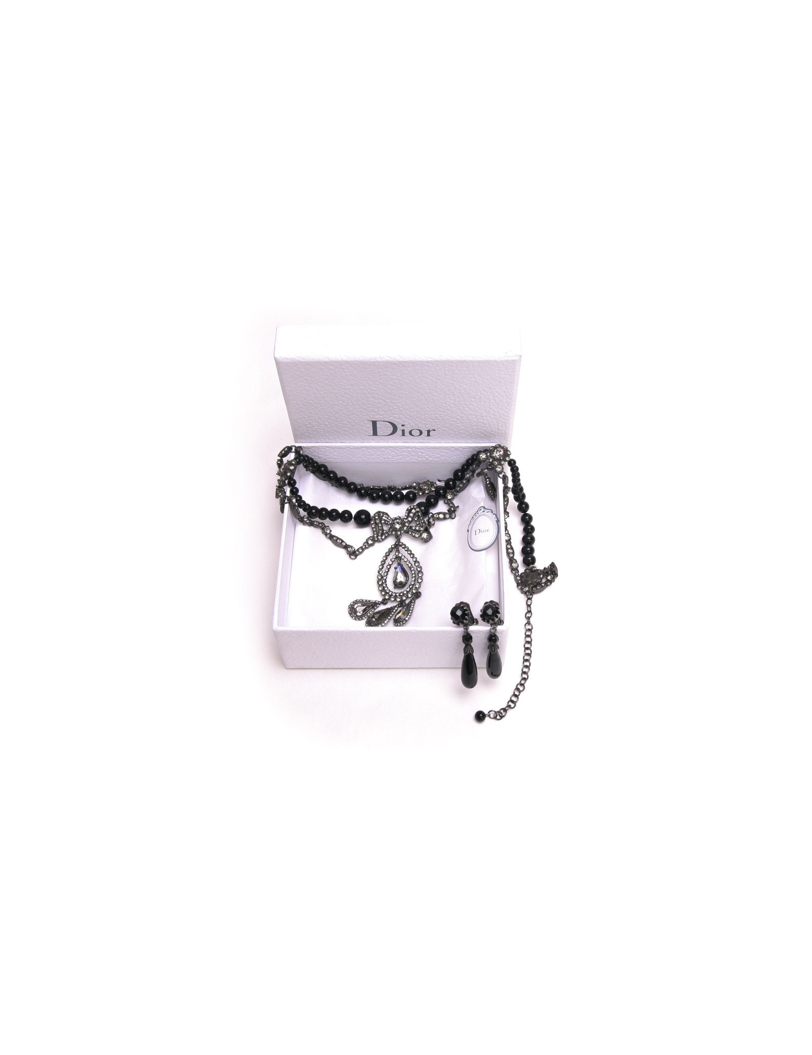 Ravissant collier Christian Dior, style Empire, perles noires en chute, noeud en strass gris et strass (gris) taillées en poire. Les clips d'oreille sont en perles noires facettées et perles lisses noires en poire.