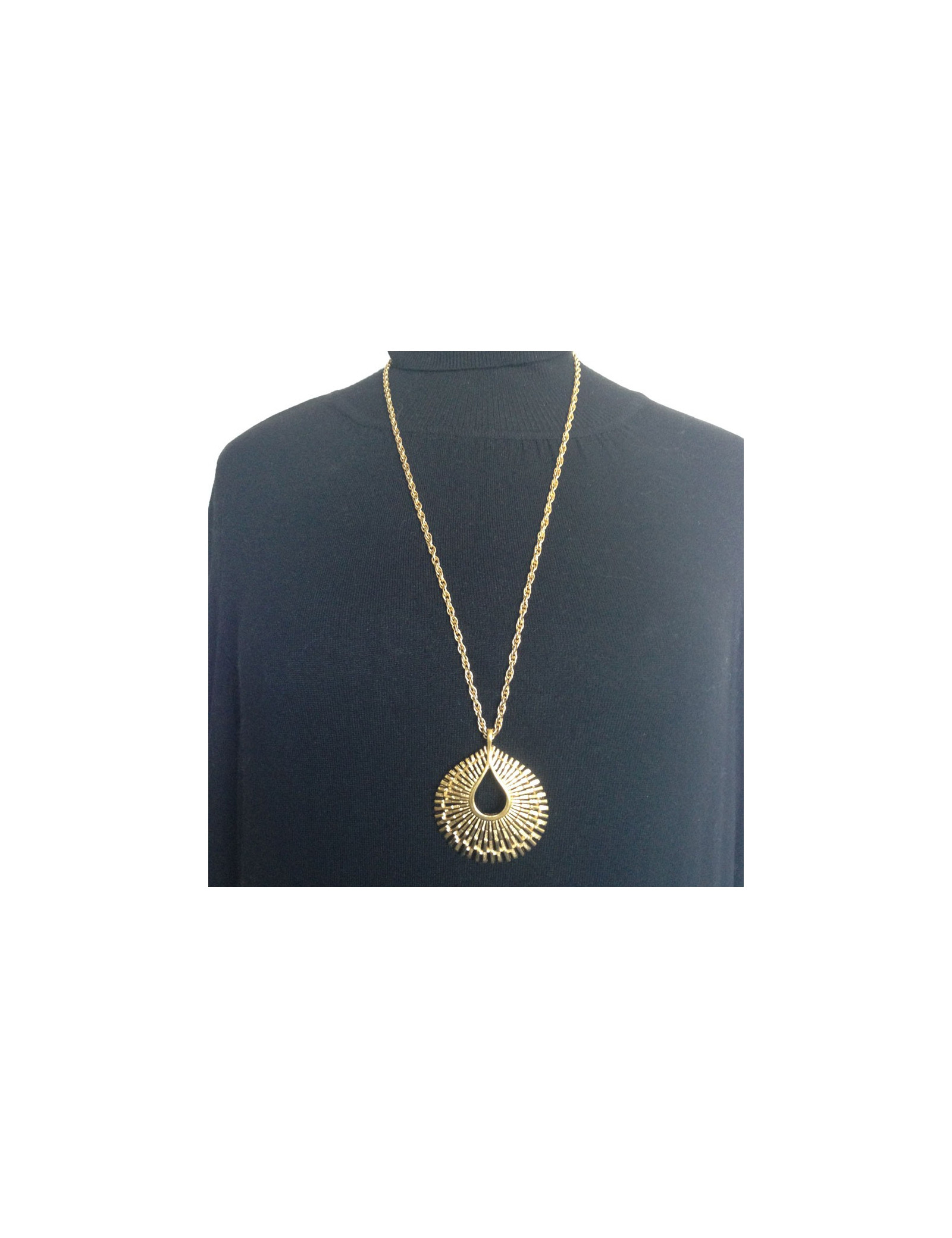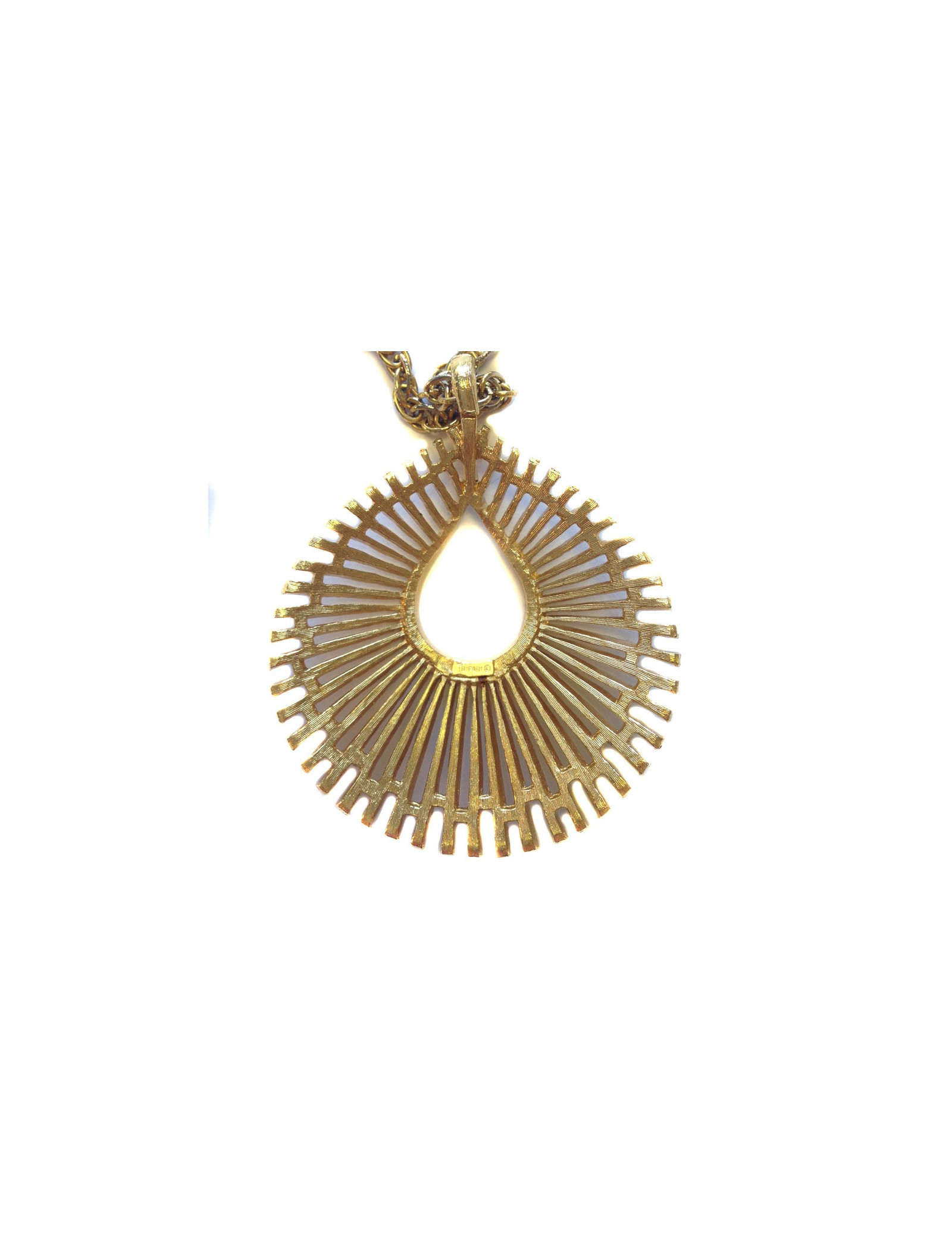 Elégant collier TRIFARI (couronne sur le T), chaîne en métal doré et pendentif en métal doré texturé et lisse. Sautoir vintage en très bon état.